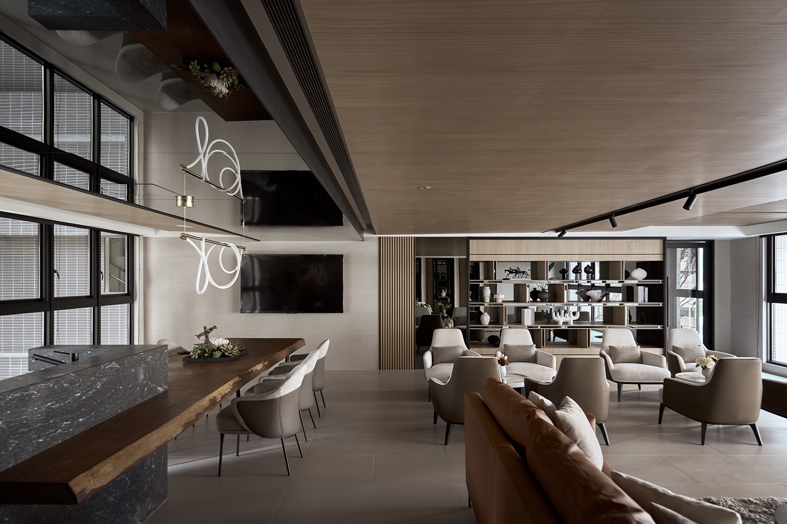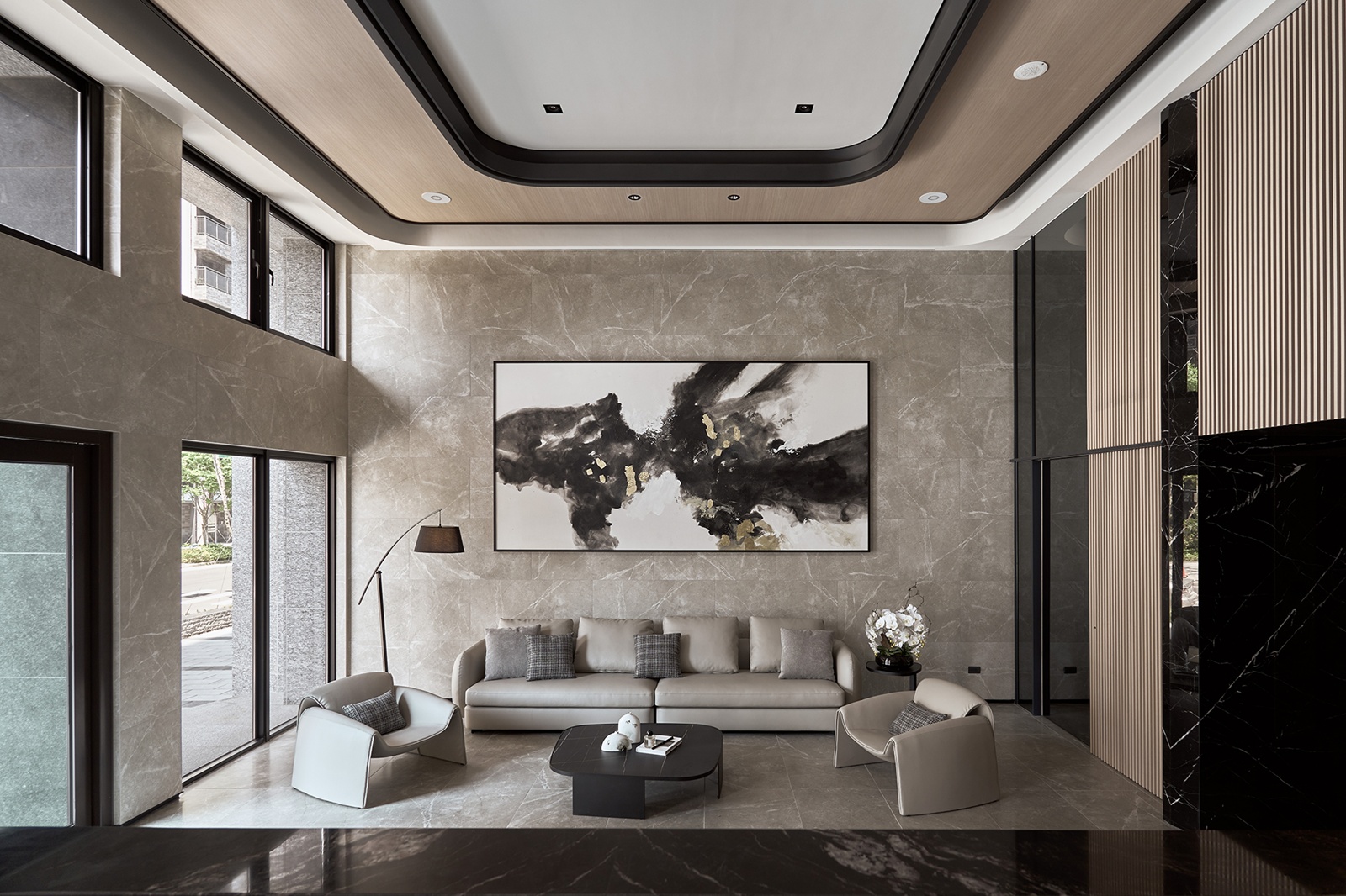 跳脫傳統公設空間常淪為閒置場所的困境,本案特別以多元複合式機能設計來活化各個場域,提高空間使用率。其中,再導入自然建材、藝術畫作、格柵與幾何元素,可大幅提升場域的識別度。如此一來,公設空間將不再只是附屬機能的延伸,而是能串聯生活、促進住戶交流互動的核心區域。