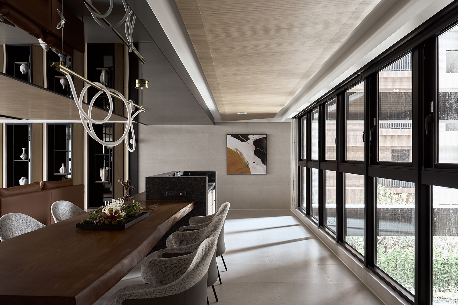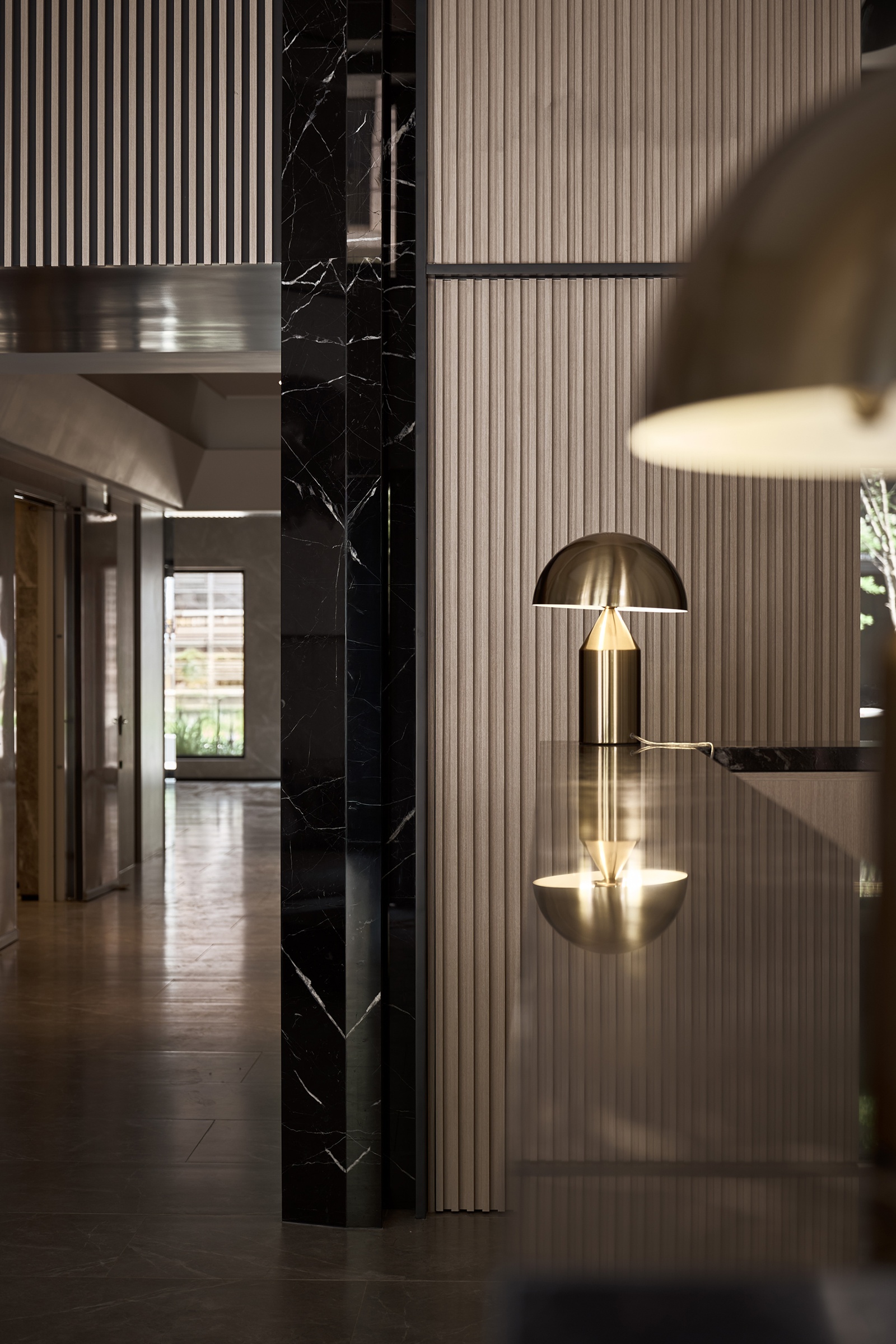 空間擘劃上,透過挑高設計結合大面落地窗,可提高室內採光,創造出通透、敞亮的場域形象,讓住戶享有舒適愜意的生活體驗。而細節方面,團隊巧妙運用了交丁錯位的施作手法鋪設大理石於牆面,再搭配木作、格柵、灰鏡等元素,不僅大幅提升了視覺層次,更展現了對工藝的細膩把控與堅持。