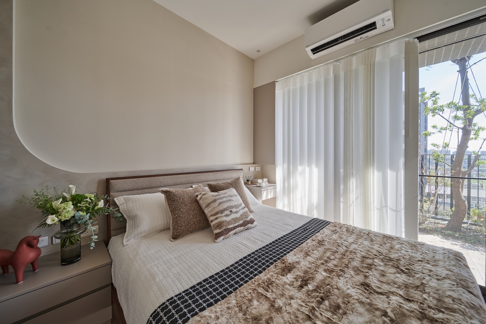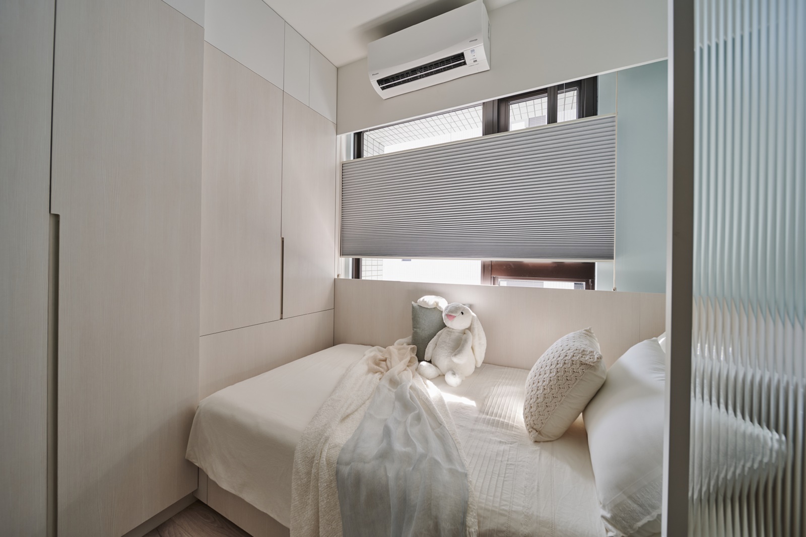 此外,團隊還巧妙運用延續性的設計來創造視覺延伸,包括從玄關鞋櫃銜接到客廳電視櫃,以及從廚房櫥櫃銜接到餐廳邊櫃的設置等。其中,配置在餐廳一側的備餐櫃,不僅能解決廚房使用空間不足的問題,還能有助於增加家人間的互動。緩步移動至私領域,團隊特別依循每位家庭成員的喜好擘劃臥室風貌,透過選擇不同色的班傑明摩爾(Benjamin Moore)極致系列色漆鏝抹各個房間,從而打造出個性化的休憩場所。