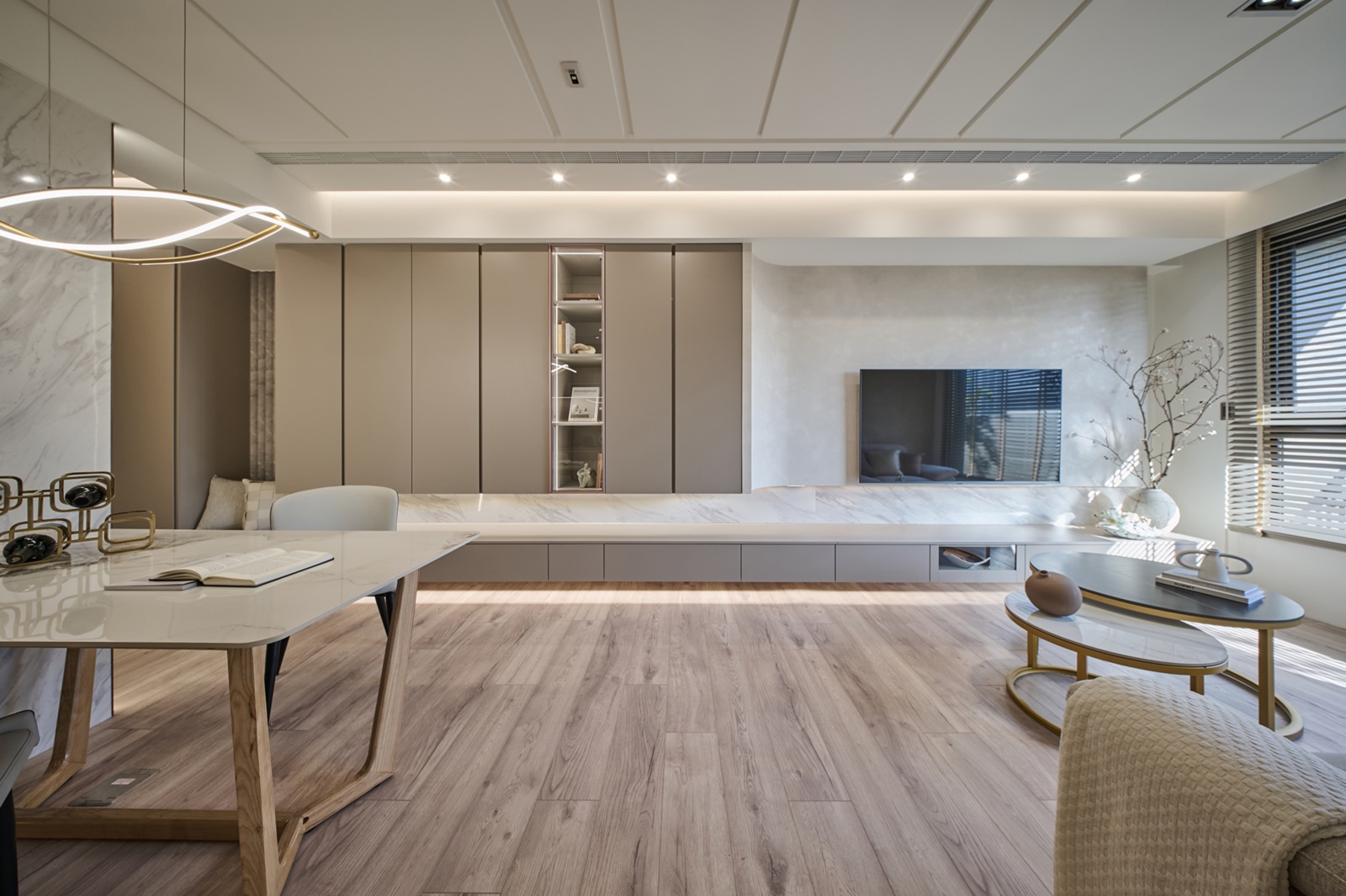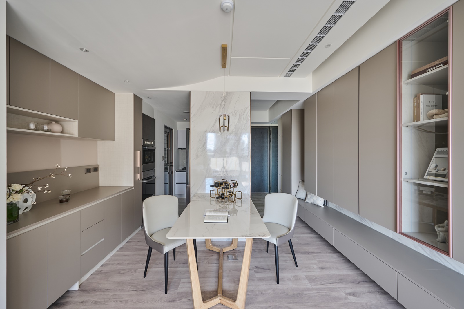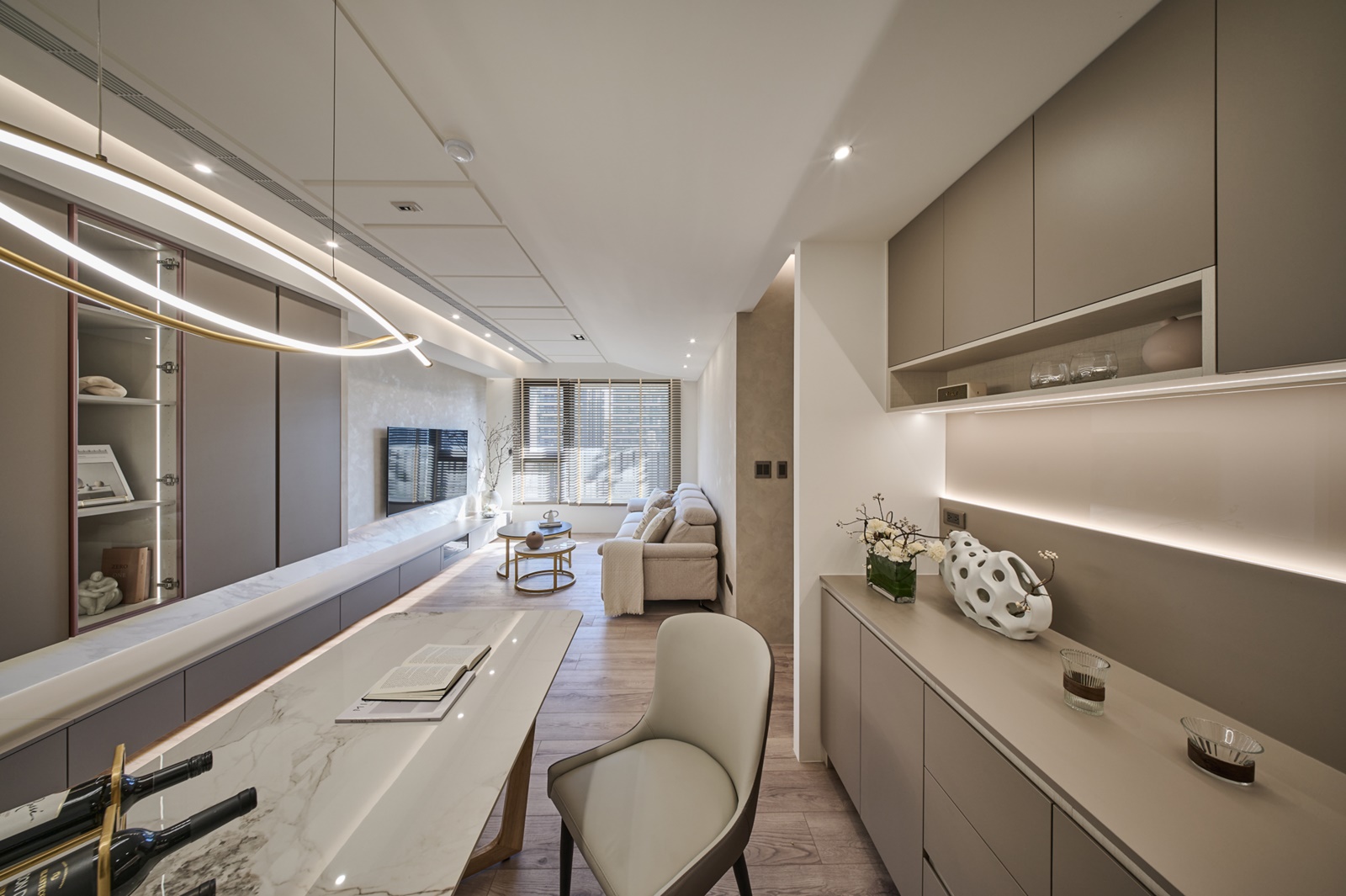 由於該住所的居住成員是以女生為主,因此空間底蘊主要是以其嚮往的浪漫氛圍做設定。先以奶茶色和淺米白色調作為基底,鋪陳溫暖柔和的調性,再搭配俐落的線條元素與金屬質感的燈具,增添層次與輕奢韻味。步入玄關,為開闊空間視覺,團隊特意於一側設置了落地鏡,而該鏡面亦能作為人們進出時整理儀容之用。向內走去,公領域是採開放式設計整合客廳、餐廳與廚房,以此營造敞亮的空間感受。