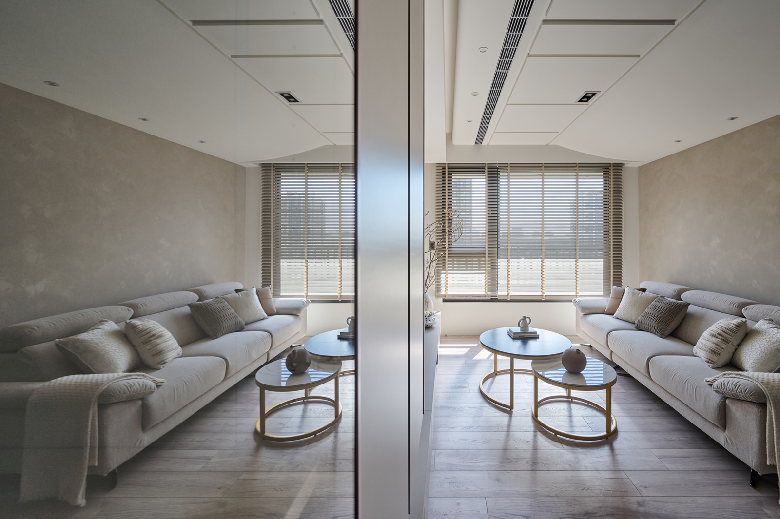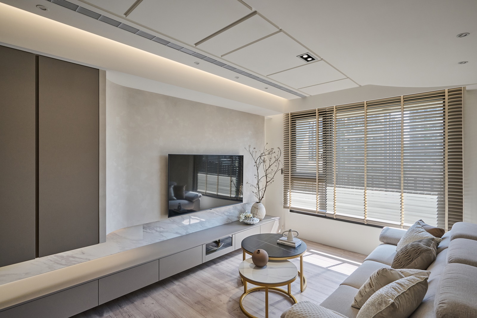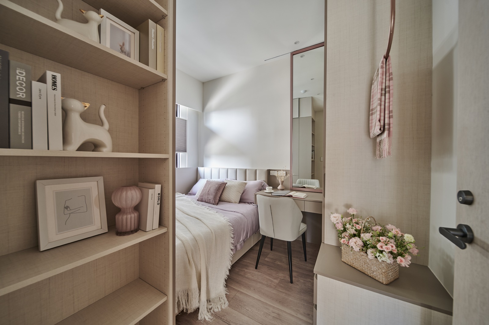 由於該住所的居住成員是以女生為主,因此空間底蘊主要是以其嚮往的浪漫氛圍做設定。先以奶茶色和淺米白色調作為基底,鋪陳溫暖柔和的調性,再搭配俐落的線條元素與金屬質感的燈具,增添層次與輕奢韻味。步入玄關,為開闊空間視覺,團隊特意於一側設置了落地鏡,而該鏡面亦能作為人們進出時整理儀容之用。向內走去,公領域是採開放式設計整合客廳、餐廳與廚房,以此營造敞亮的空間感受。
