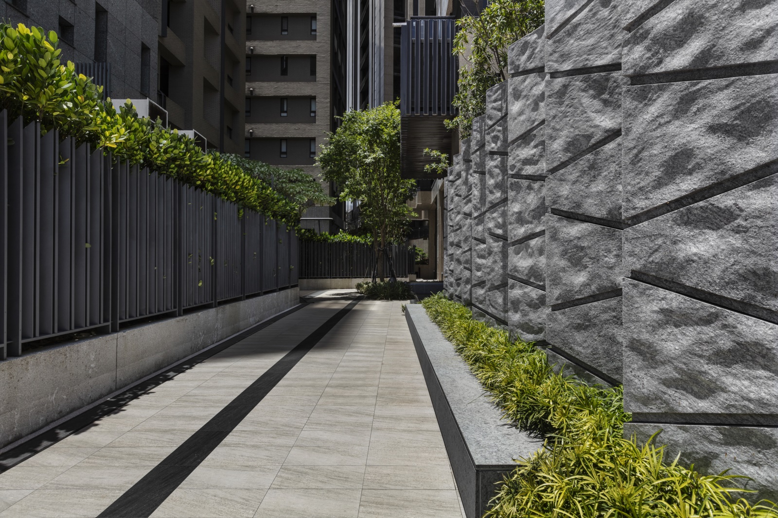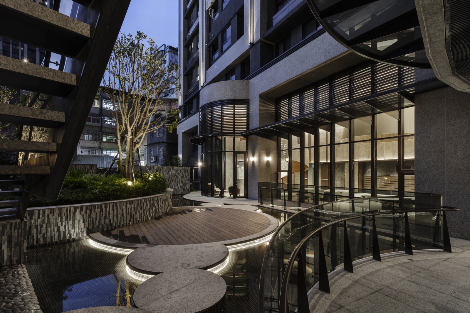 本案是住宅大樓的景觀設計案。鑒於基地位於山城,團隊便以環境中的山景、溪流意象作為此次的設計主軸,冀望藉此構築出如詩如畫的生活情境。整體僅用庭園水景和擬態的山景步道兩種元素進行擘劃。透過山水、綠景的交互作用,為住戶構築出靜謐又廣闊的棲居環境,使其在繁雜的都市中也能享有世外桃源般的生活體驗。