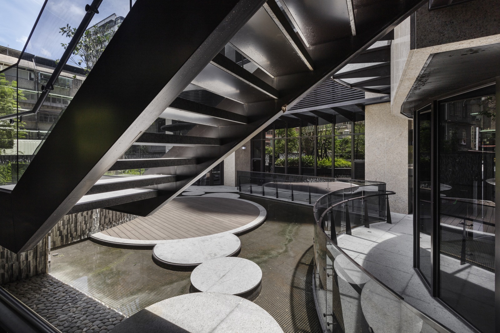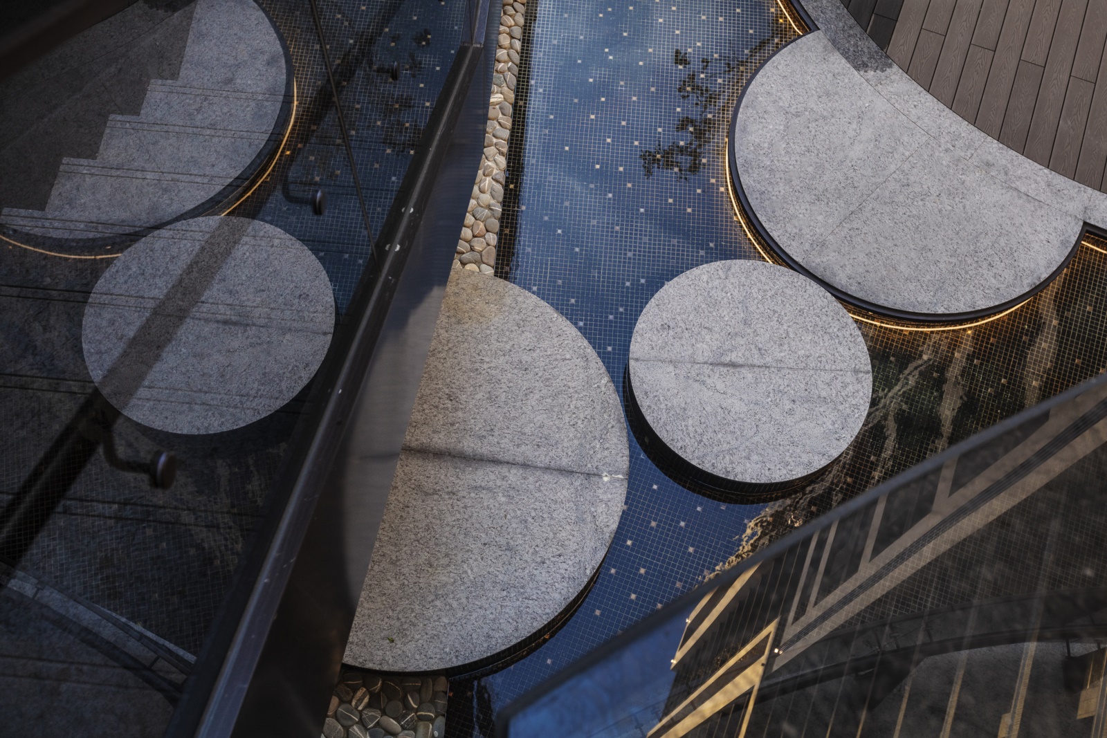 置身於庭園造景平台,植栽圍牆是汲取浮世繪的雨絲線條做設計。透過灰、白垂直交錯的細石排列,體現多變層次與動態感。其中,將大小各異的石板鋪設於水池之上,便能呈現如同蓮葉漂浮於水面的景象。同時,水池岸邊有鋪設卵石,就像山澗的磊石。在團隊的精心擘劃下,每個細節均呼應著當地風土景致、串聯著人文情感。