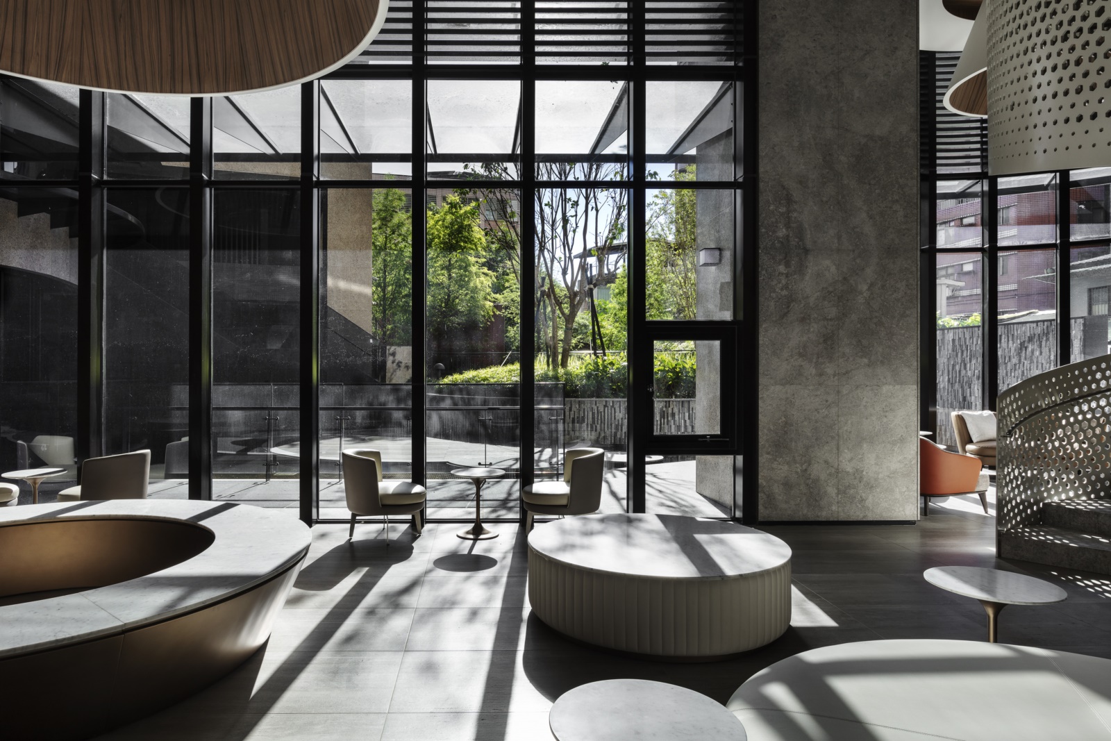 佇立於社區入口,團隊以連續的石柱及岩面牆體構建出步行通道,其猶如巨石陣的柱列形象,引人入勝。向內走去,景觀以綠帶、水池造景和檐廊進行組構。豐富的層次變化,使行走於基地內的人們,如同徜徉在錯落的山間那般悠遊自在。另外,考量到基地空間有限,團隊便決定利用視覺觀感來改變空間尺度。先是以漣漪般的弧形邊緣作為檐廊設計,將各個區域串聯,而後再利用通透的大面落地窗,消弭空間的界定,讓室內與戶外融為一體,開闊空間視覺。