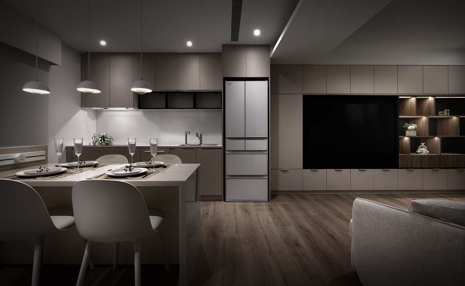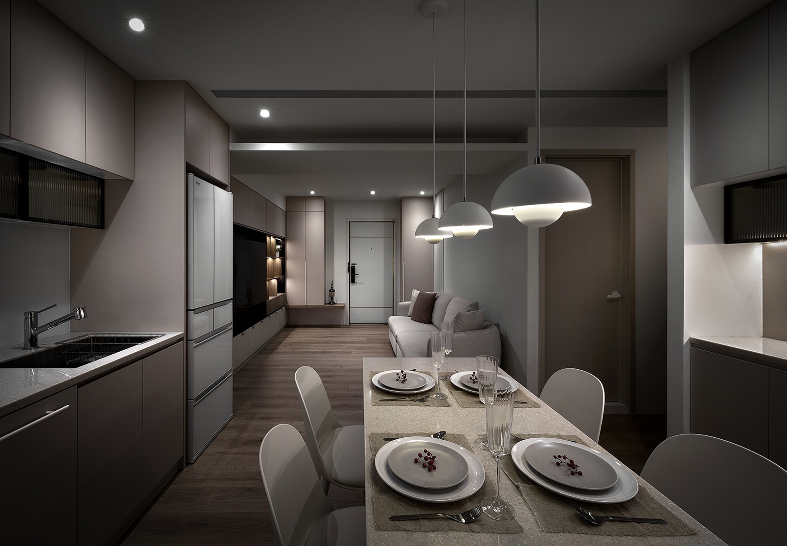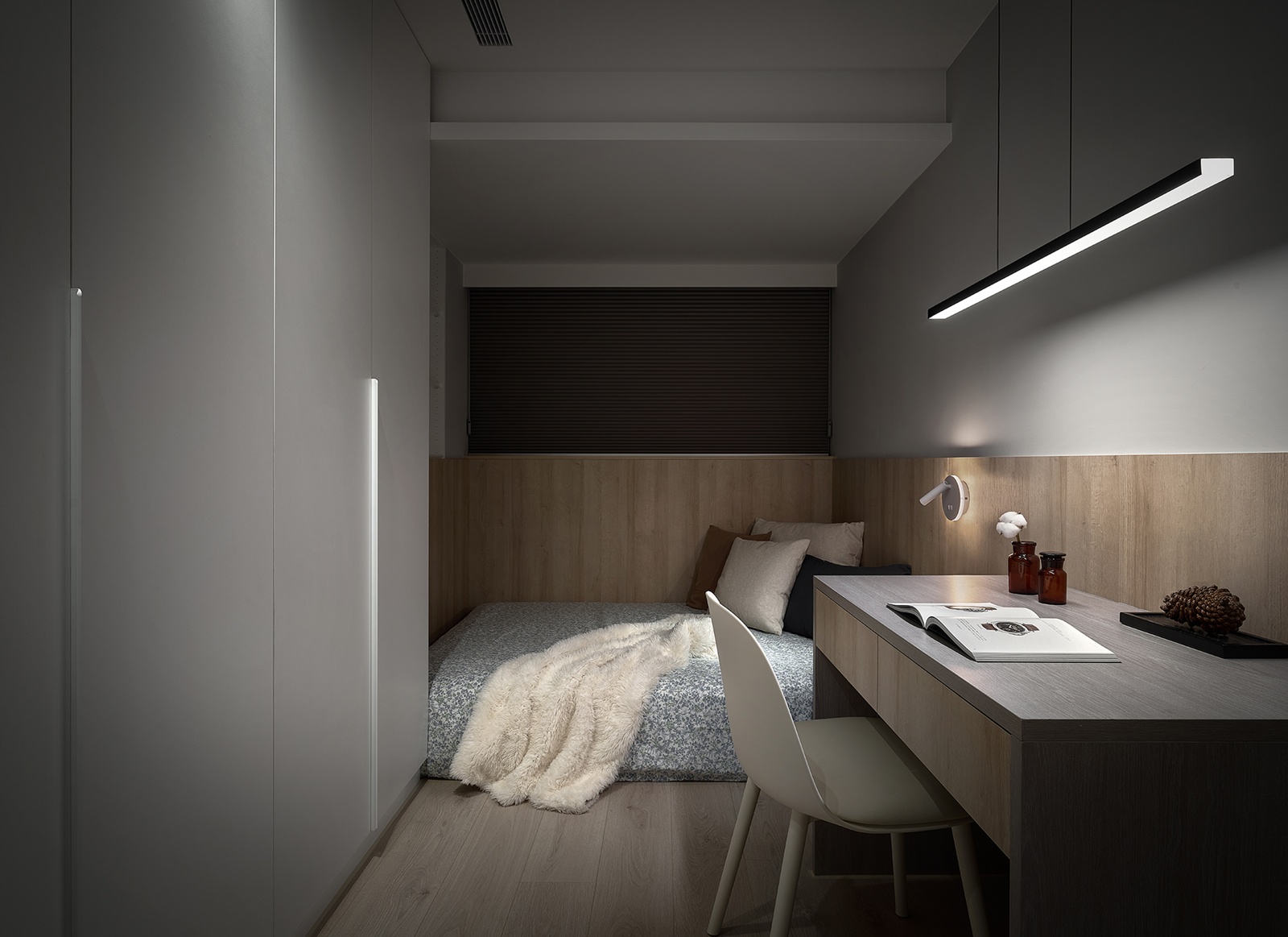 為滿足業主一家三口的生活習慣與機能需求,本案除了有拆除住所既有隔間、整合公領域之外,還有增設多個收納區於場域之中。而在廚房設備上,考量到住所為超高建築,團隊便有選用IH爐取代傳統瓦斯爐,以跳脫建築本身防火區劃的限制,並消除安全隱患。此外,在主臥與次臥的機能配置上,為因應現階段的使用情況,團隊有將兩區的用途對調,並增加主臥的收納配置。