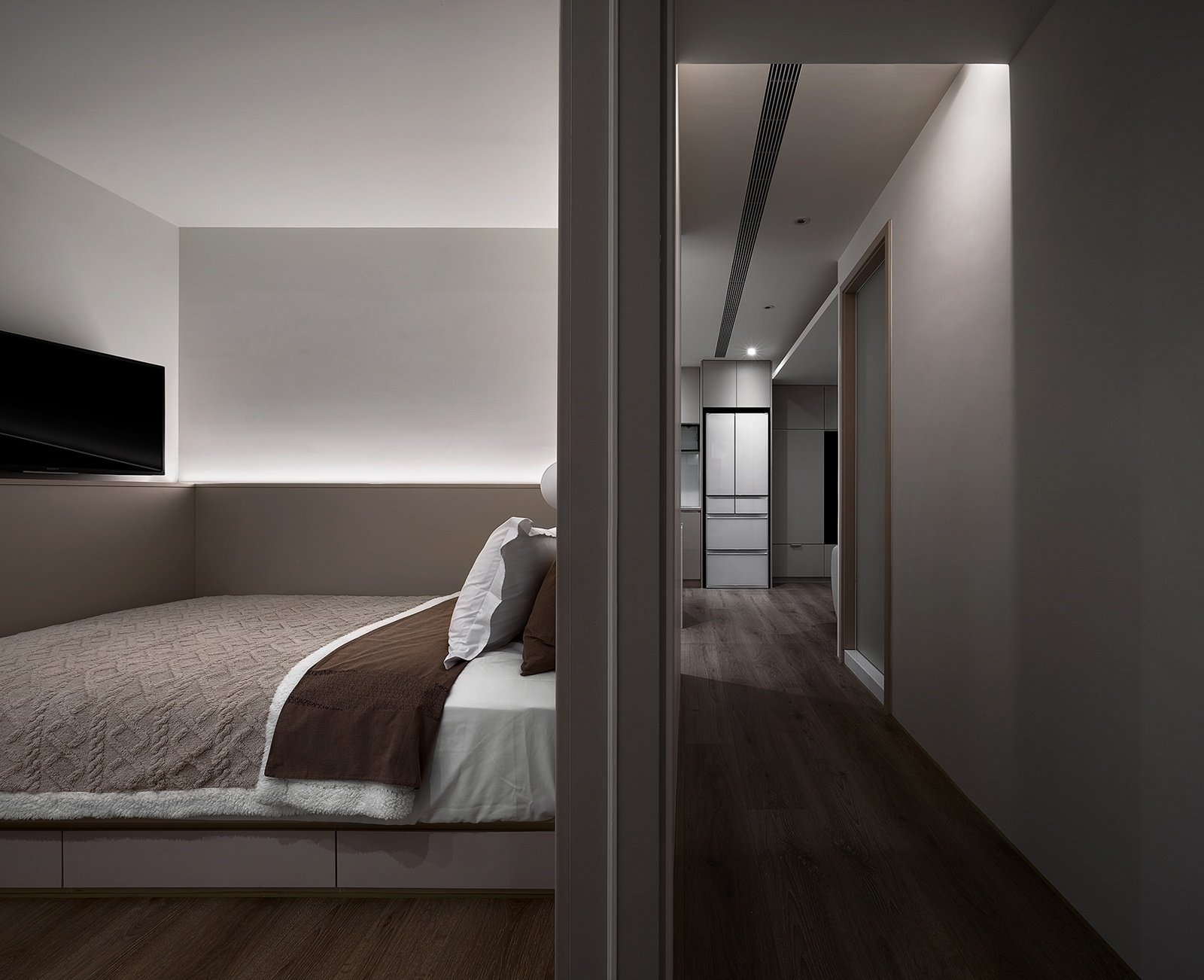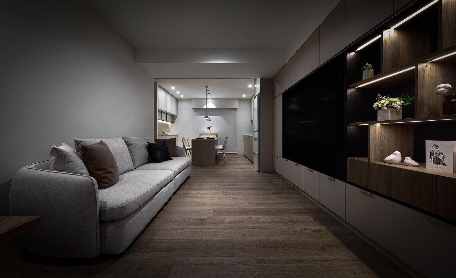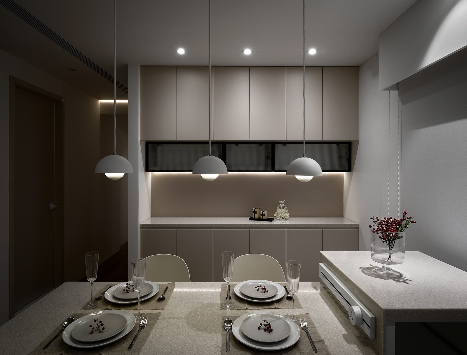 為滿足業主一家三口的生活習慣與機能需求,本案除了有拆除住所既有隔間、整合公領域之外,還有增設多個收納區於場域之中。而在廚房設備上,考量到住所為超高建築,團隊便有選用IH爐取代傳統瓦斯爐,以跳脫建築本身防火區劃的限制,並消除安全隱患。此外,在主臥與次臥的機能配置上,為因應現階段的使用情況,團隊有將兩區的用途對調,並增加主臥的收納配置。