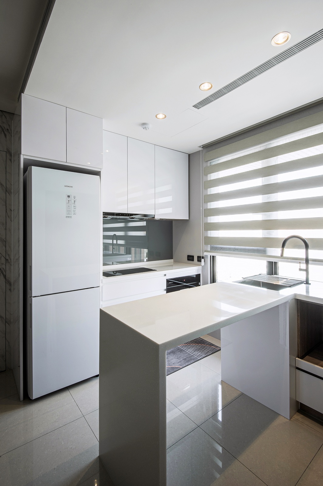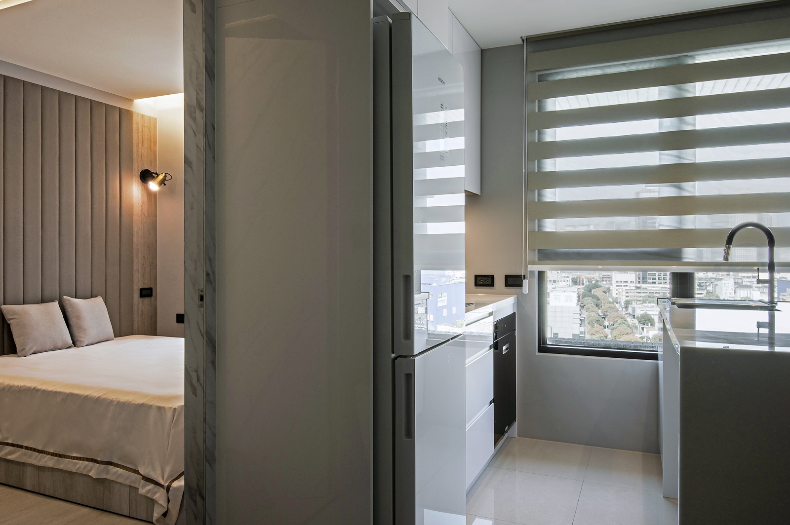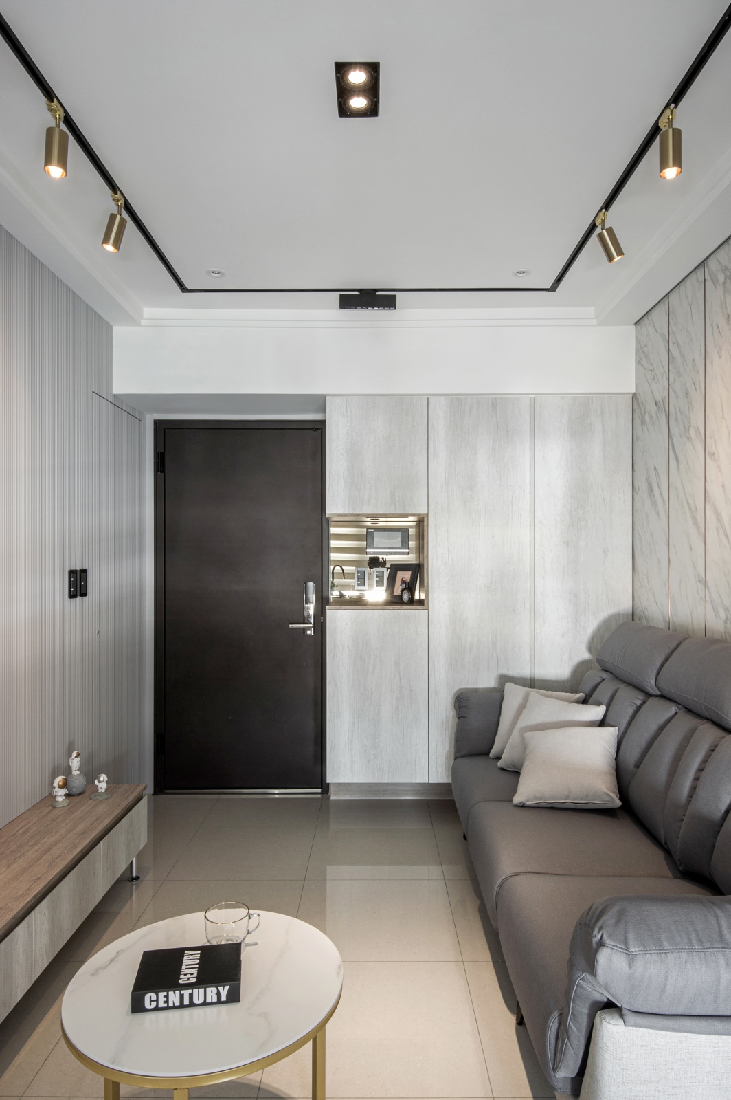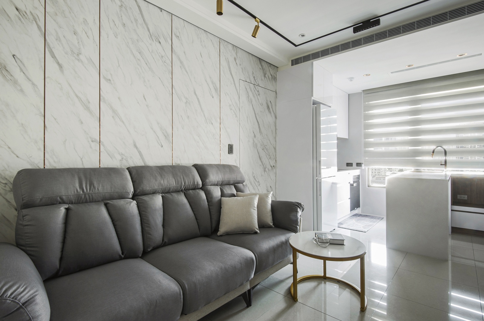 進到屋內,公領域是以開放式設計整合客廳與餐廚區,讓僅有單面採光且狹長的區域,也能擁有敞亮的空間感受。其中,團隊主要是選用輕淺的暖灰色調底定空間,以營造柔和、舒適的住所氛圍。而為了讓空間畫面保持乾淨俐落,客廳的背牆有導入暗門設計,且電視櫃是採用懸空矮櫃、燈具是配置方便移動的磁吸式軌道燈。其中,懸空矮櫃除了能避免空間顯得壓迫之外,還能提供收納機能與放置掃地機器人。通往至餐廚區,延續簡潔之概念,桌檯與櫃體皆是採平整、無把手的設計。另外,團隊有特別增設中島以因應業主需求。