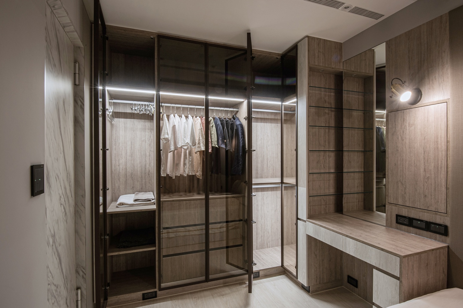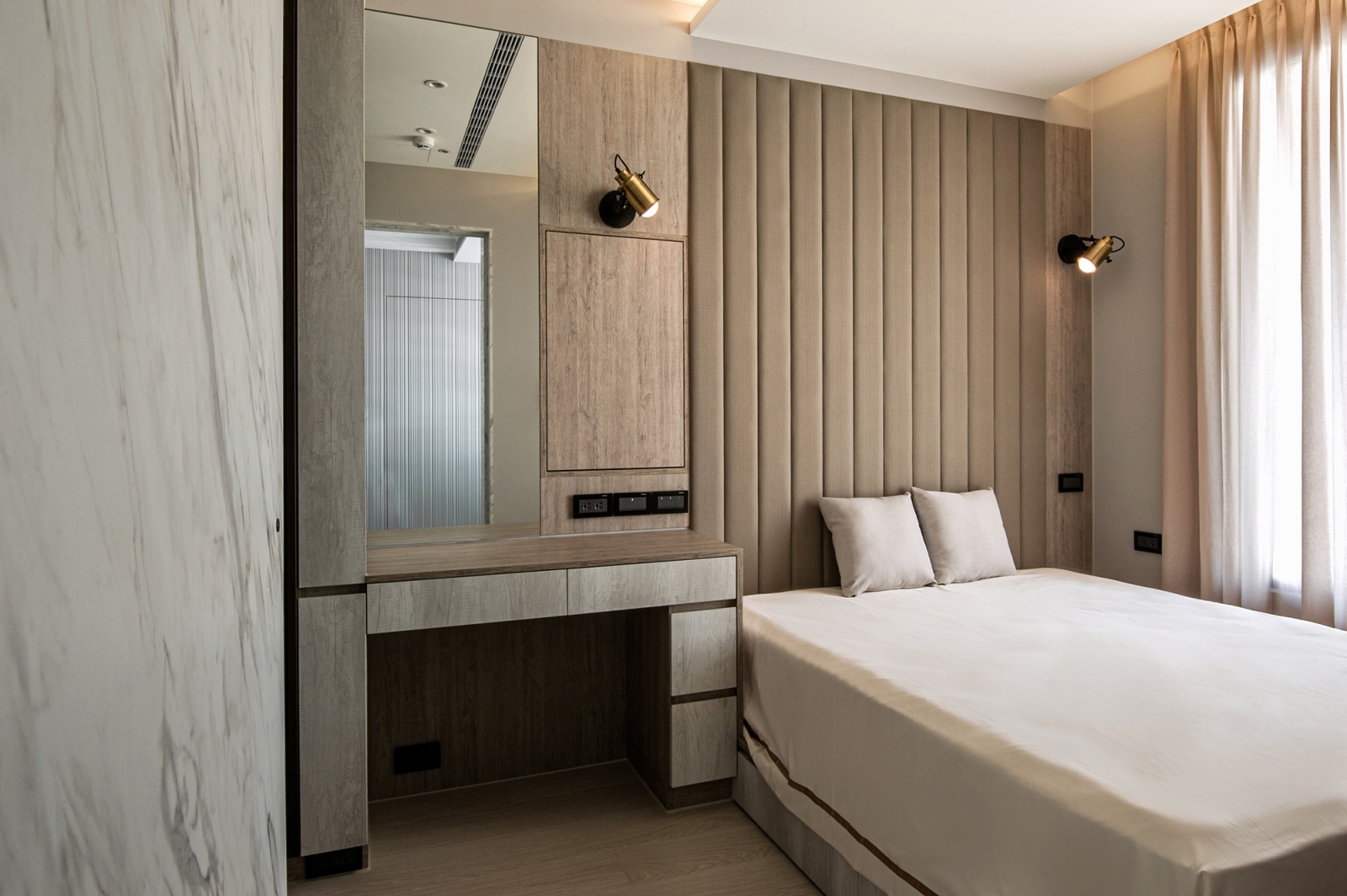 緩步移動至私領域,考量到女主人特別怕冷,團隊便將臥室地坪全面換成木地板。因木地板的導熱性比磁磚低,故相較於住所原先鋪陳的磁磚地板,其腳感溫度會相對溫暖許多。機能方面,團隊除了有設置L型衣櫃之外,還有配置抽屜掀床,可收納業主大量的衣物和個人物品,將空間坪效最大化。另外,床頭背牆有鋪陳繃布,可減少磕碰受傷之疑慮。