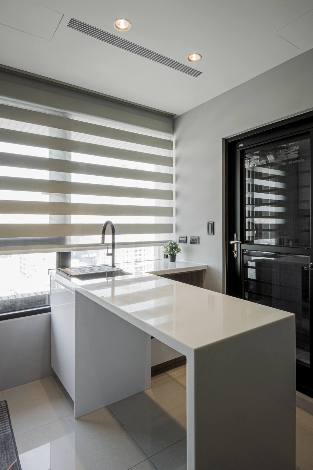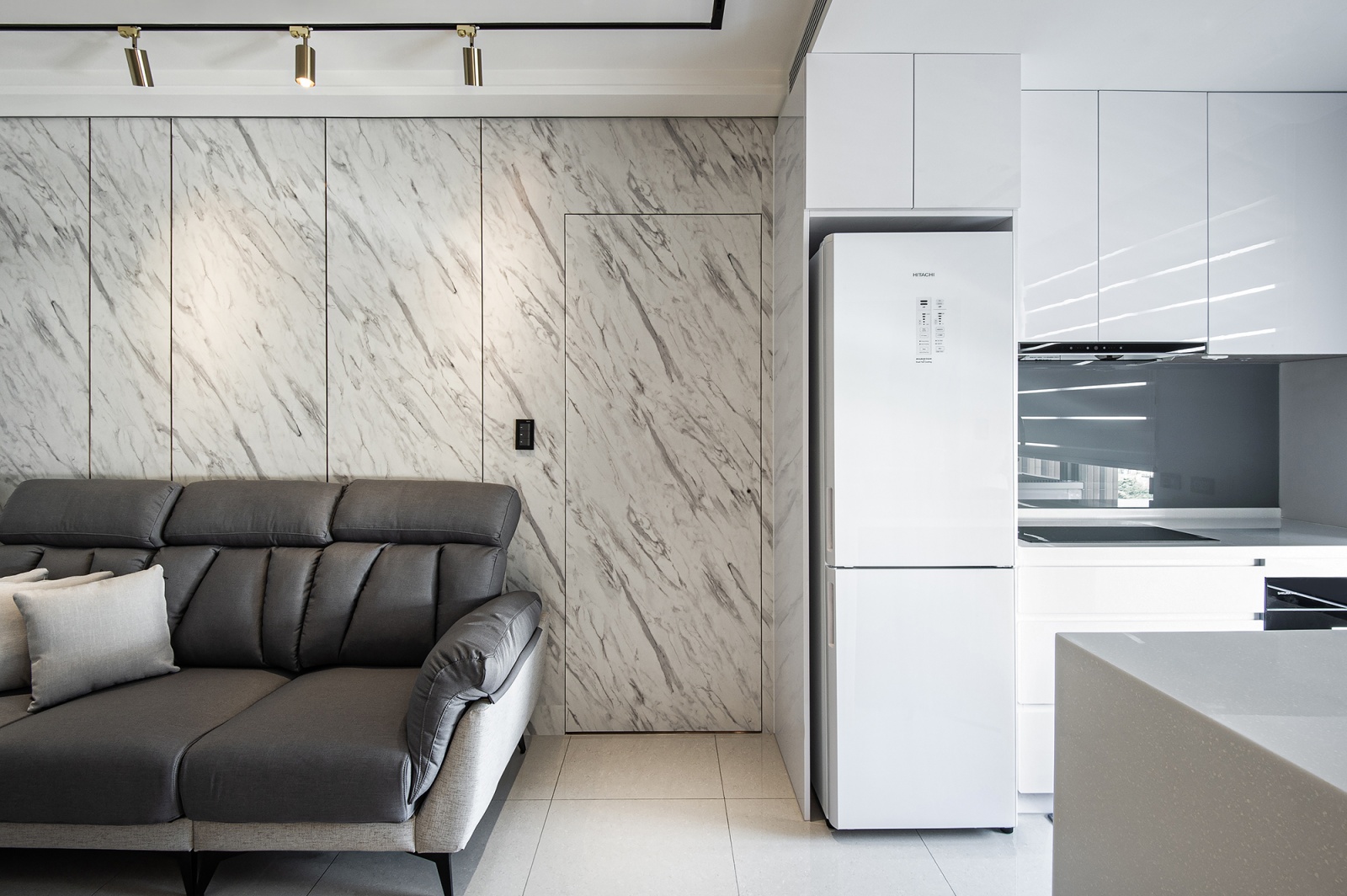 為創造出開闊的空間感受,團隊特別採用了多種線性設計來延展視覺效果。而在機能配置上,則考量到業主作為網路平台銷售者,需要大量的儲物空間,團隊便有在住宅內配置多個收納櫃。而櫃體皆是採無把手設計,能在滿足業主需求的同時,避免空間顯得凌亂。