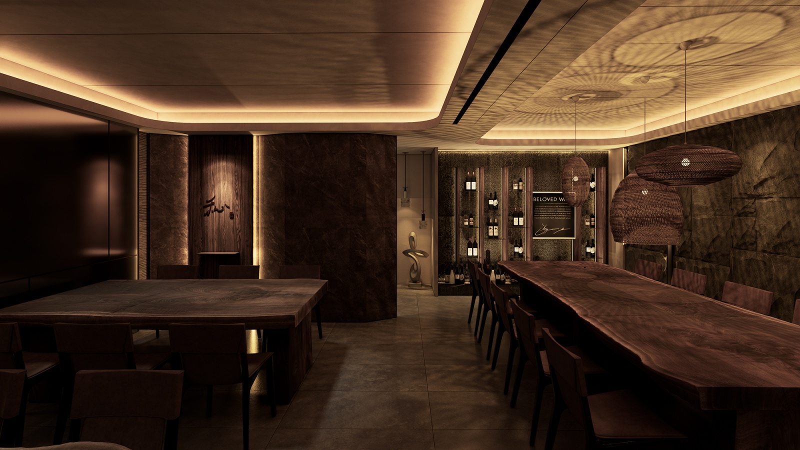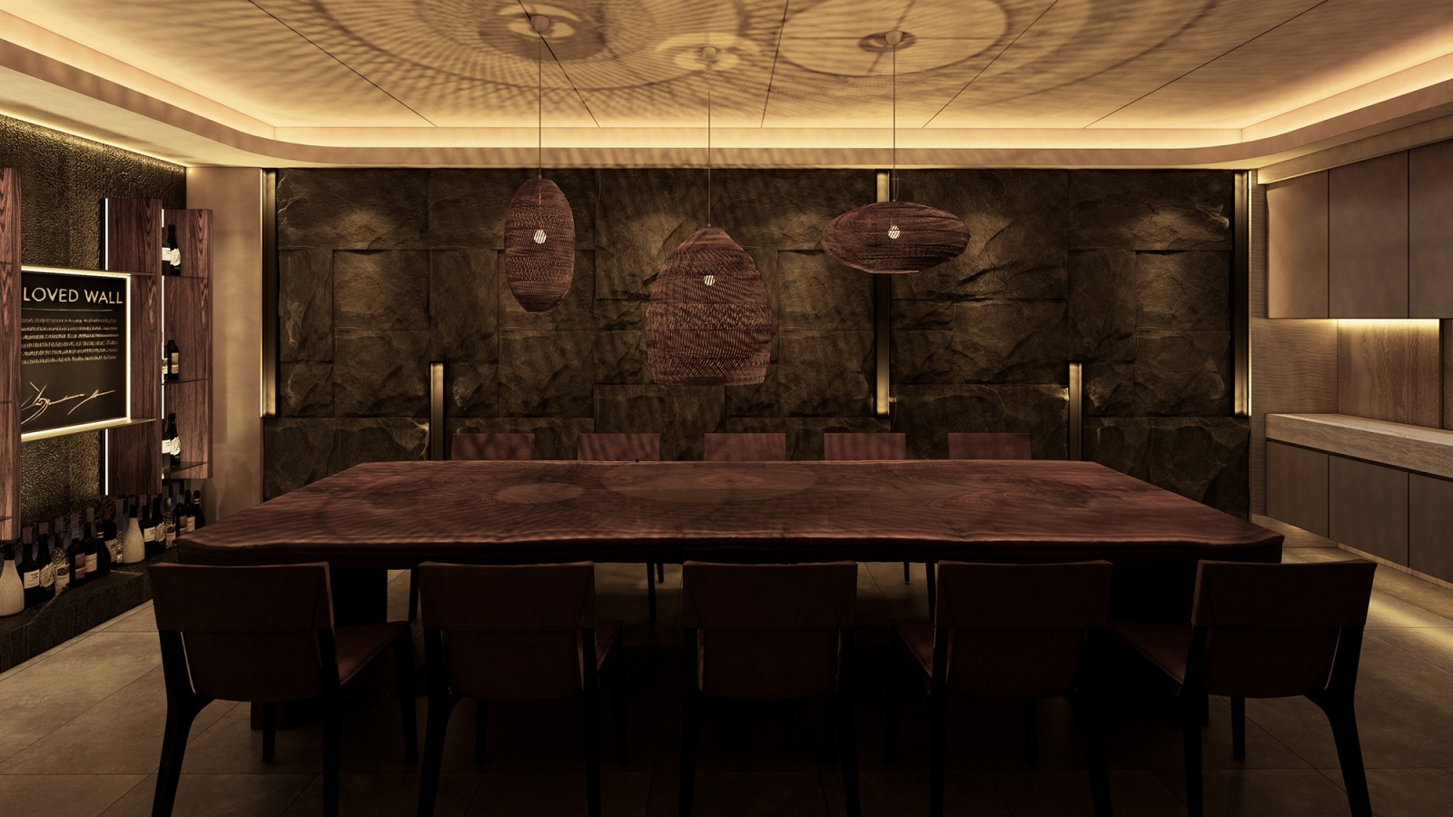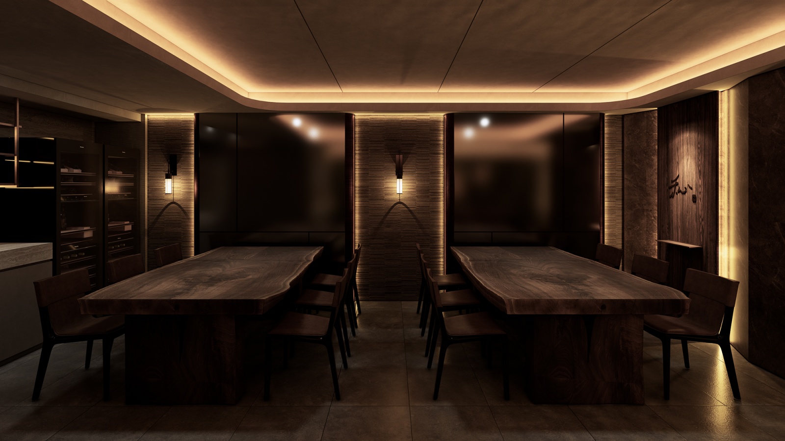 業主期望擁有一處低調奢華、深具質感的私宴空間,設計師遂以大地的語彙為筆觸,揉合岩石的剛毅與木紋的溫潤,勾勒出一幅低調卻震撼人心的場景。深色調的光影交錯,如潺潺流動的詩句,在空間中低聲吟詠,營造出沉靜而層次豐富的氛圍。