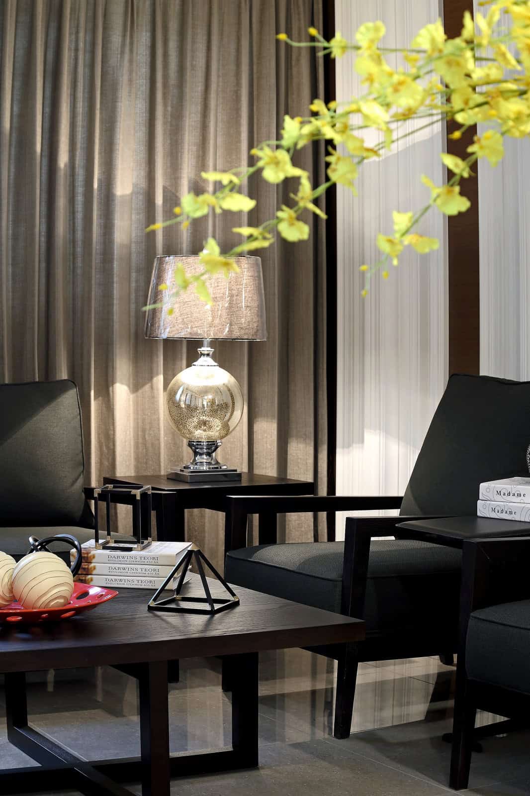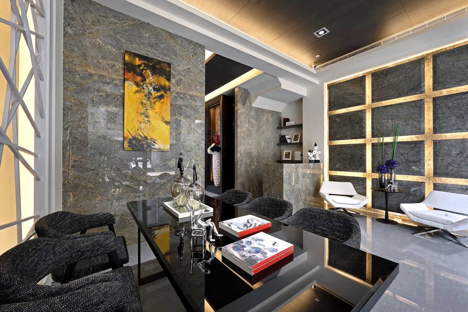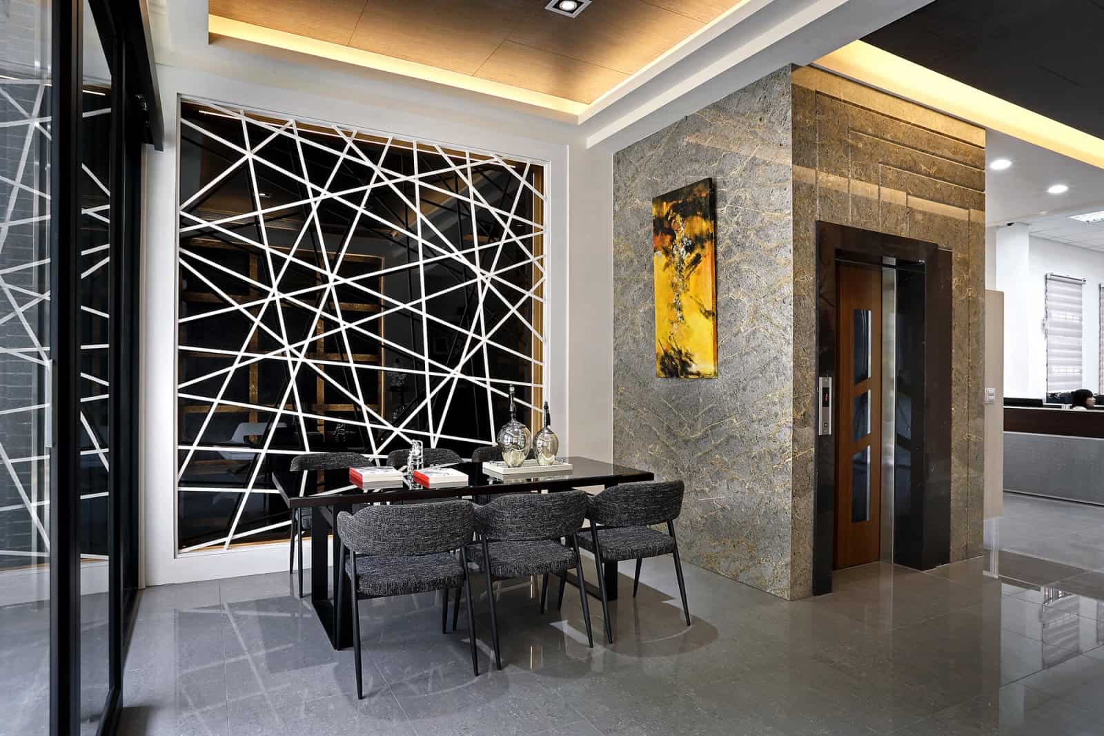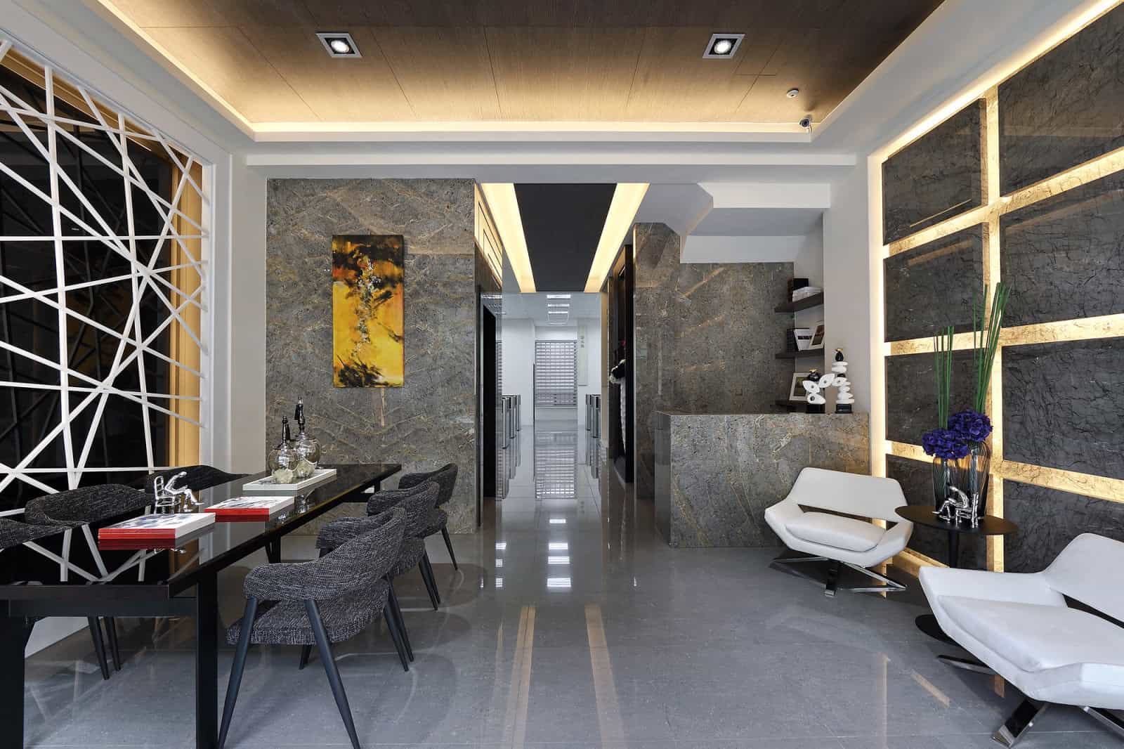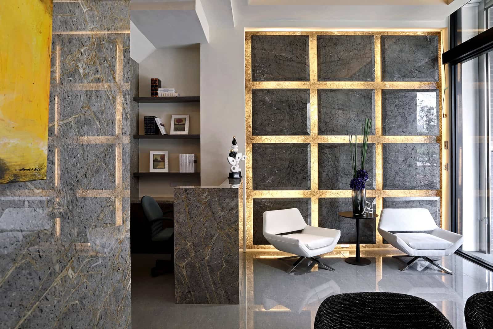 走進接待區,團隊特意選用銀河灰大理石作為端景牆、接待櫃檯與局部背牆的材料,其冷調的色彩、細膩的紋理搭配暖調的間接照明,可為場域營造出沉穩、高雅的氛圍。其中,接待區的兩面背牆分別以井然有序的塊體設計、交錯的線條元素來表現俯瞰建築、城市網路交織的意象。
