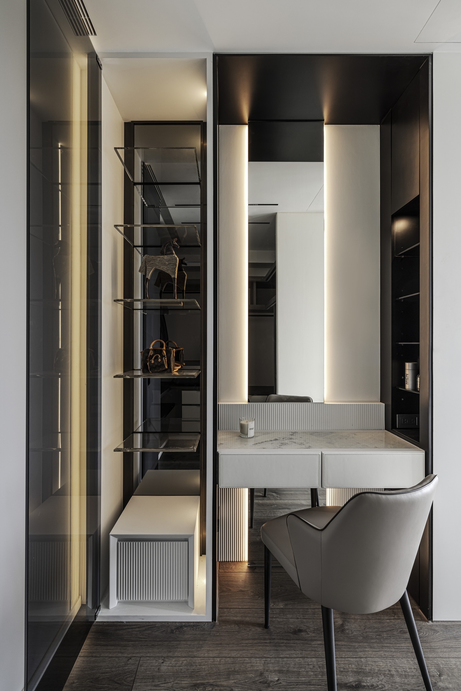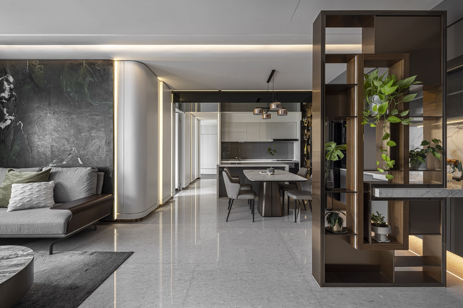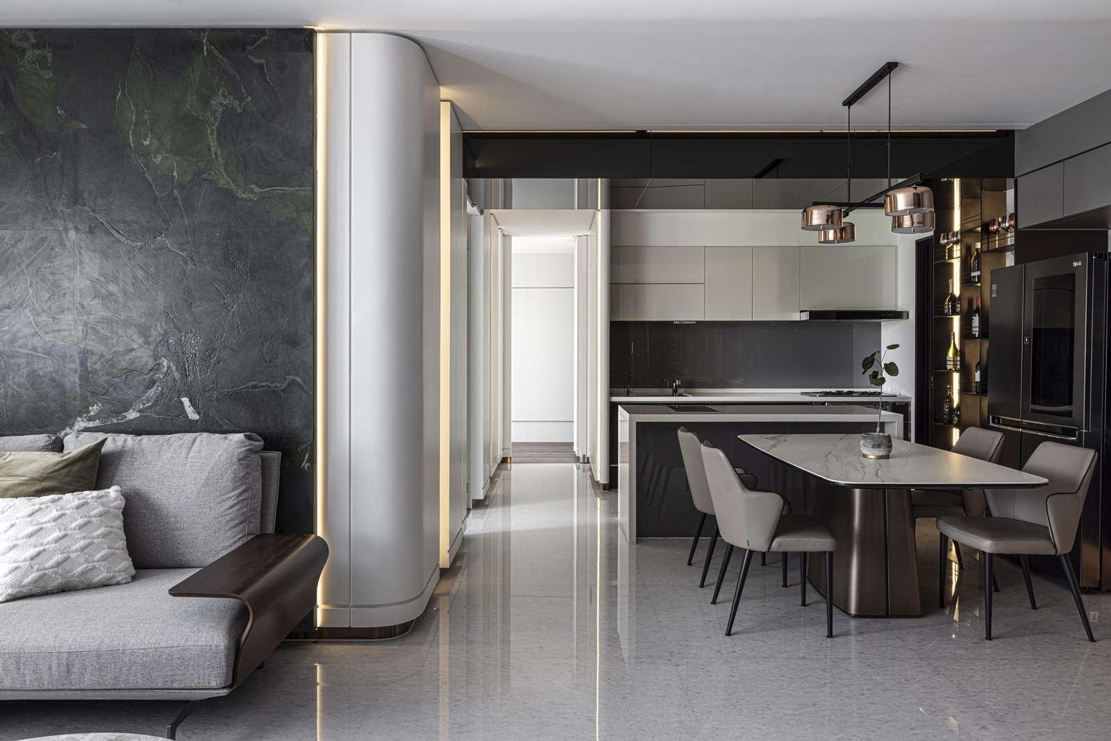 為了使公領域不顯侷促,團隊是以開放式設計整合玄關、客廳、餐廳與廚房,再搭配間接照明的配置,便能悄然劃分出區域性。同時,全室是採無高低差地坪設計,可減少居者絆倒受傷的情況發生。另外,天花板與牆面轉角處皆有導入圓弧設計,且橫跨於餐廳、廚房之間的樑體亦有採鏡面玻璃做包覆,能有助於消弭空間的冷硬感、減輕視覺壓迫,提升整體的舒適度。
