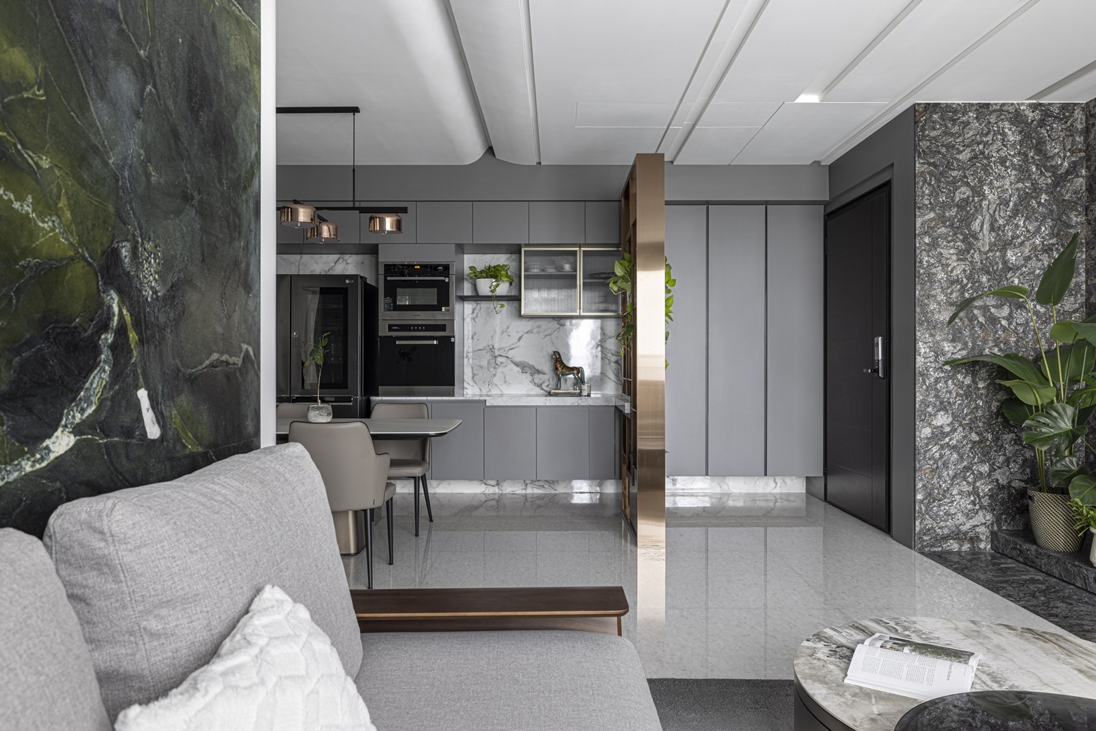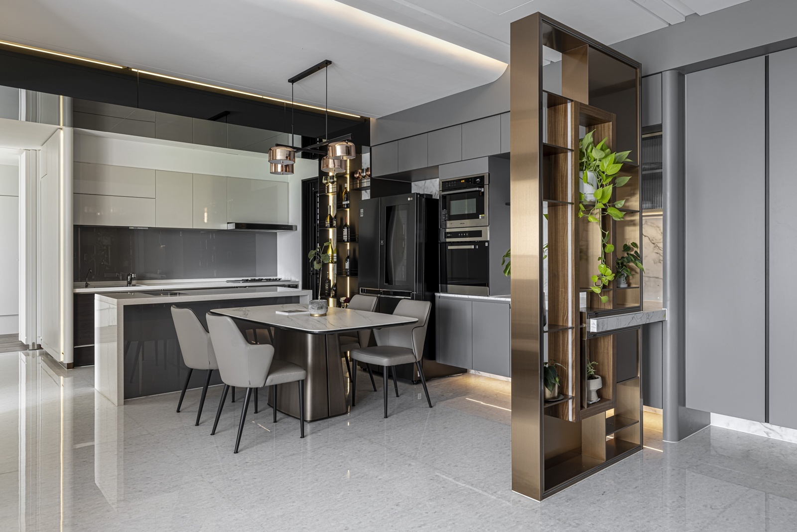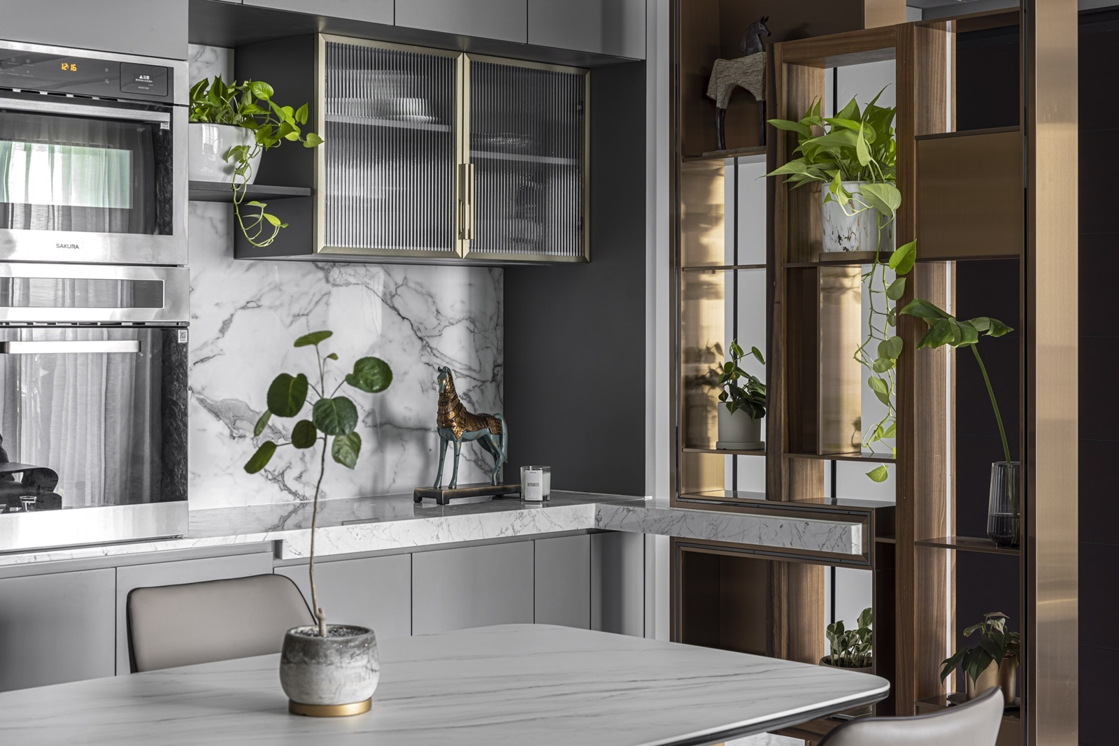 為了使公領域不顯侷促,團隊是以開放式設計整合玄關、客廳、餐廳與廚房,再搭配間接照明的配置,便能悄然劃分出區域性。同時,全室是採無高低差地坪設計,可減少居者絆倒受傷的情況發生。另外,天花板與牆面轉角處皆有導入圓弧設計,且橫跨於餐廳、廚房之間的樑體亦有採鏡面玻璃做包覆,能有助於消弭空間的冷硬感、減輕視覺壓迫,提升整體的舒適度。