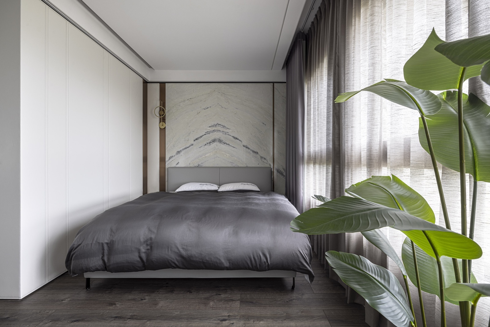 有別於公領域的石紋地磚設計,私領域則是選用溫潤的木板做鋪陳,以此底定寧謐、沉穩的休憩氛圍。其中,床頭背牆設置的淺色石紋壁板,可在呼應公領域的石材元素之餘,保持臥室的明亮感。