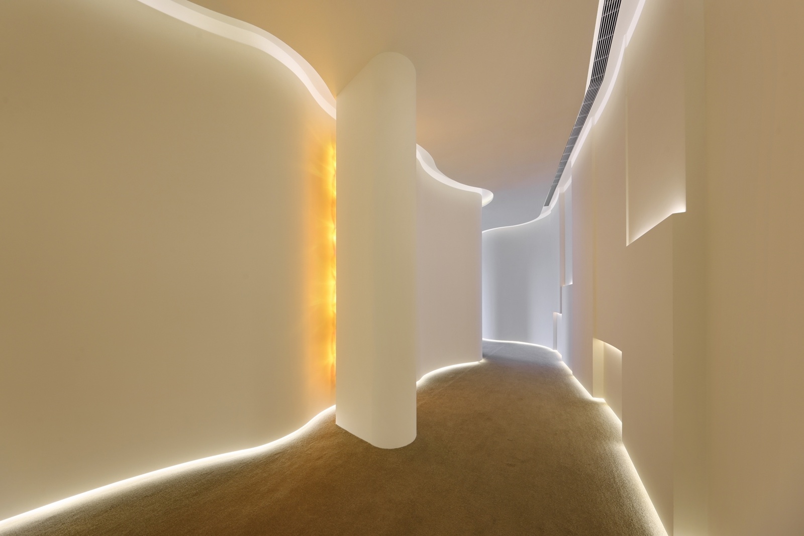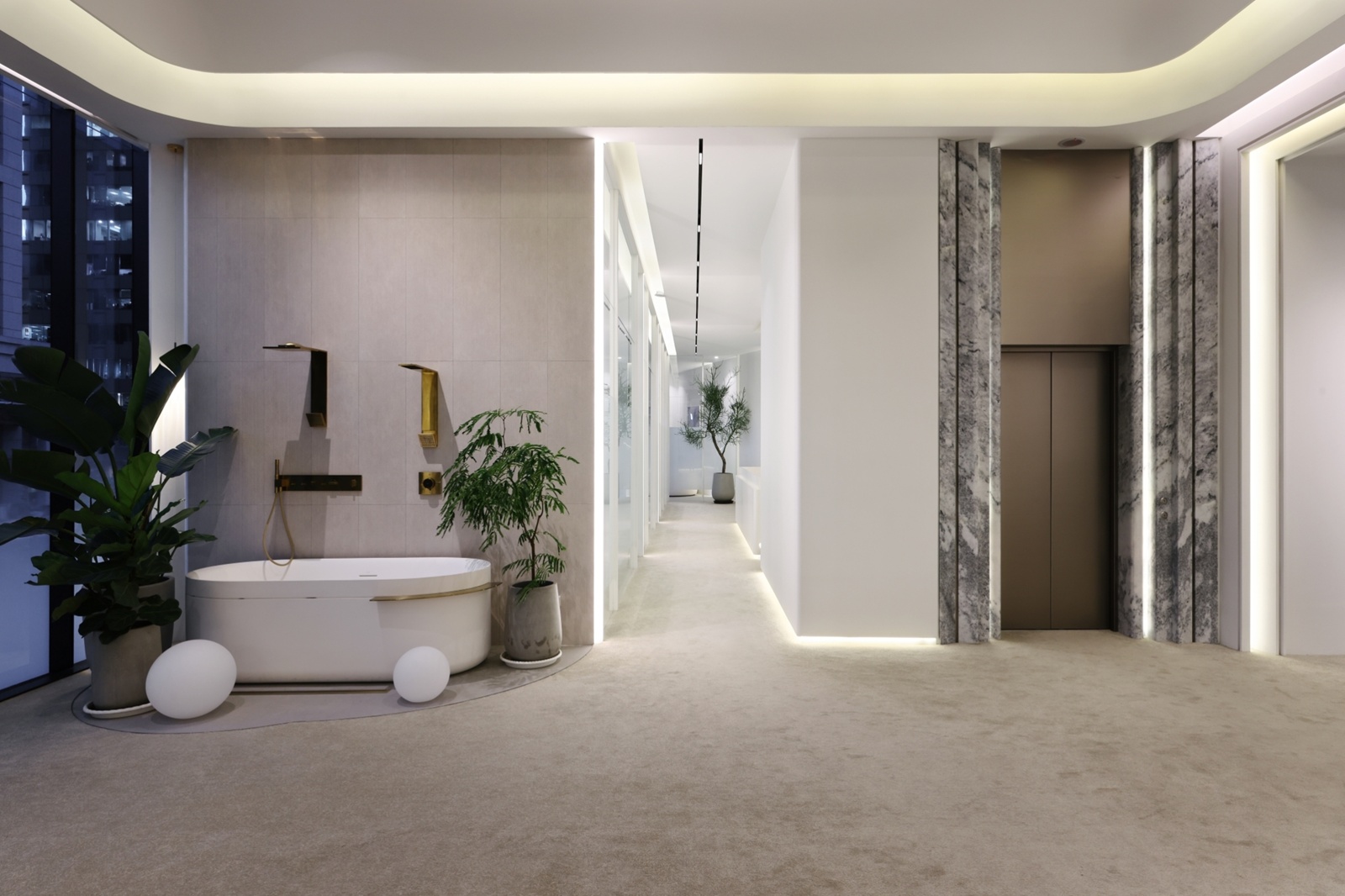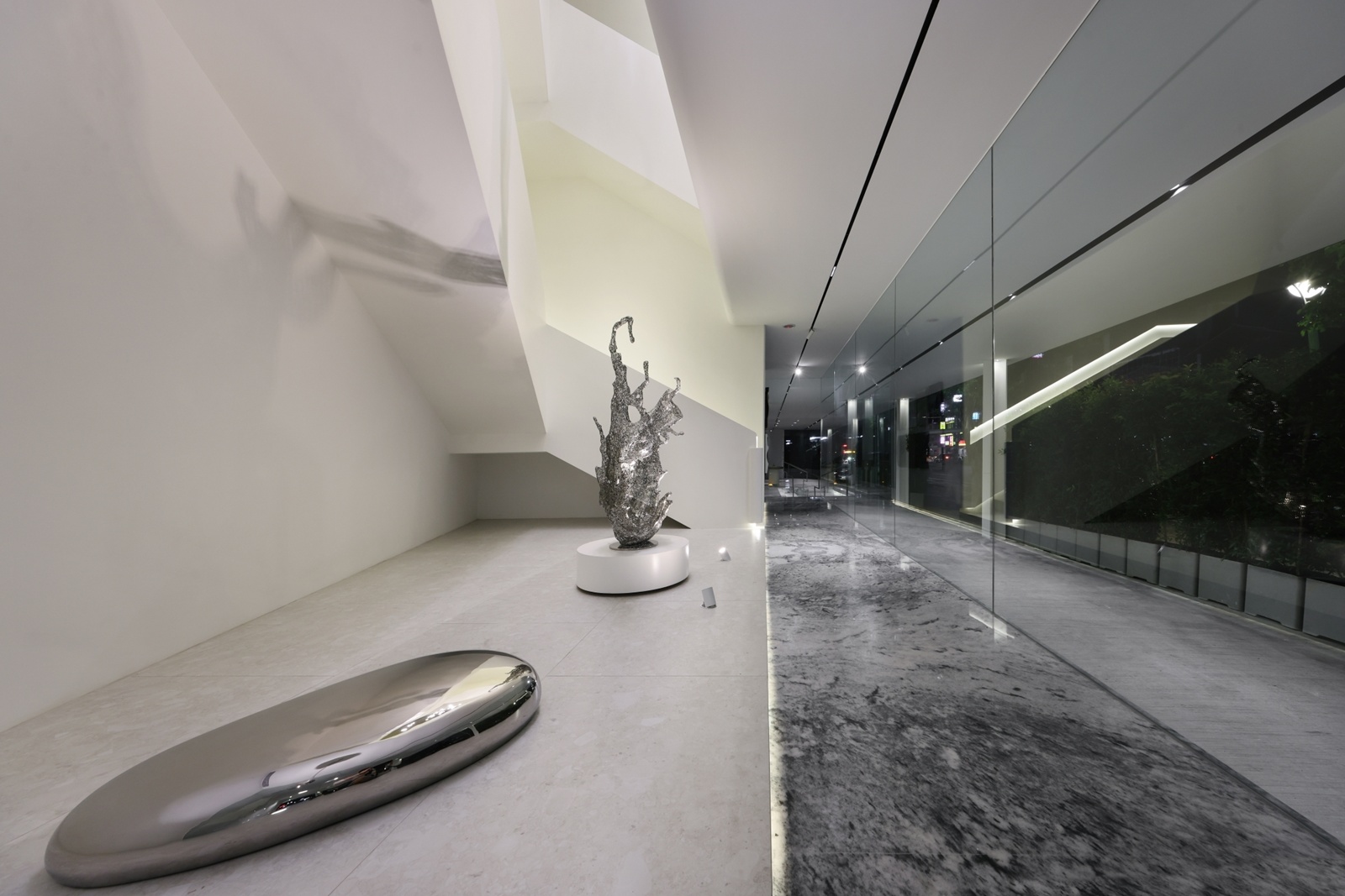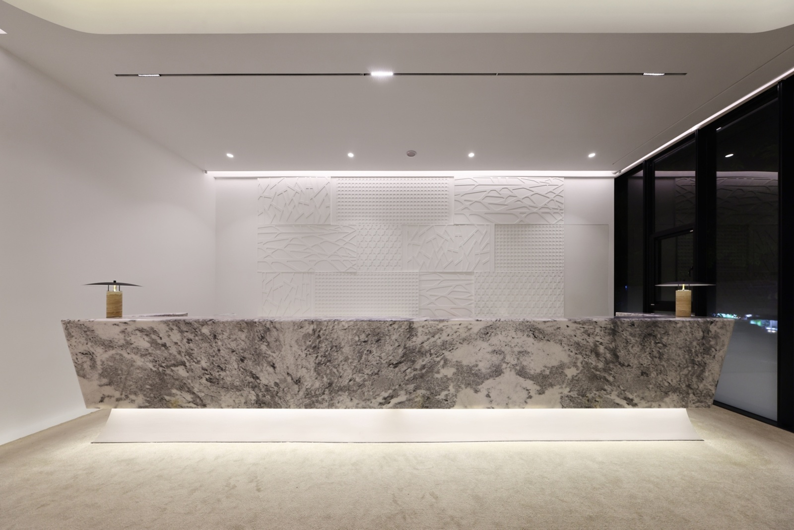 外觀設計以融入城市景觀和藝術品味為發想。團隊巧妙運用石材、玻璃、金屬、曲牆與隱藏式燈光等元素,表現「柔和光影」、「流線美學」和「自然交融」的概念,藉此彰顯自然環境與城市、居民共生共榮的和諧意象。另外,空間佈局是採漸進式分區設計,主要是利用石材、地毯、磁磚等材質差異劃分場域,以維持空間寬敞、動線流暢。