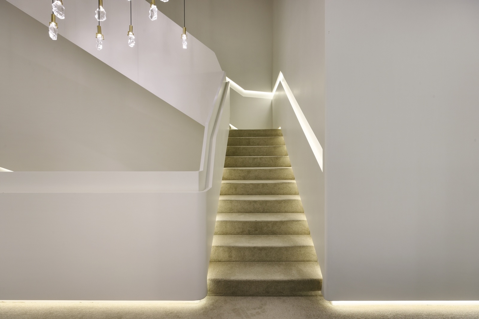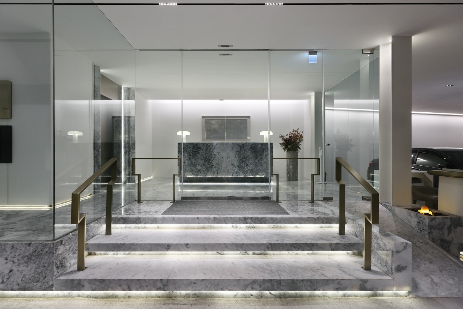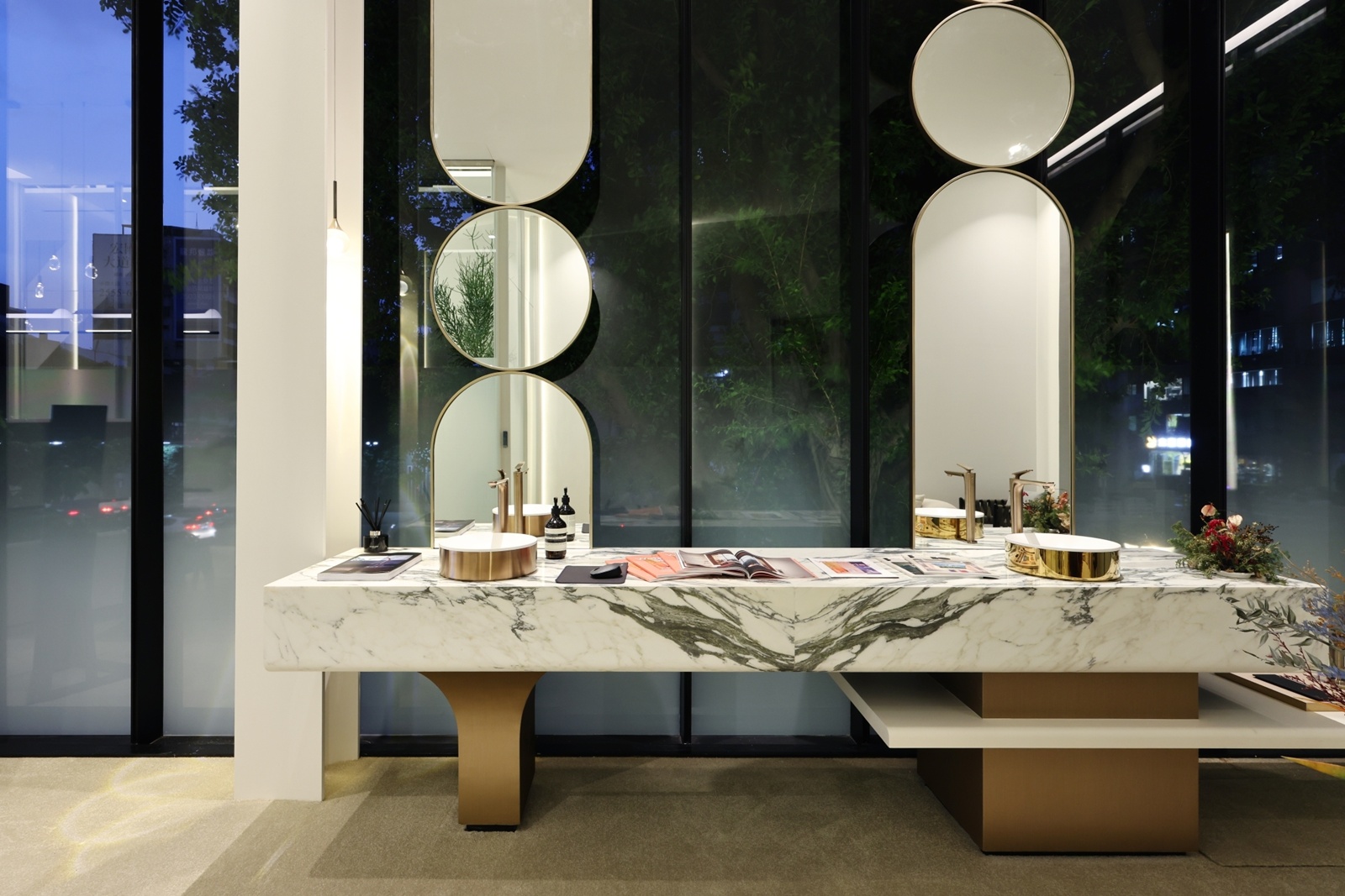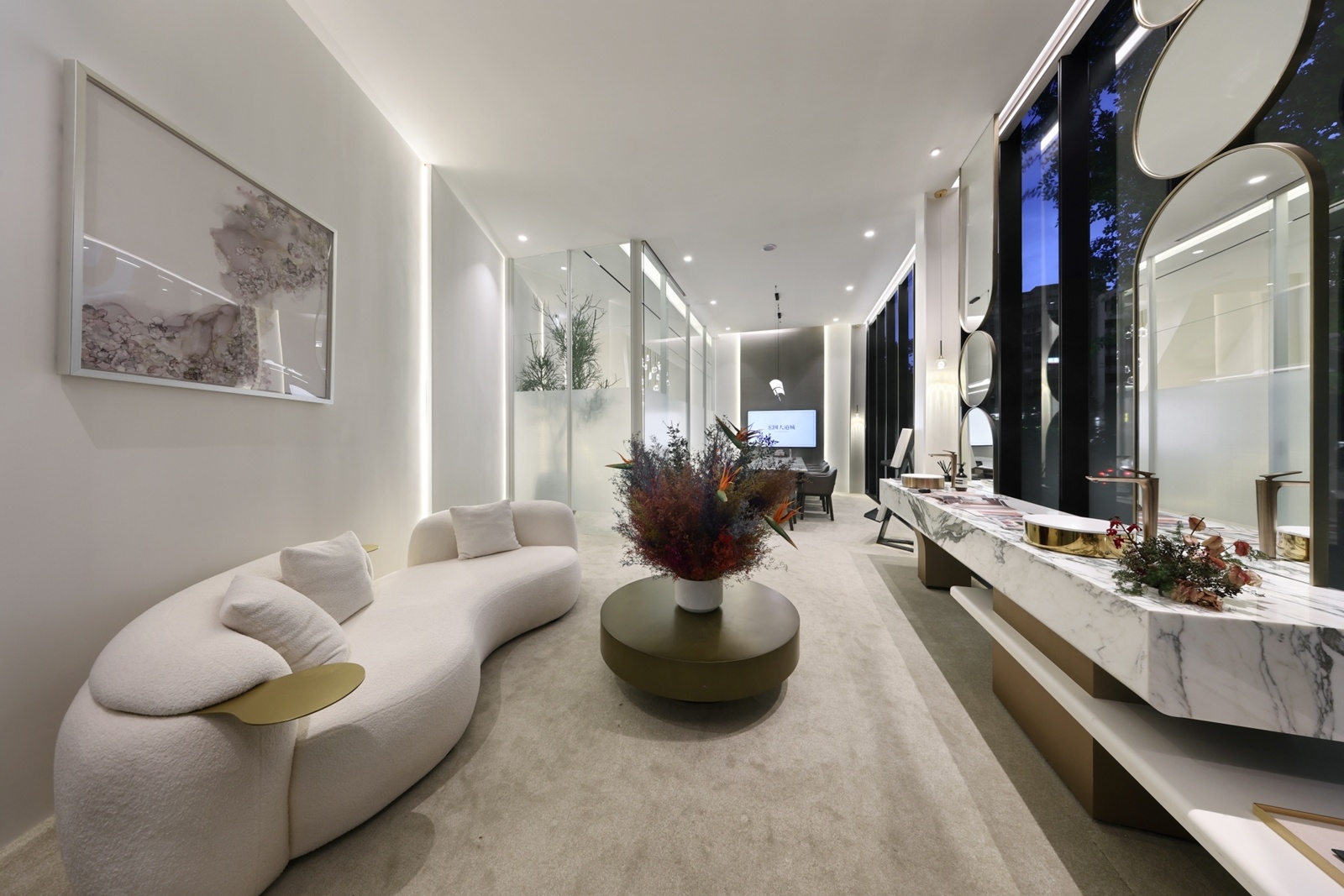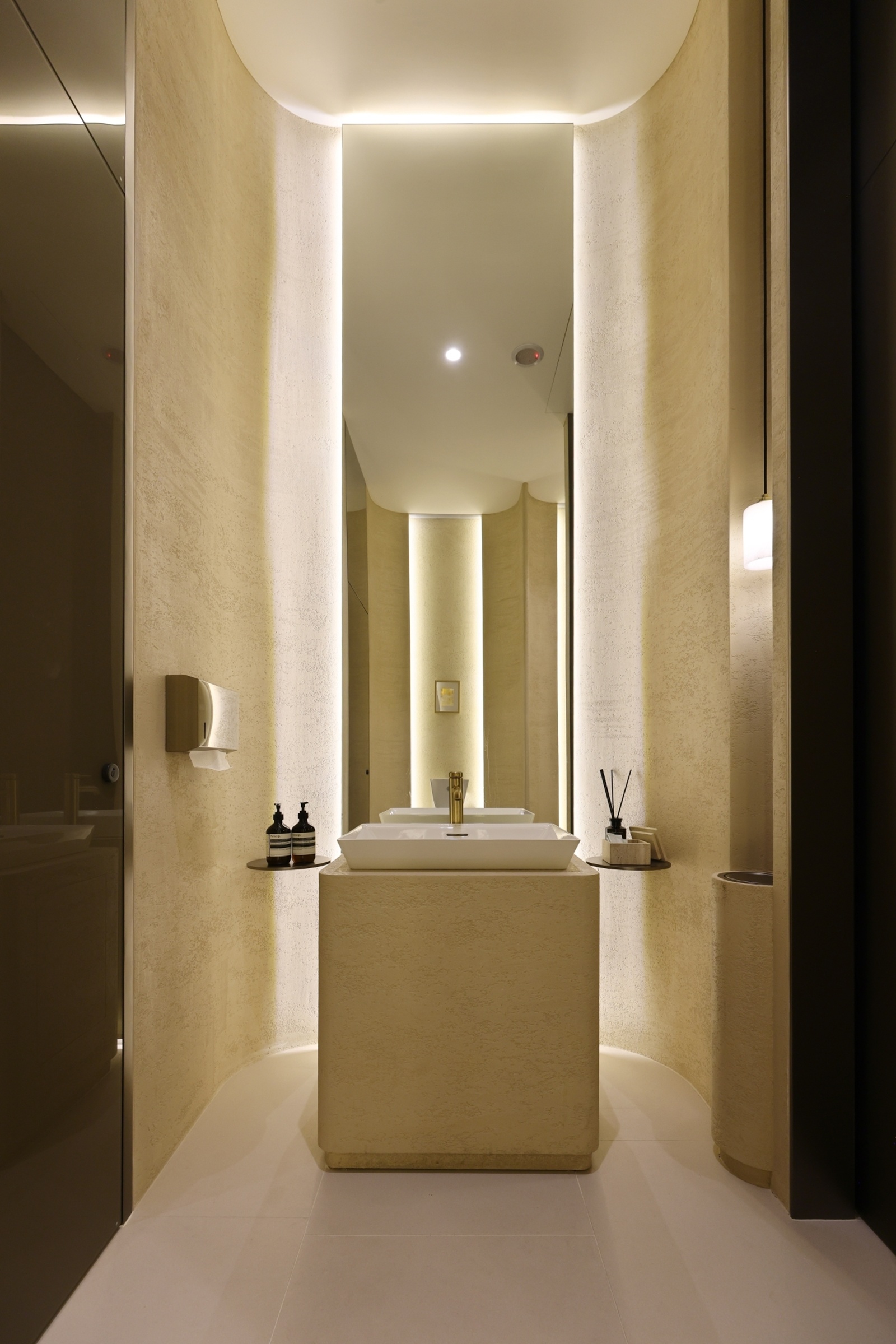 外觀設計以融入城市景觀和藝術品味為發想。團隊巧妙運用石材、玻璃、金屬、曲牆與隱藏式燈光等元素,表現「柔和光影」、「流線美學」和「自然交融」的概念,藉此彰顯自然環境與城市、居民共生共榮的和諧意象。另外,空間佈局是採漸進式分區設計,主要是利用石材、地毯、磁磚等材質差異劃分場域,以維持空間寬敞、動線流暢。