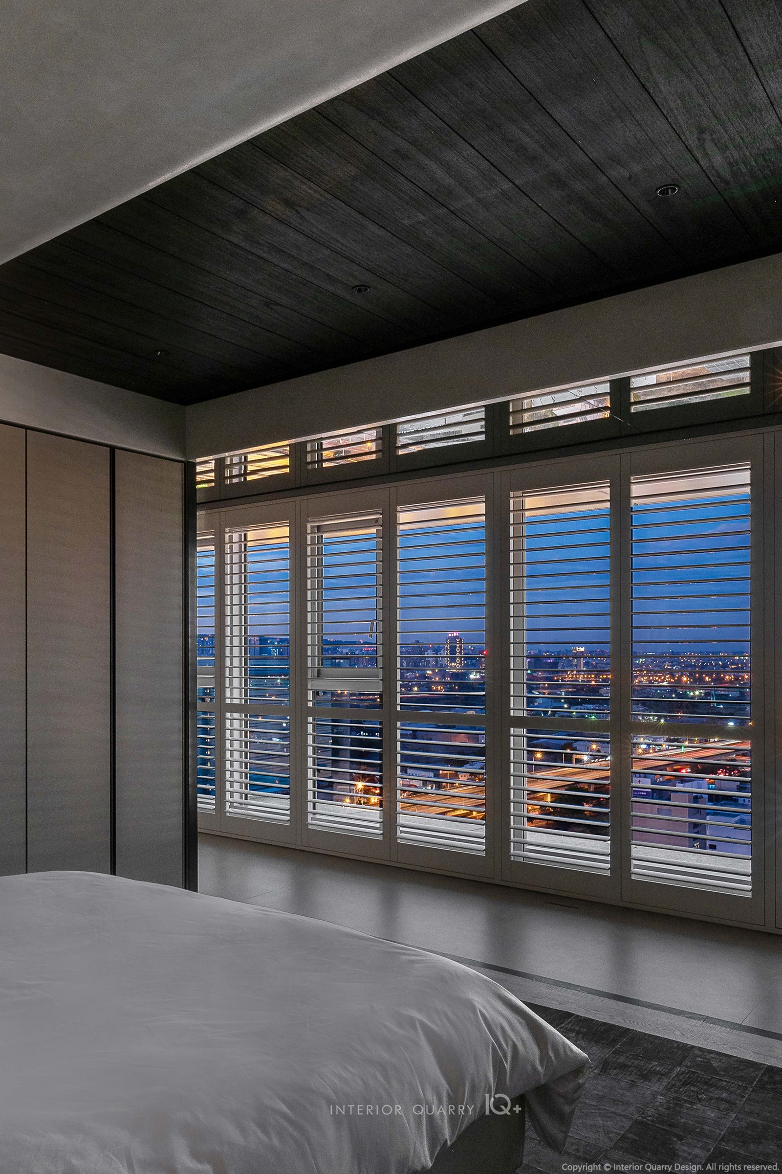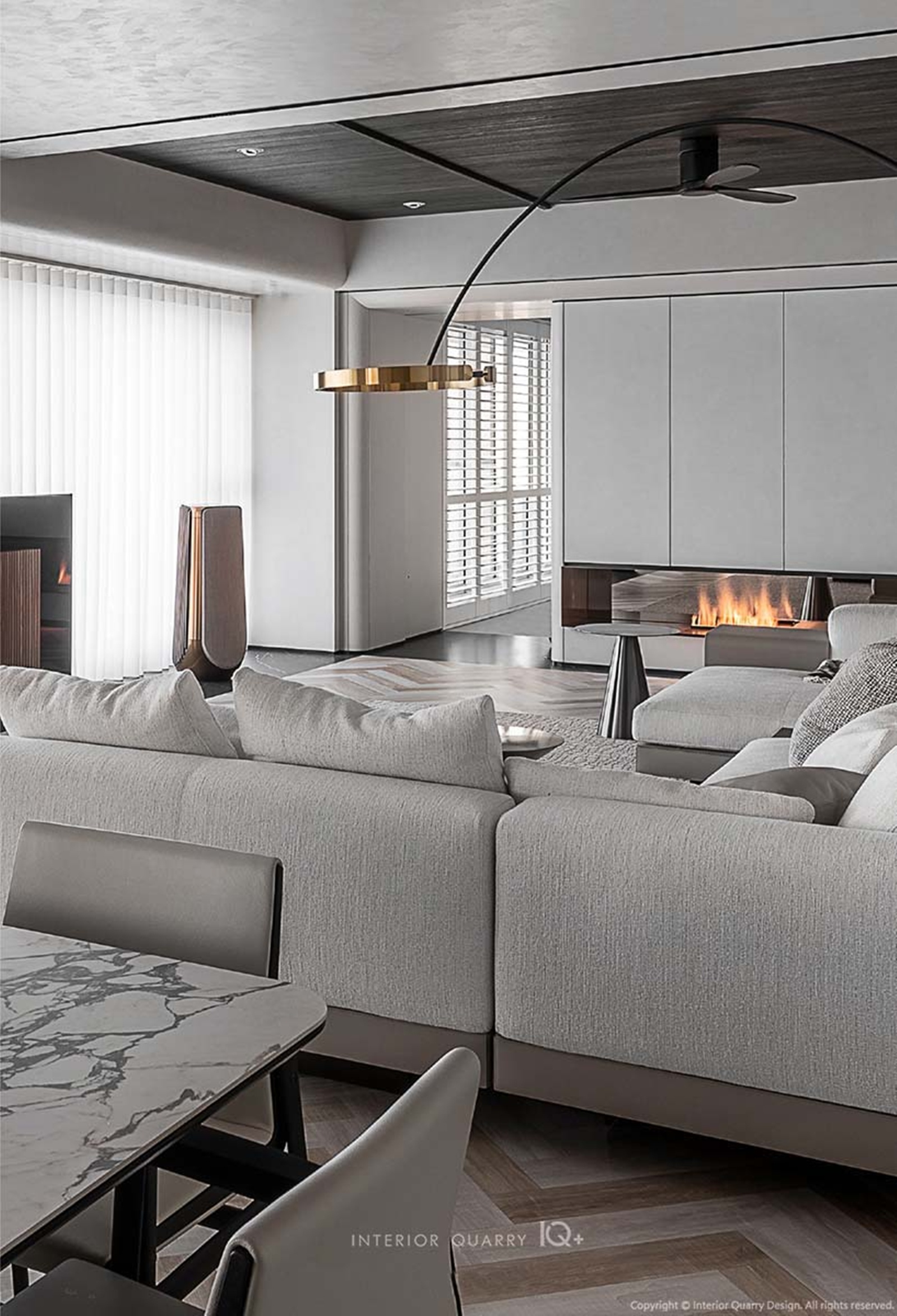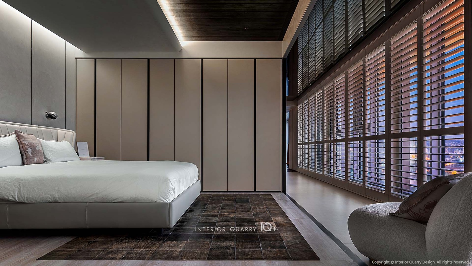 一踏進屋內,映入眼簾的是自然光由落地窗灑進公領域中。天花板採用木質格柵、藝術水泥、彩紋漆與金屬面,巧妙地將溫潤愜意與時尚質感相揉合,調配出層次多元的空間感受。選用圓弧線性落地燈,搭配如漣漪紋理的地毯,兩者烘托出一股動態感。走向用餐區,恰如片片花瓣的燈飾懸掛於餐桌上方,增添一絲浪漫雅緻。設置整面百葉落地窗於廊道旁,不僅讓陽光能引進更衣室,達到良好的採光條件,亦讓居者享受窗外更迭的光景帶來的閒情逸致。緩步移動至臥房,以弧形元素導入空間,結合柔和的燈光,營造舒適愜意的氛圍,令居者得以放鬆身心。