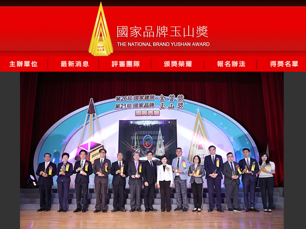 「國家品牌玉山獎」為全國最具指標性、最具公信力的企業品牌獎項,邀集產、官、學界專家共同評選。以審慎、公正的態度從研發、設計、品質、行銷、管理…等多面向評估,並以產業的發展、就業機會及公益回饋作考量,甄選出最具競爭力之傑出企業、最佳產品、最佳人氣品牌、傑出企業領導人等,表彰其傑出表現。
