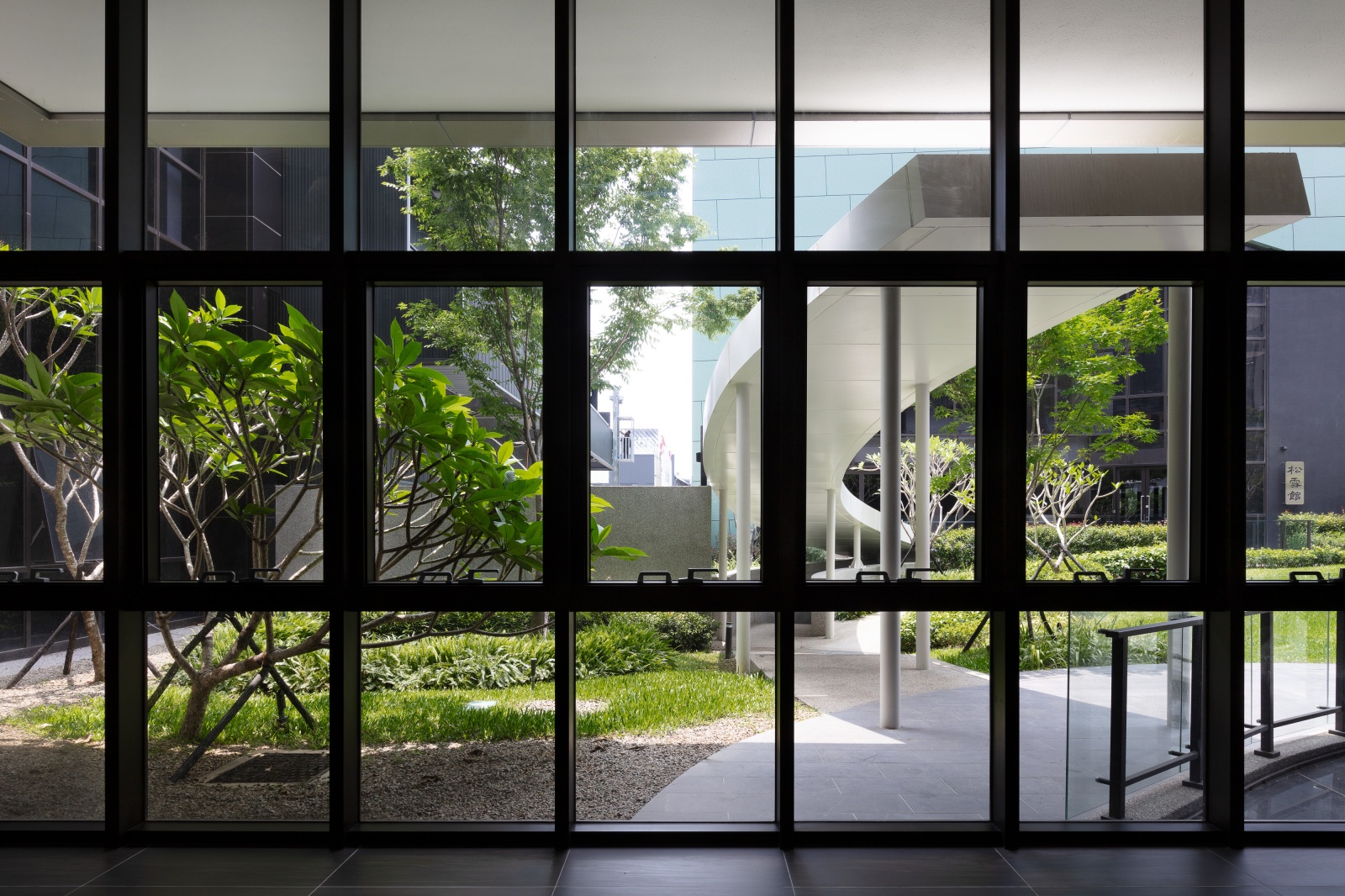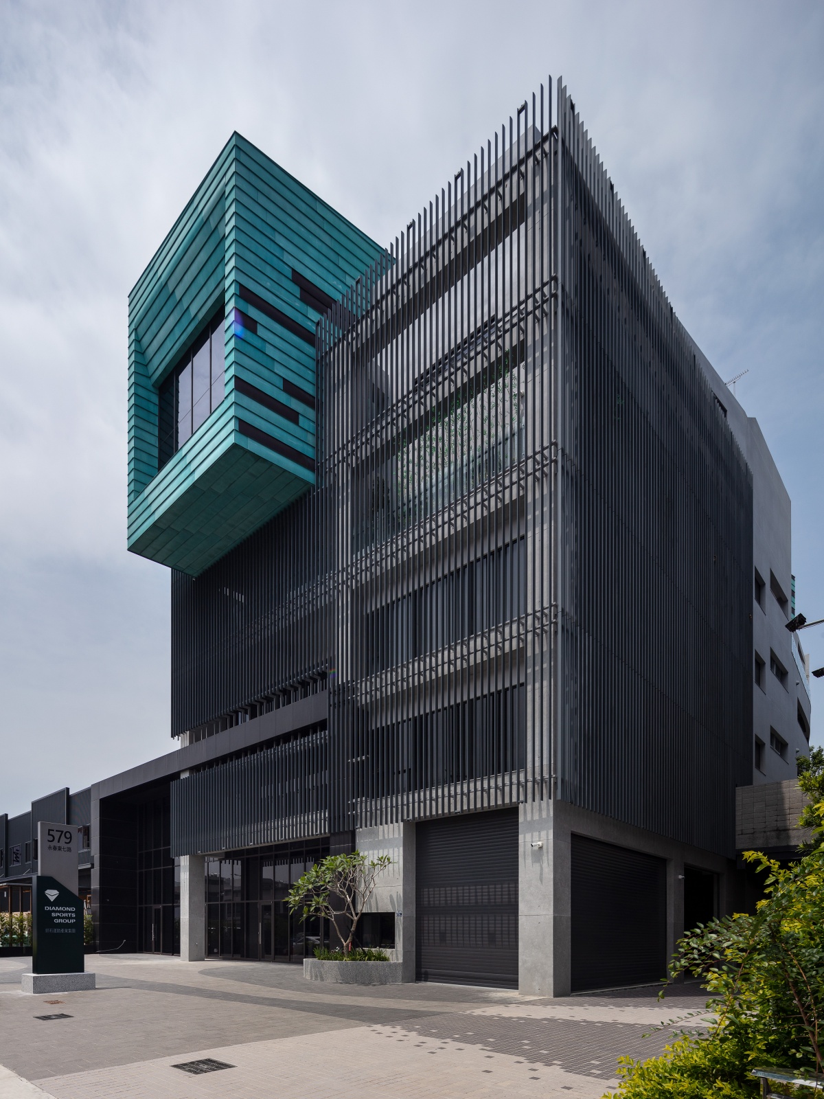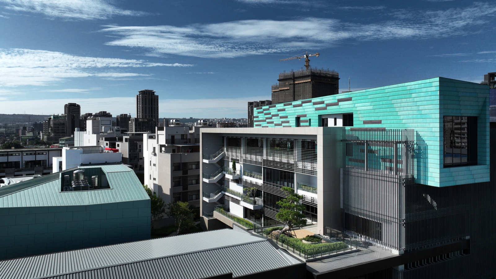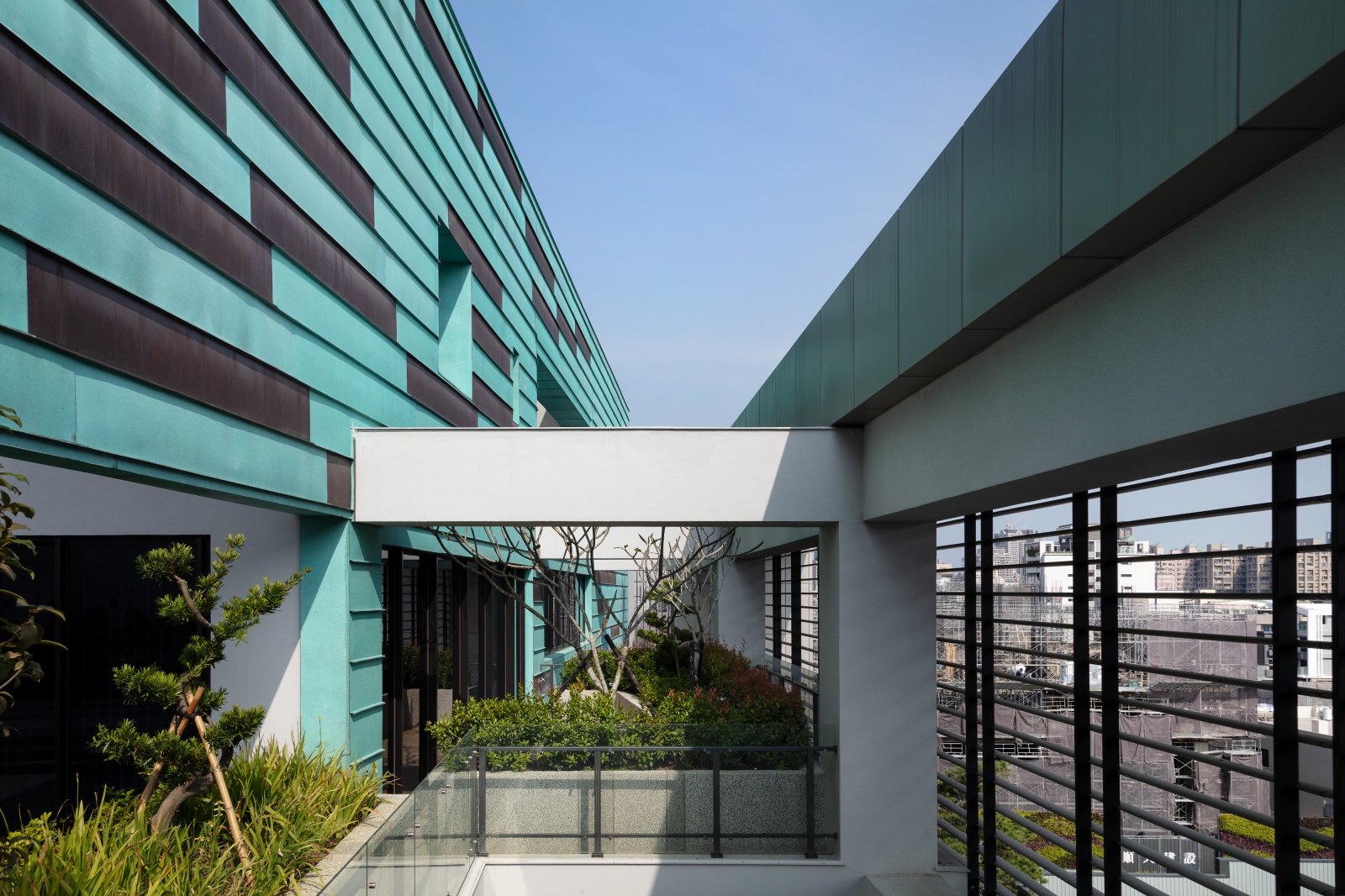 鑒於南、北兩棟建築基地存在地形高低差、量體大小有別的情形。為此,團隊將南棟建築的一樓規劃為半地下的空間形式,利用地形差異,將自然光和風引進兩棟建築之間,並產生回流。建築南向的立面,每層樓皆有留設露台以栽種綠樹,為員工們提供休憩的絕佳場所,讓繁忙的生活節奏獲得片刻喘息。在兩棟建築之間,團隊是採迴廊設計做連接,其形成的無限迴圈路線,象徵了優質企業生生不息的意象。其中,迴廊所圍塑的完整綠地與自然而然形成的順斜坡,既能予人享有沉浸式的綠意氛圍,還能提供流暢的行走動線。