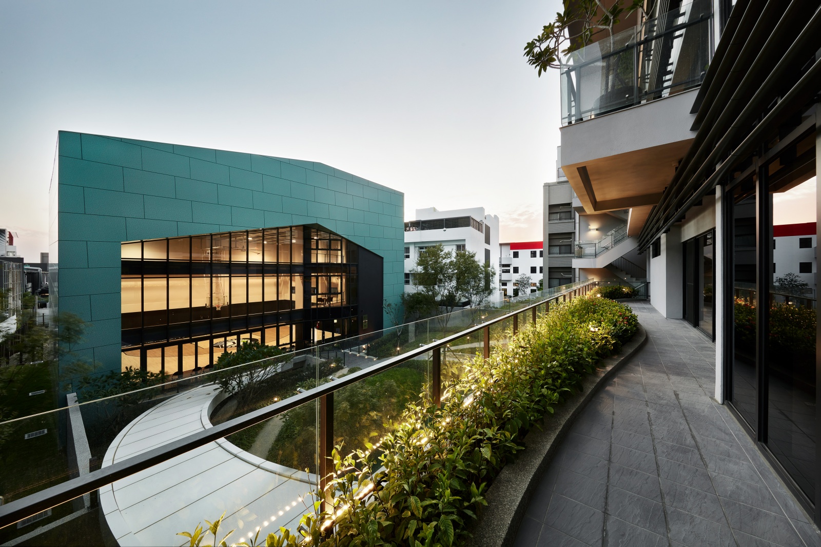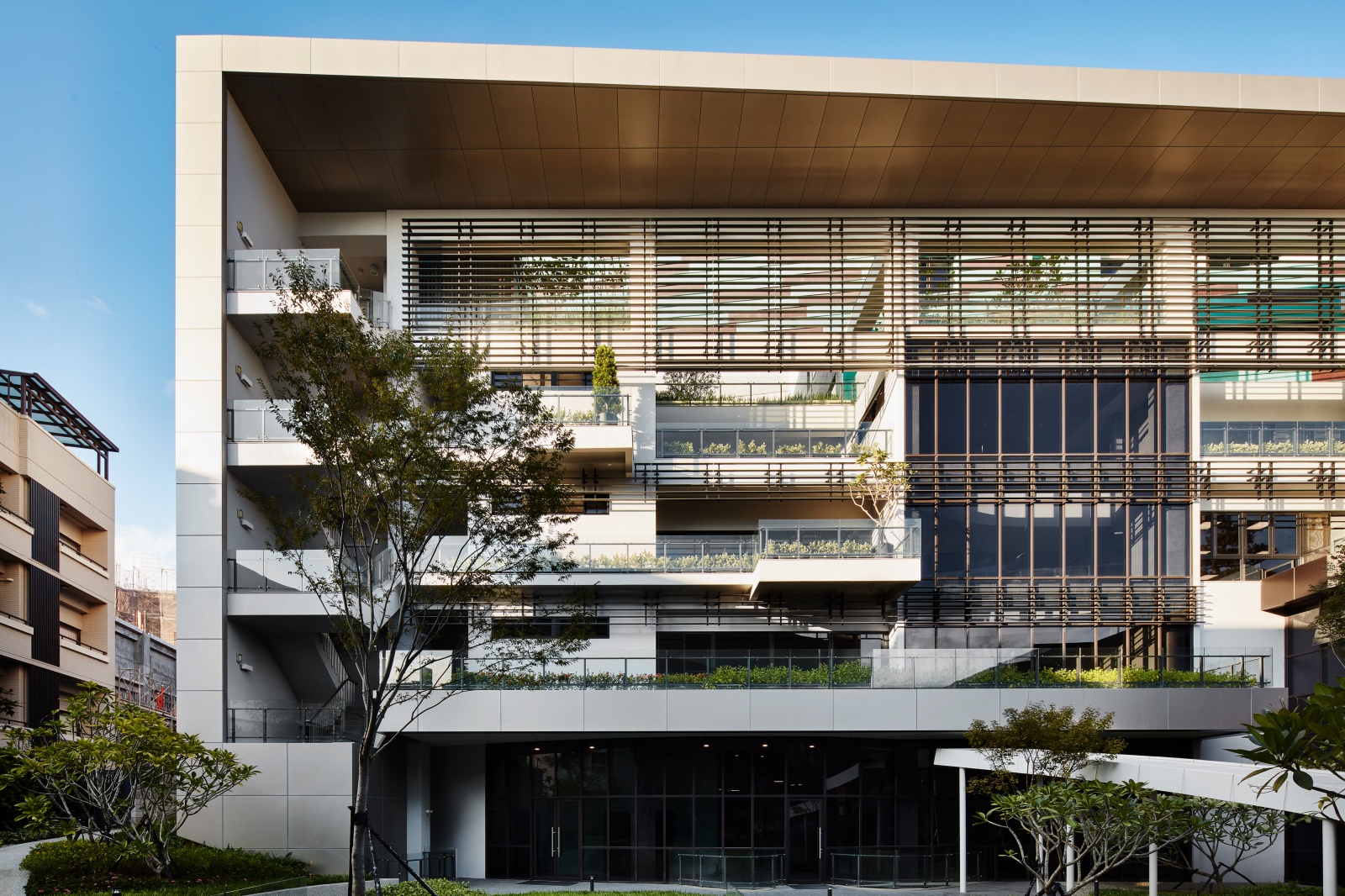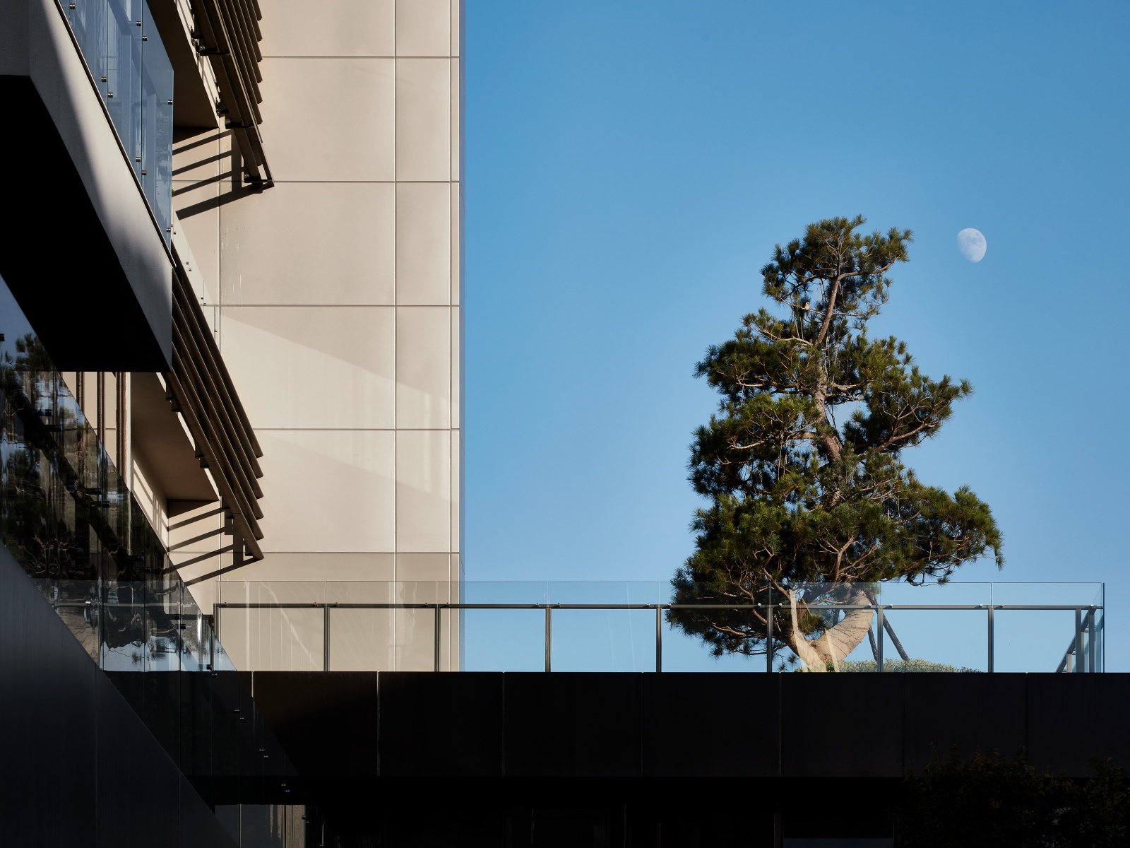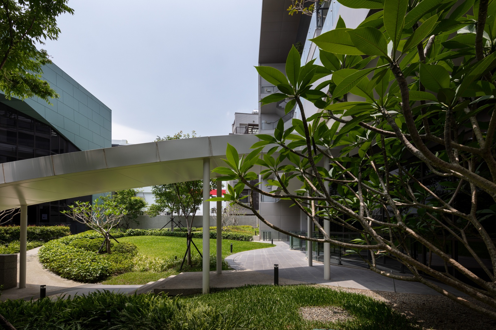 鑒於南、北兩棟建築基地存在地形高低差、量體大小有別的情形。為此,團隊將南棟建築的一樓規劃為半地下的空間形式,利用地形差異,將自然光和風引進兩棟建築之間,並產生回流。建築南向的立面,每層樓皆有留設露台以栽種綠樹,為員工們提供休憩的絕佳場所,讓繁忙的生活節奏獲得片刻喘息。在兩棟建築之間,團隊是採迴廊設計做連接,其形成的無限迴圈路線,象徵了優質企業生生不息的意象。其中,迴廊所圍塑的完整綠地與自然而然形成的順斜坡,既能予人享有沉浸式的綠意氛圍,還能提供流暢的行走動線。