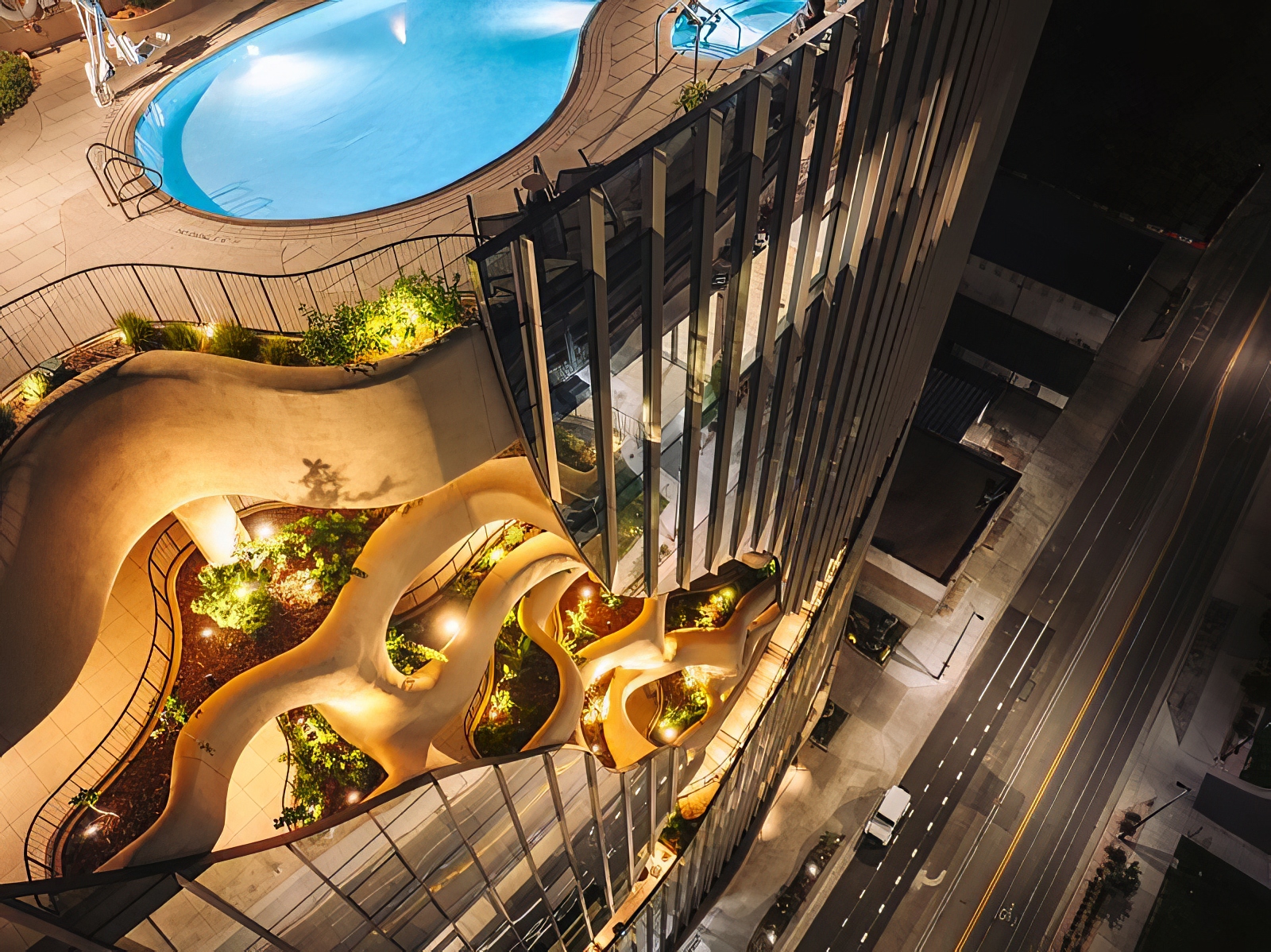 在這裡,建築不再僅僅是容身之所,而是一個與環境互動的垂直社區。建築成為自然的延伸,住戶的生活被重新定位於都市與自然的交界處。無論是清晨透進玻璃幕牆的光線,或是傍晚穿梭其間的微風,都讓人在鋼筋水泥之中找回一份內心的平靜與自在。這不只是一棟公寓,更是一場關於城市與自然共生的實驗。