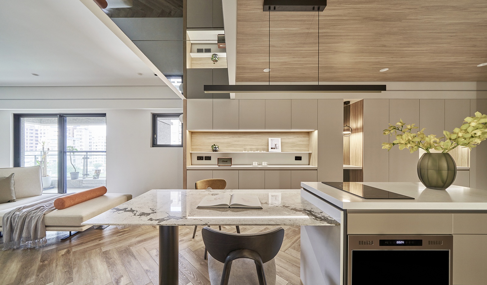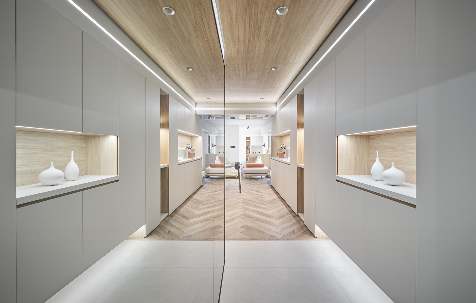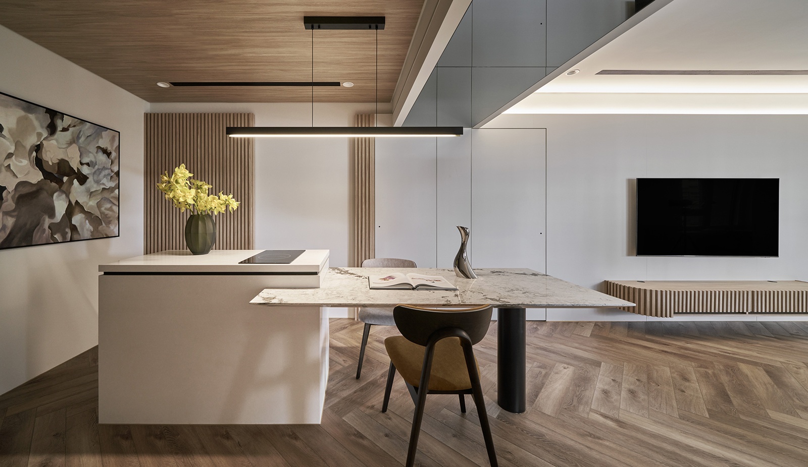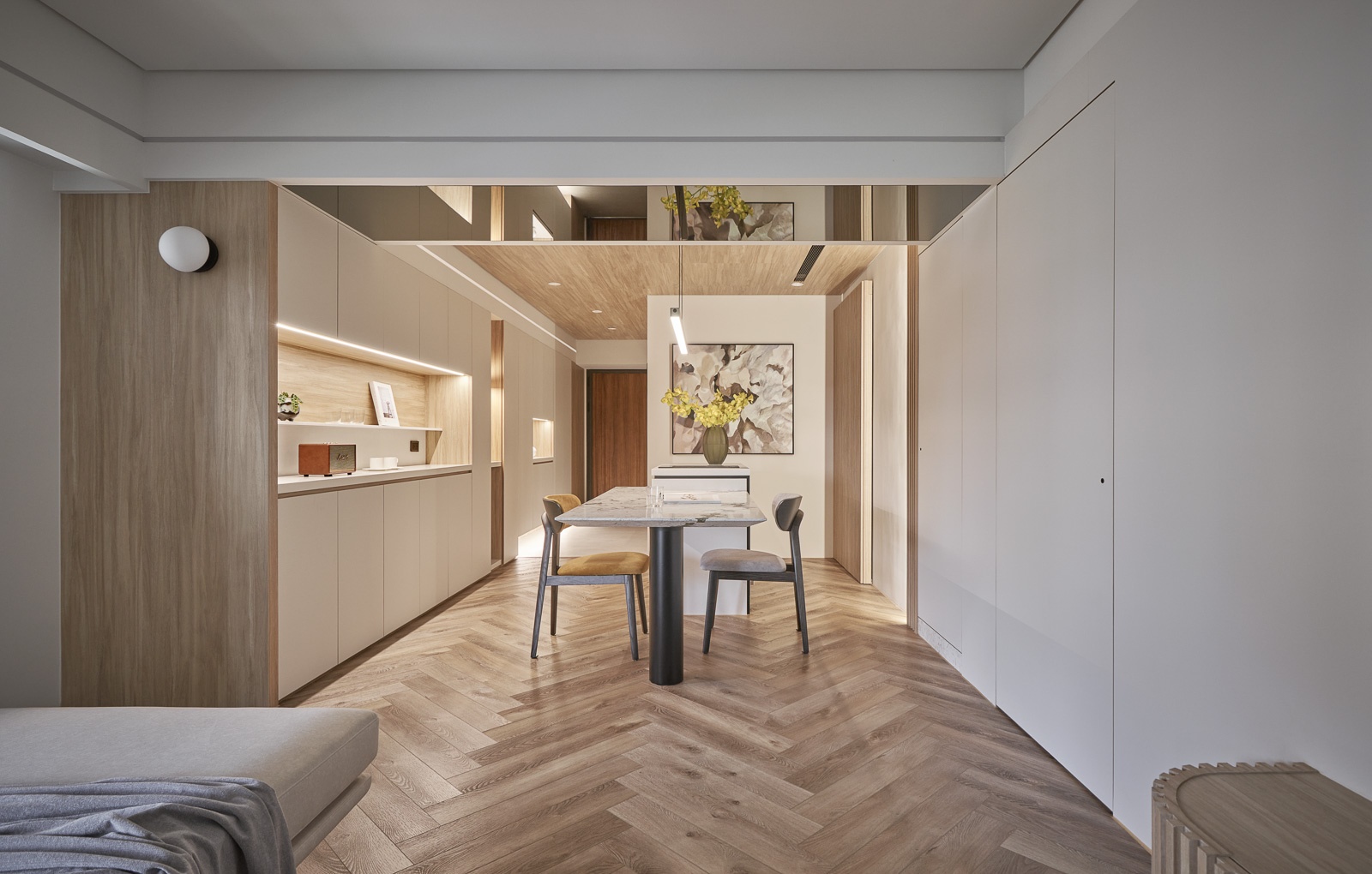 設計不以隔間劃分空間,而是建立一套連續的視覺序列。橫向上,自玄關進入,近景為端景與收納立面,中景延展至客餐廳,遠景則收於書房,使視線層層推進;縱向上,透過雙層天花與環繞燈帶整合,修飾低樑尺度並重塑空間比例。