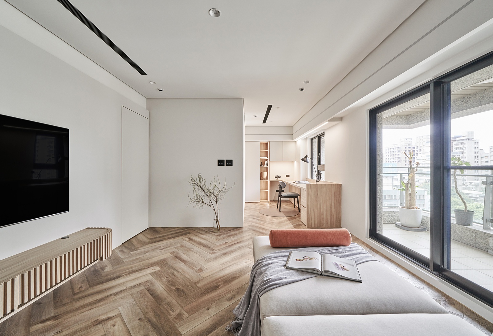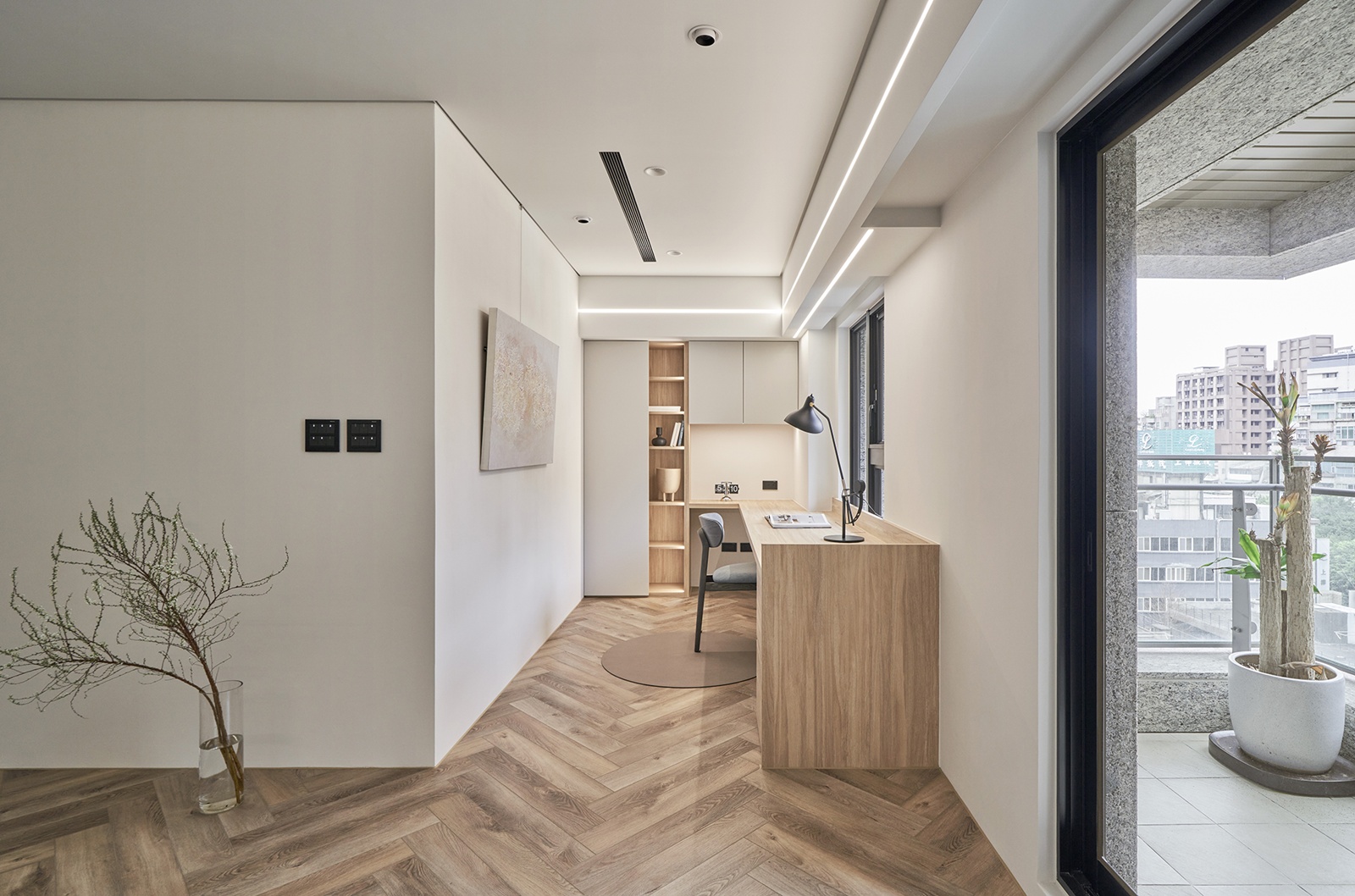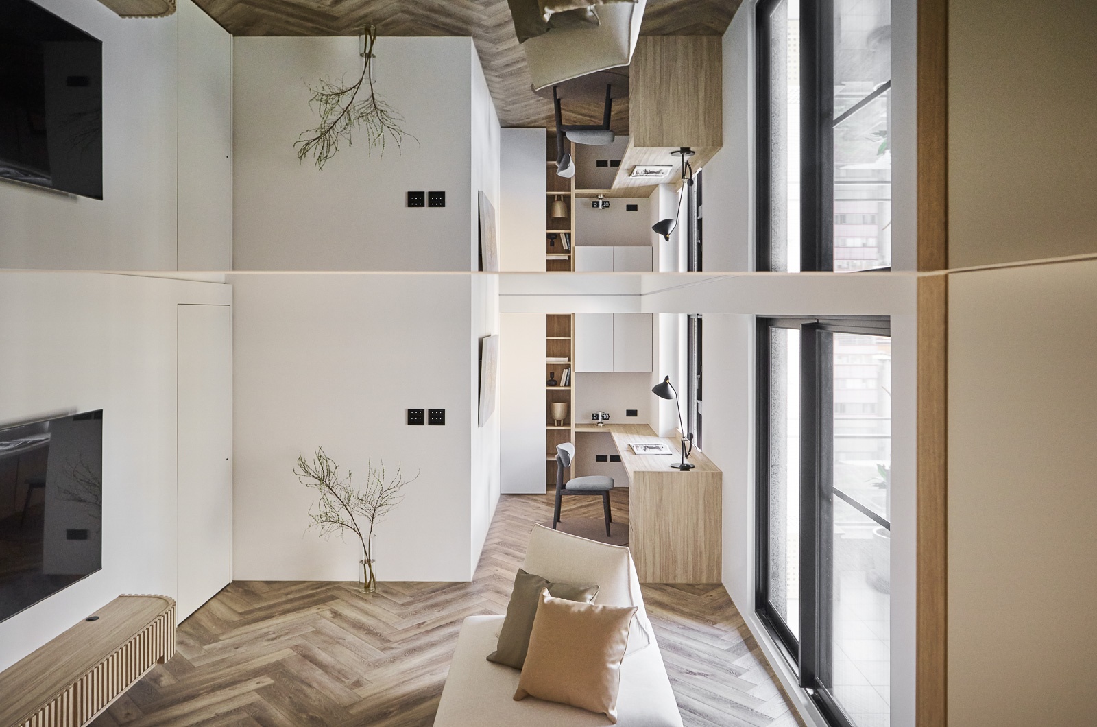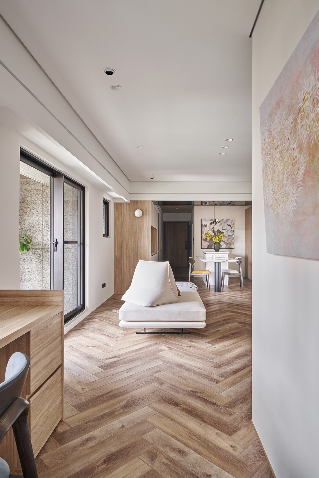 本案為都會女性住宅,在面積與樓板高度受限的條件下,設計不再追求形式堆疊,而以「化整為零」作為核心策略。透過立面整合、視覺層序與比例調整,將原本破碎的格局,重新組織為流暢而有秩序的生活場域。全室採用一致的材質語彙,並藉由細節變化與不對稱構圖,在簡潔中建立層次,呈現內斂而平衡的空間表情。