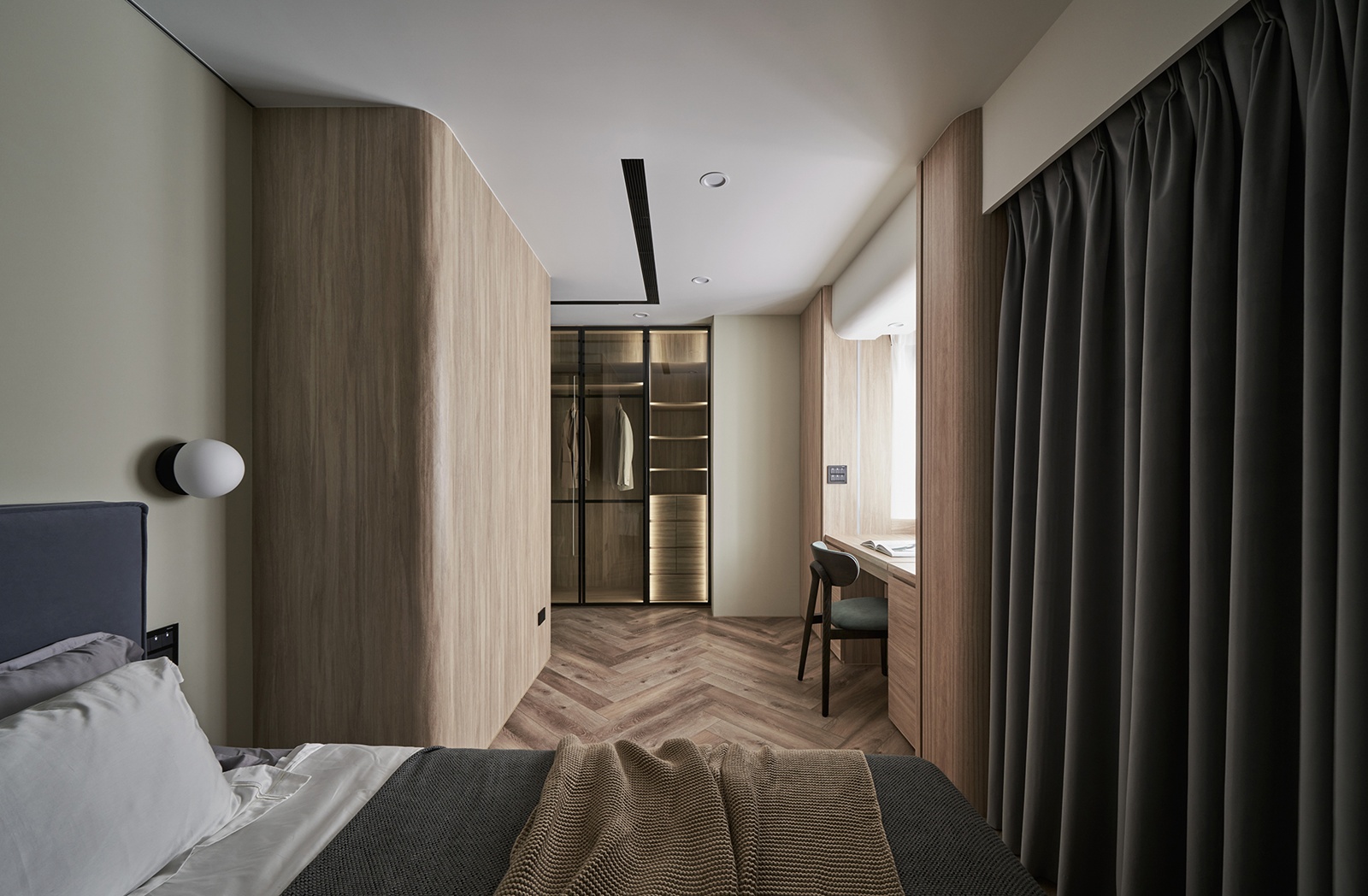 私領域以動線遞進與隱私為重點,主臥透過更衣走道銜接書桌與睡眠區,曲線語彙柔化樑柱量體,床尾蛇簾作為柔性隔間,在有限尺度中兼顧收納與放鬆氛圍。