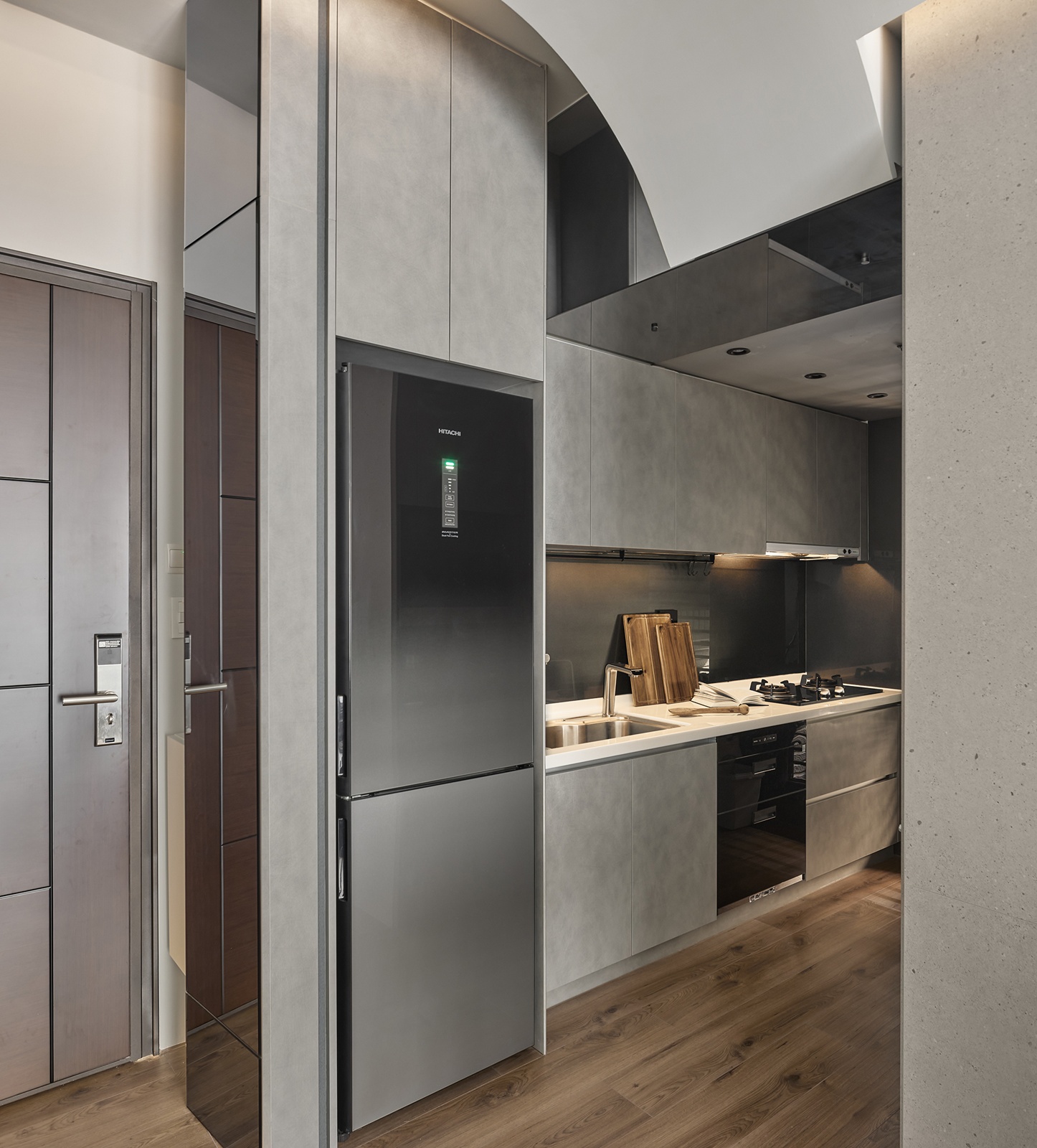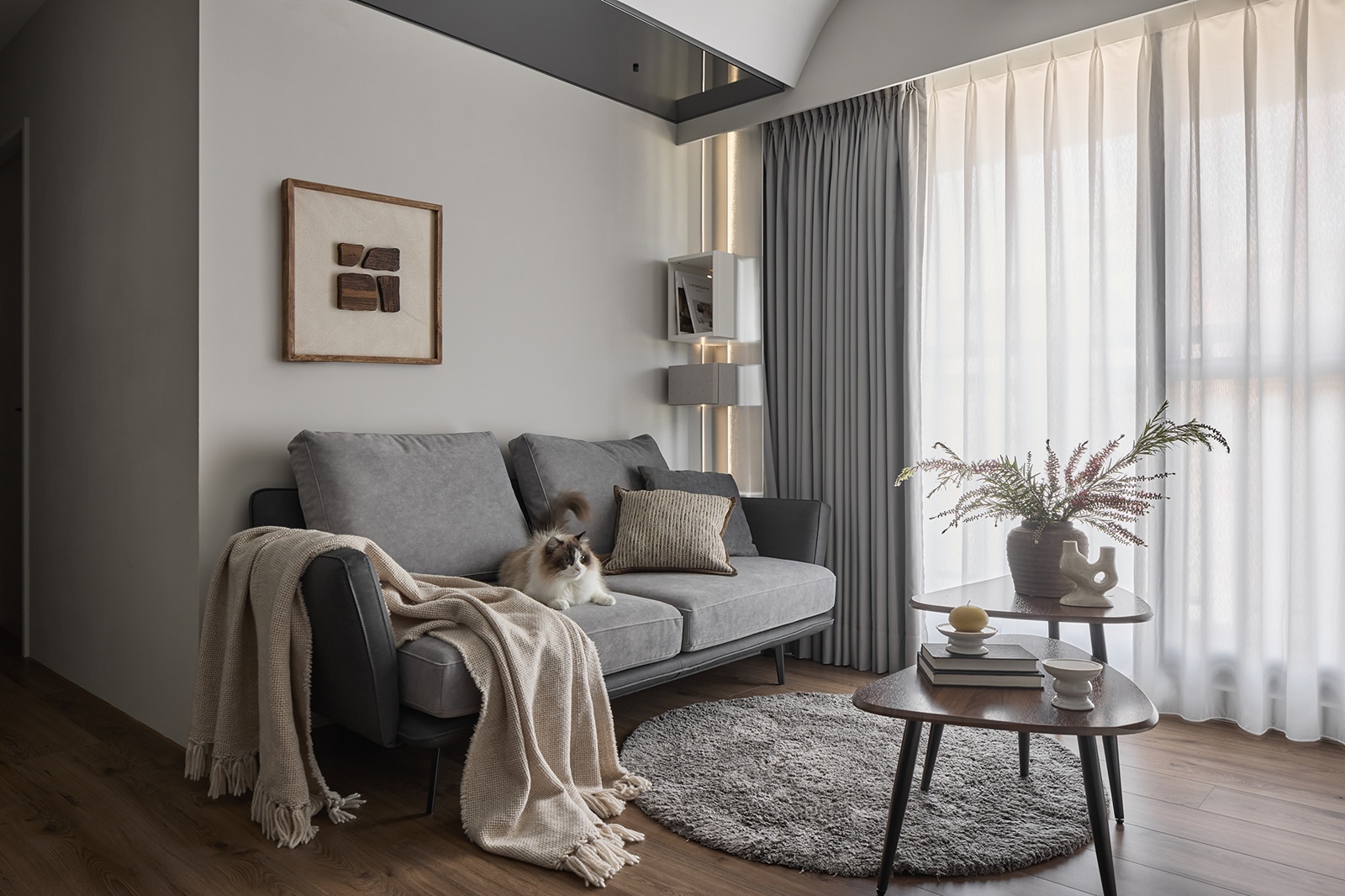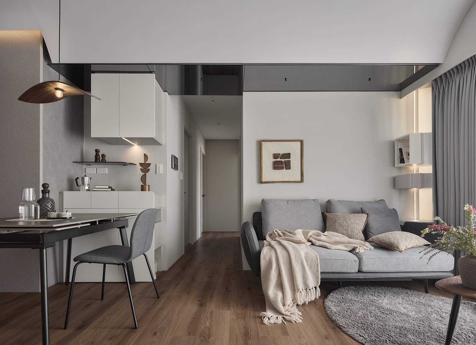 本案以屋主的生活個性為核心,在有限面積中構築兼具現代簡約與細膩層次的居所。屋主偏好低調沉穩卻帶點時尚的氛圍,透過木質、藝術塗料與灰白色階等中性色,使空間展現理性與感性的平衡。設計中大量運用幾何線條,透過弧形天花、圓弧立面與俐落的櫃體線條,營造出剛硬與流動並存的開闊場域。