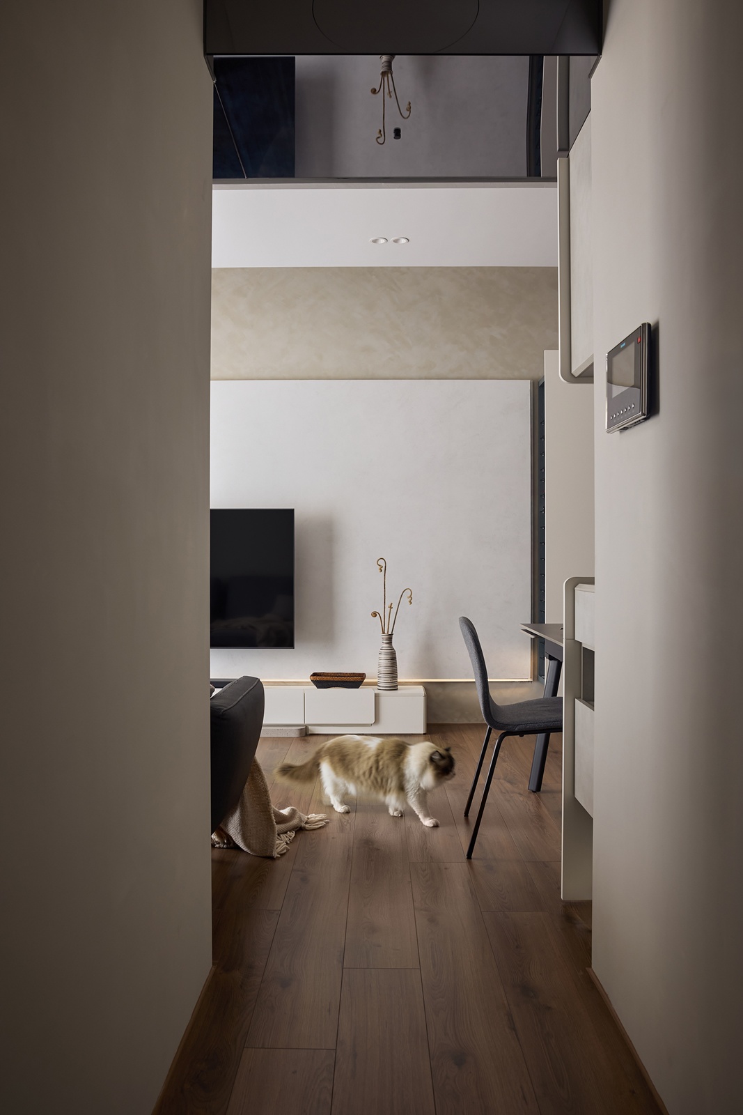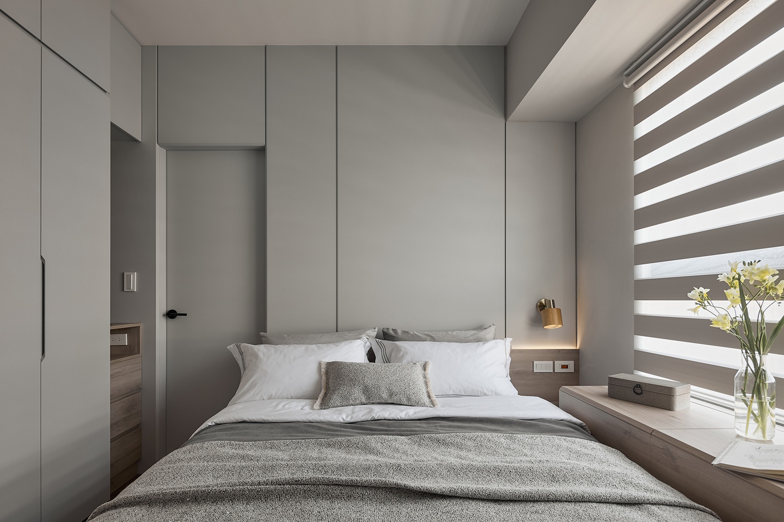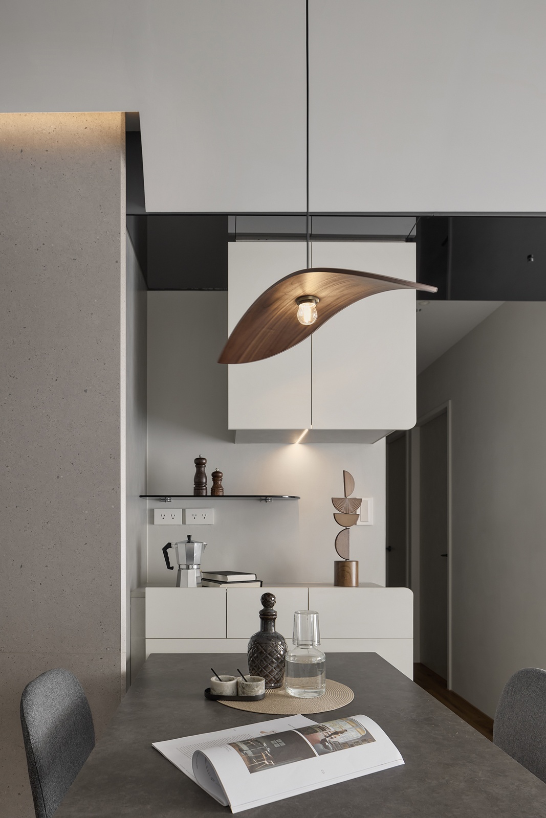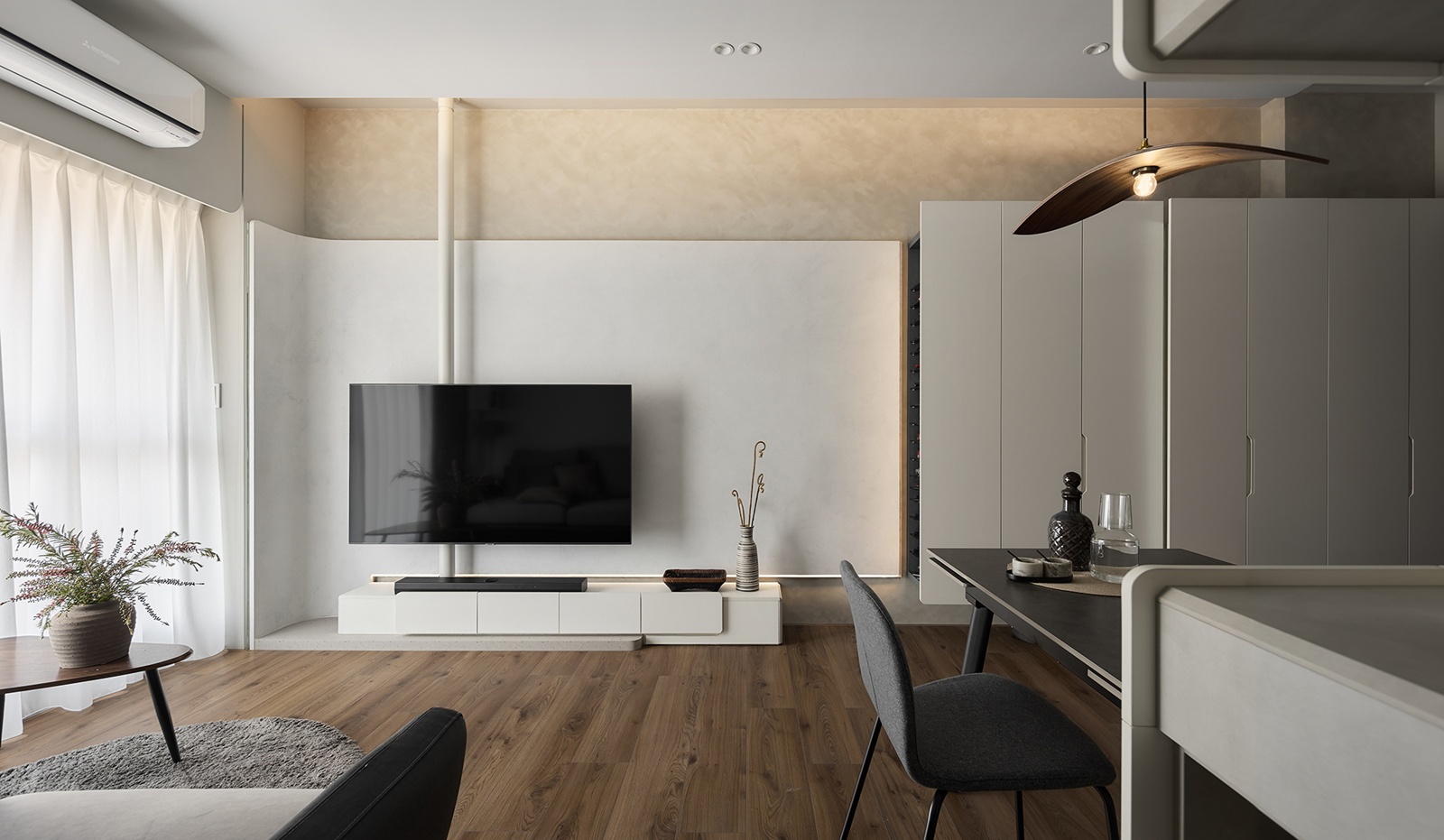 公領域以流暢動線串聯客廳、餐廳與廚房,呈現開放格局。廚房以灰調櫃體整合電器設備,維持介面的俐落純粹;餐區以餐桌分隔場域,並透過延伸的潔白平台與收納櫃提升實用性。客廳沙發旁角落設置簡潔層架,結合垂直燈光線條,為牆面勾勒雕塑感畫面。電視牆以曲面造型結合石材底座,搭配旋轉電視架,創造多向度體驗。臥室延續簡約基調,將門、牆與衣櫃統一材質色調,搭配木質床邊櫃、百葉簾與黃銅燈具,營造俐落且溫潤的氛圍。