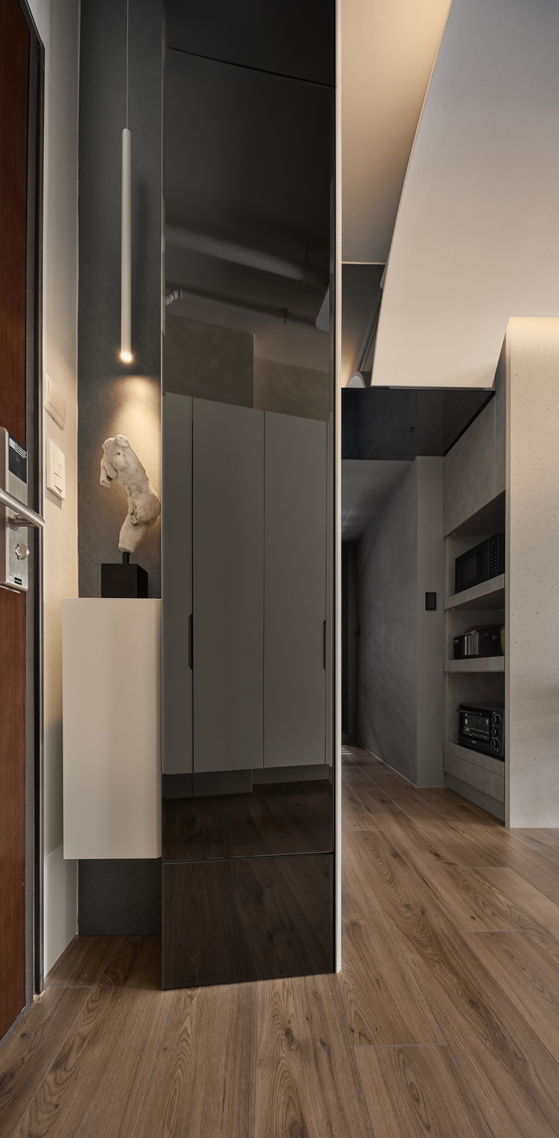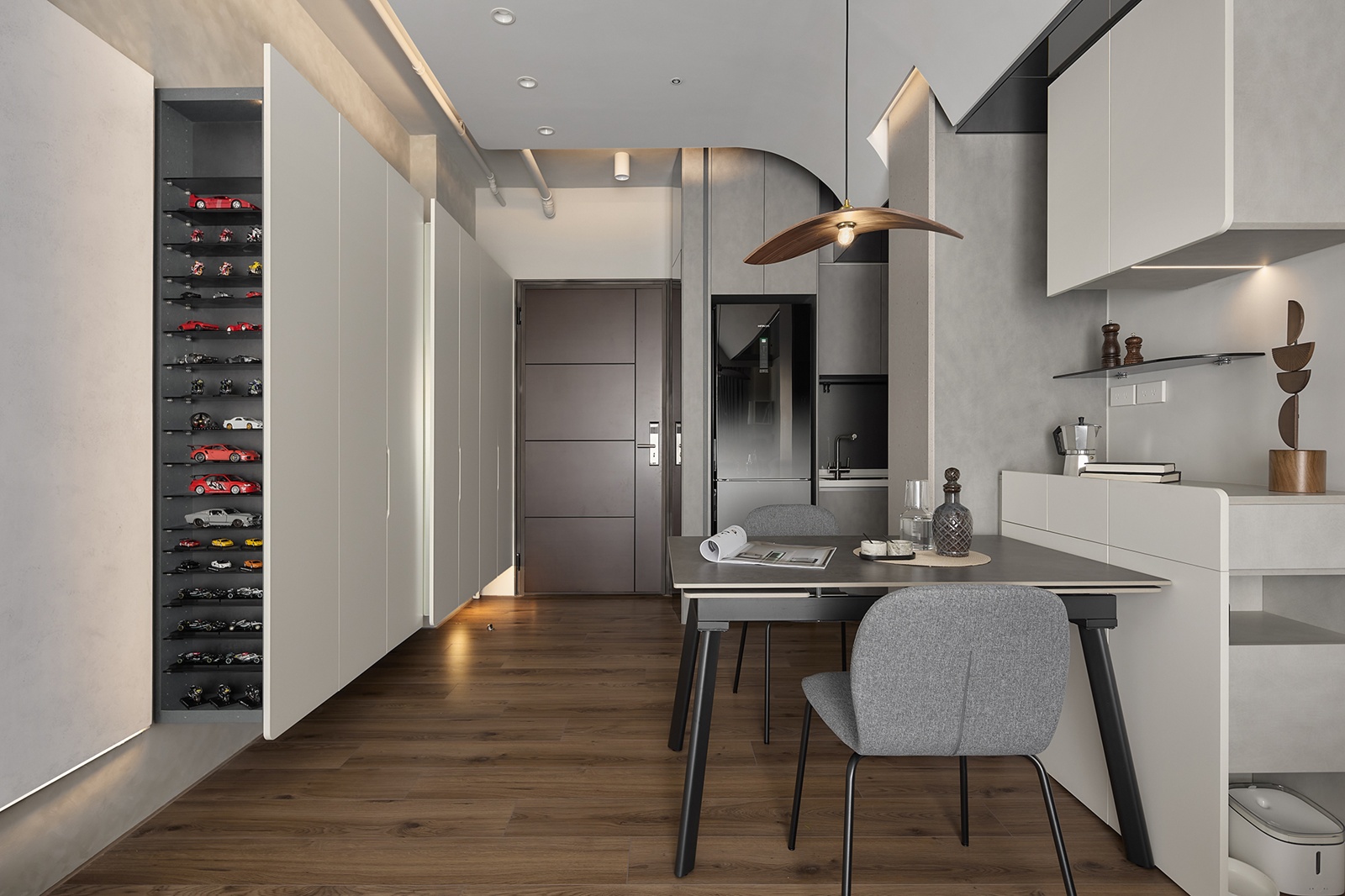 走進室內,玄關一側以小型灰鏡化解視線避免直面廚房;另一側的大面積收納櫃一路延伸至客廳。櫃體尾端嵌入開放玻璃分格,展示屋主的精緻收藏,於日常轉場間巧妙流露品味。