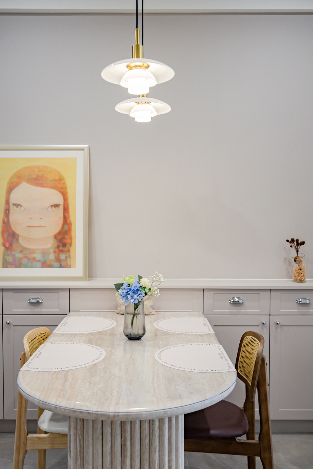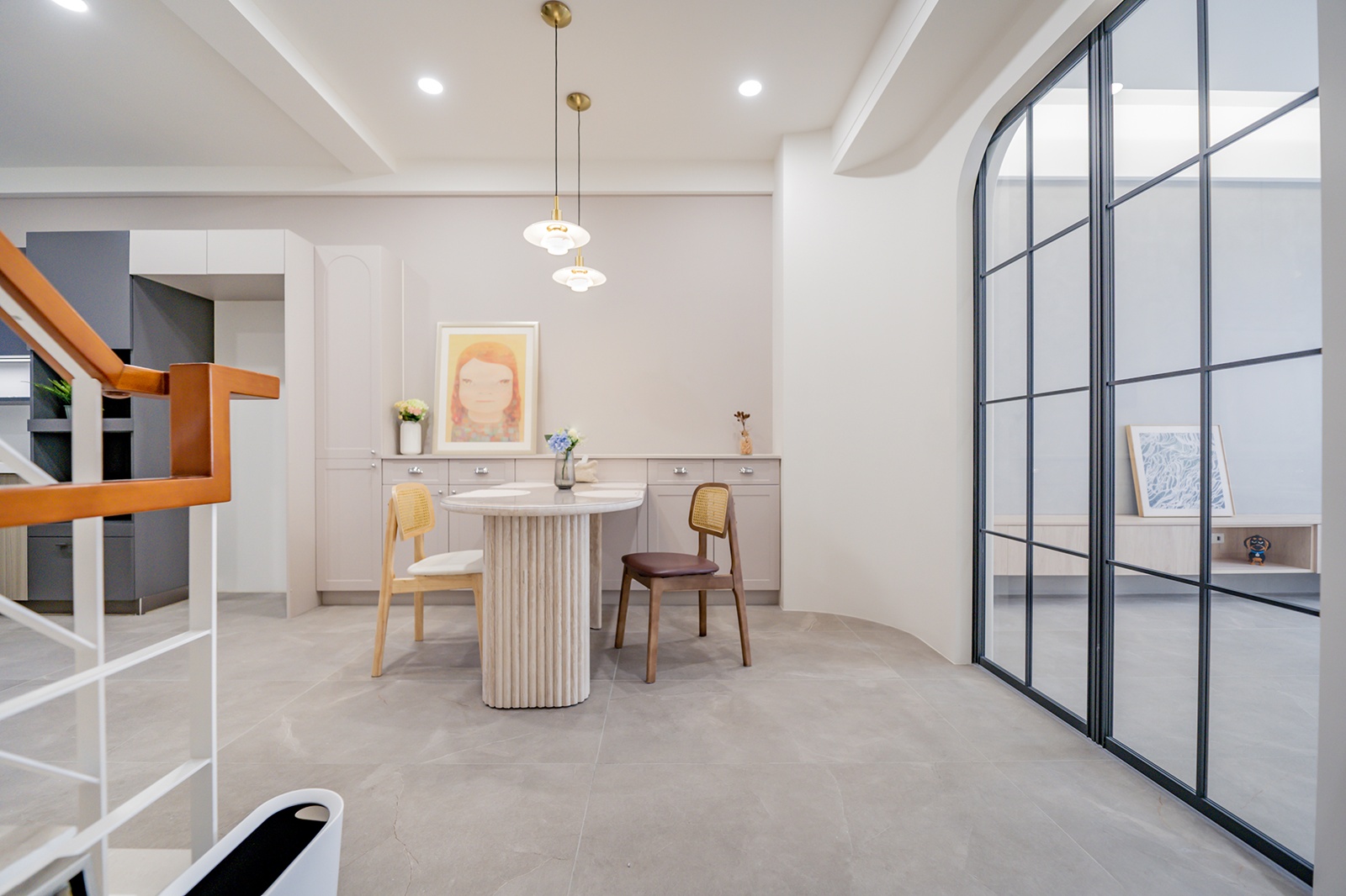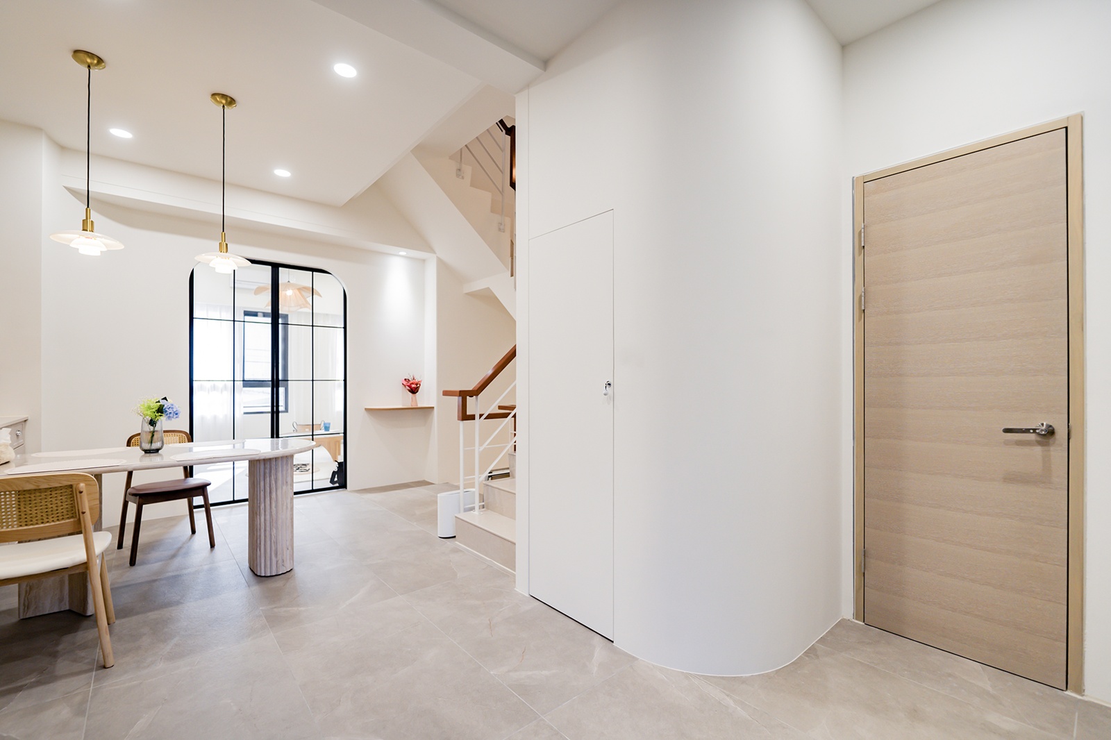 一樓入口以弧形牆體結合端景,兼顧收納機能與迎賓儀式,作為室內外的過渡節點。二樓為主要公共層,設計刻意拆解動線,透過層次式分割,清楚劃分客廳、餐廚區與儲藏室,使各區域獨立運作而不相互干擾。客廳以圓拱門搭配線板牆面,延續法式比例語彙,並藉由反間照將立面向上延伸視覺高度。餐廳以柱型洞石餐桌確立用餐區域的重心,曲面線條順延至廚房,並將儲物空間整合於量體之中,形成連續而純淨的界面。