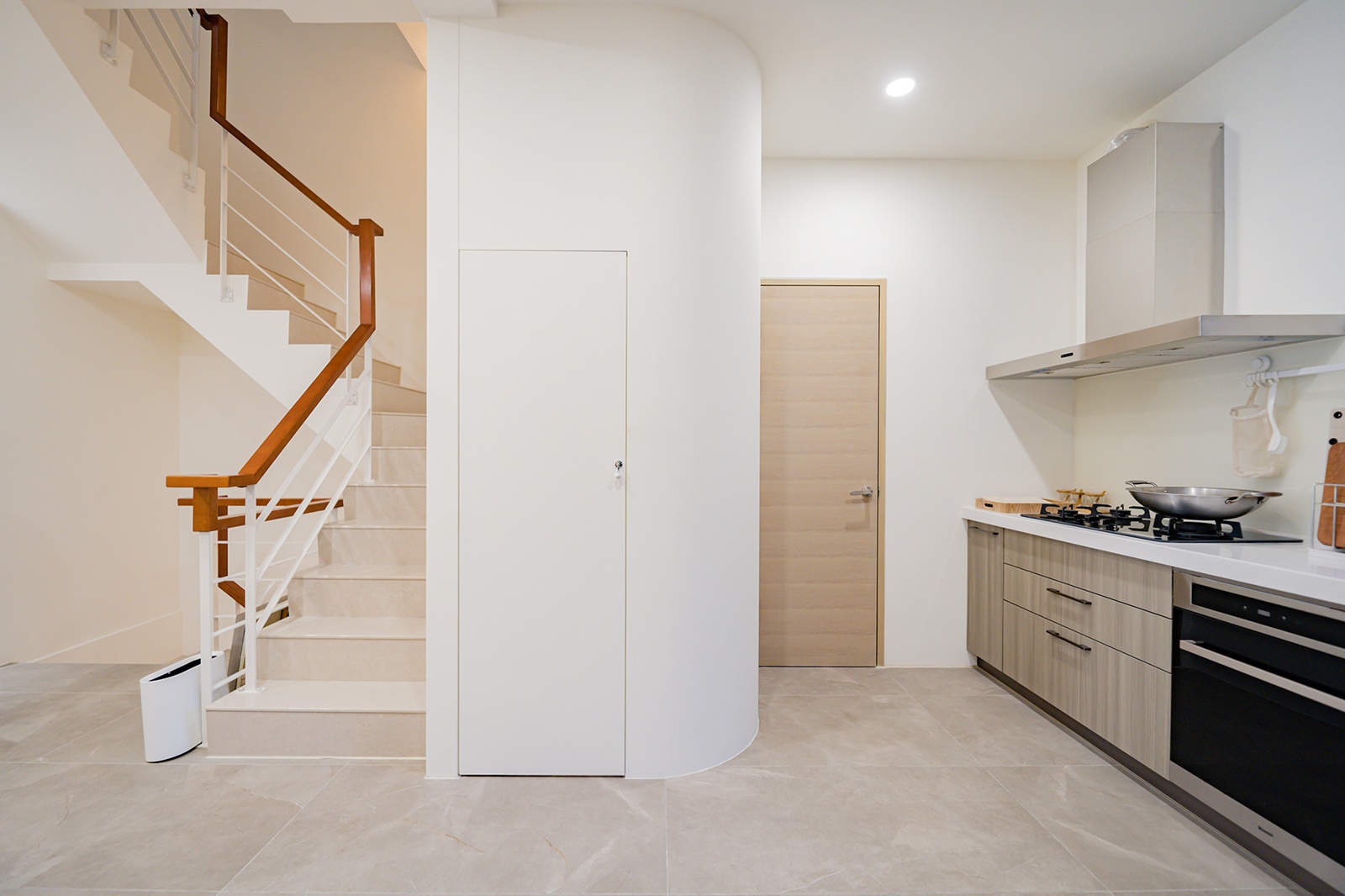 本案為透天住宅設計,以「輕法式」為核心概念,將法式裝飾性語彙轉化為空間比例與尺度的調整工具。整體以淺色木質與低彩度中性色建立基調,克制使用線板與圓弧元素,避免繁複修飾並回應法式對稱美學。圓弧不作為造型表現,而是落實於動線轉折、量體銜接與機能整合之中,柔化樑柱與牆體直角,降低視覺壓力,使場域在理性結構下保有溫潤、留白且耐看的生活樣貌。