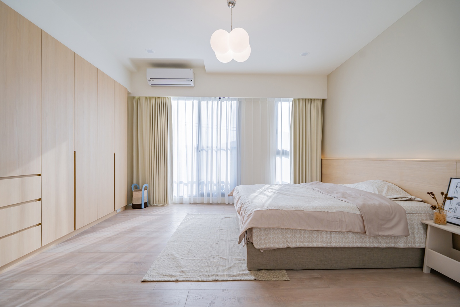 公共空間地坪採霧面石材,私領域則轉以木地板收斂觸感與情緒,牆面皆以米色與白色系延續,構成層次遞進的色階策略。主臥透過水平線條與柔和織品營造安定氛圍,女兒房則於天花板融入簡化雕花線板,保留法式細節而不流於裝飾。