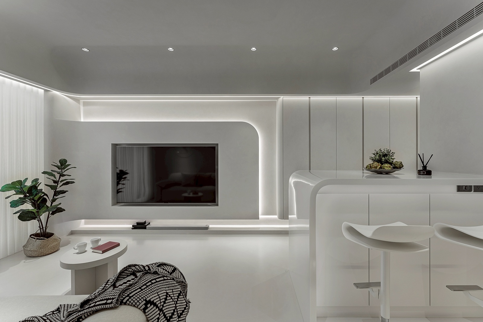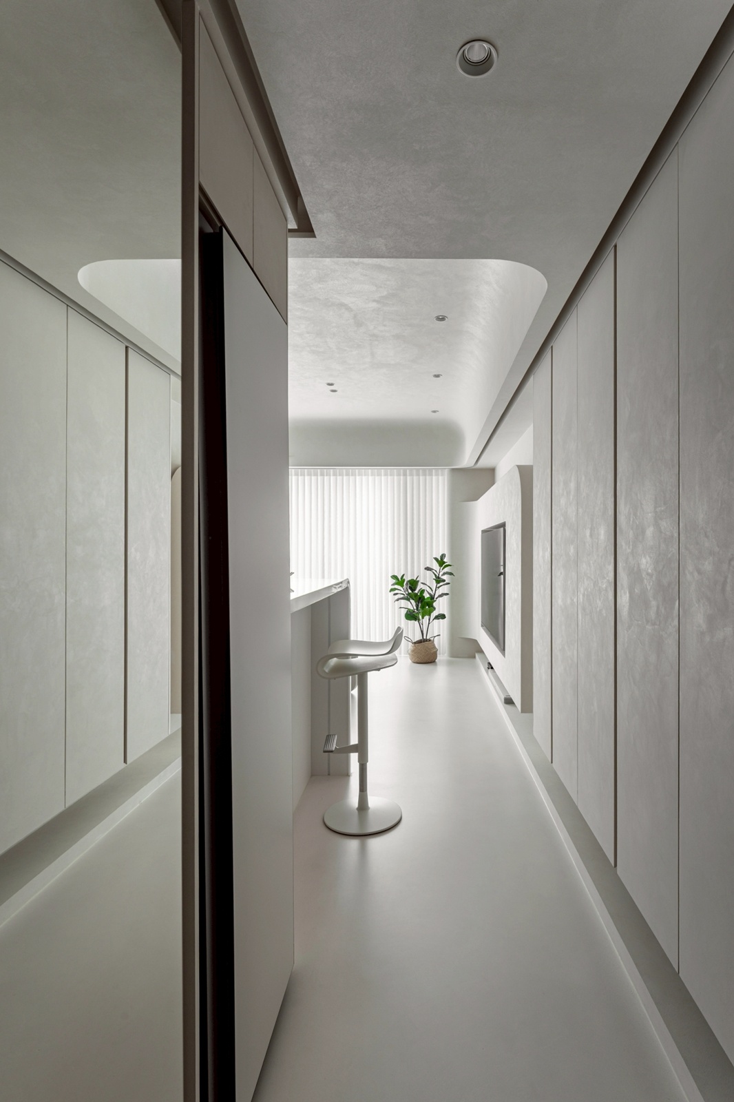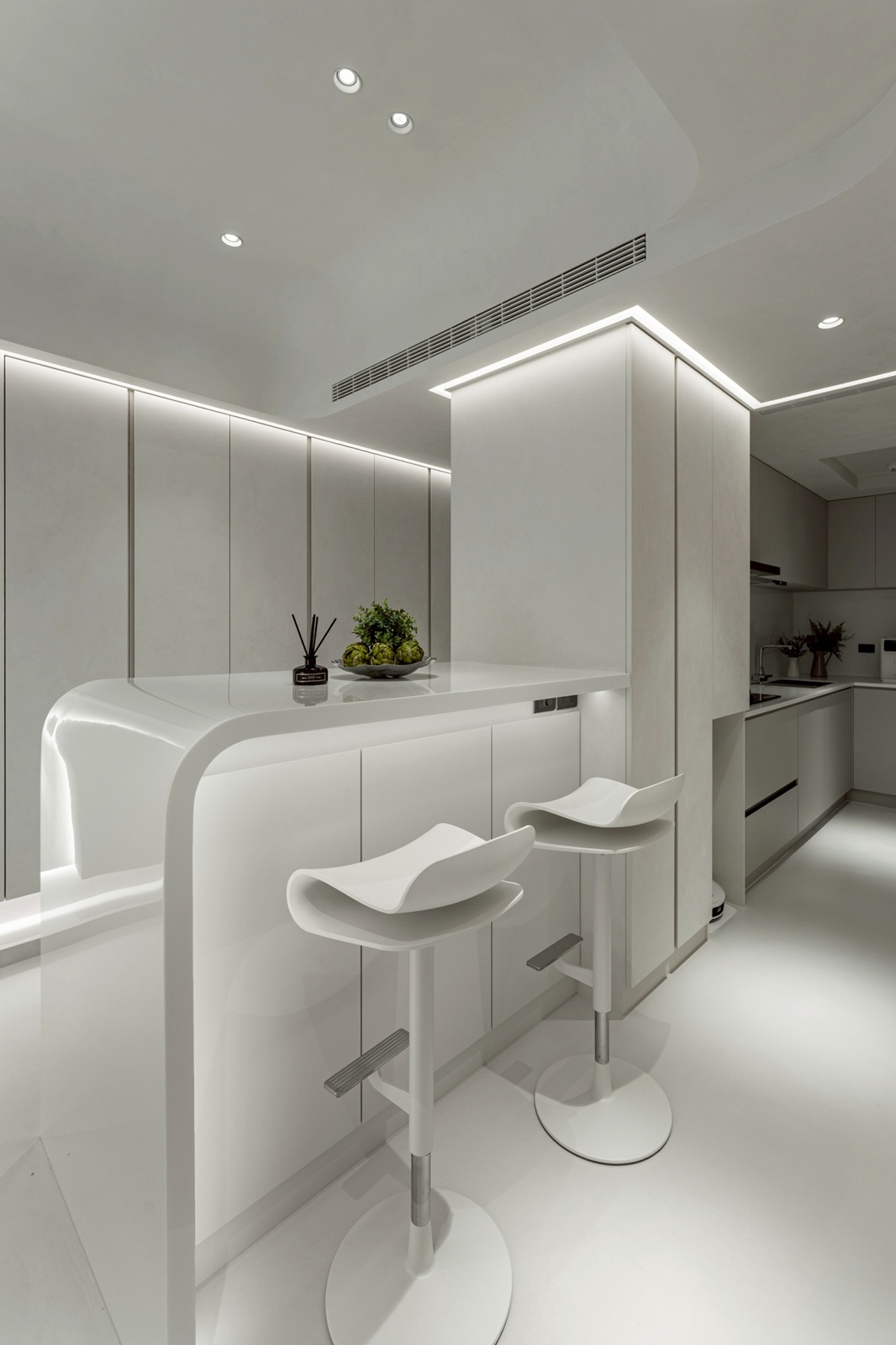 進入玄關後,動線引導至客廳與開放式餐廚區,整體以圓弧與線性元素串聯。客廳區域透過圓潤的天花與壁面設計,帶出寧靜舒適的氛圍。光帶沿結構轉角與壁面細膩佈局,提供多層次照明,呈現豐富的光影變化,並強化空間的立體層次。餐廚區域延續客廳相同的簡約色調,中島與廚具的配置除考量使用效率,也與周圍流線型設計相呼應,在視覺上保持一體性。臥室則延續主調,透過細節處的曲面處理與柔和照明,形塑出祥和的休憩環境,並營造包覆感與隱私性。