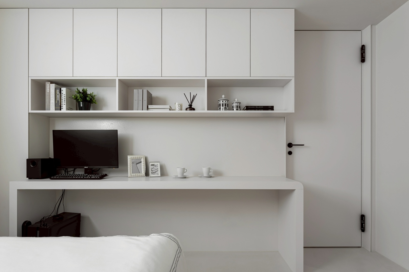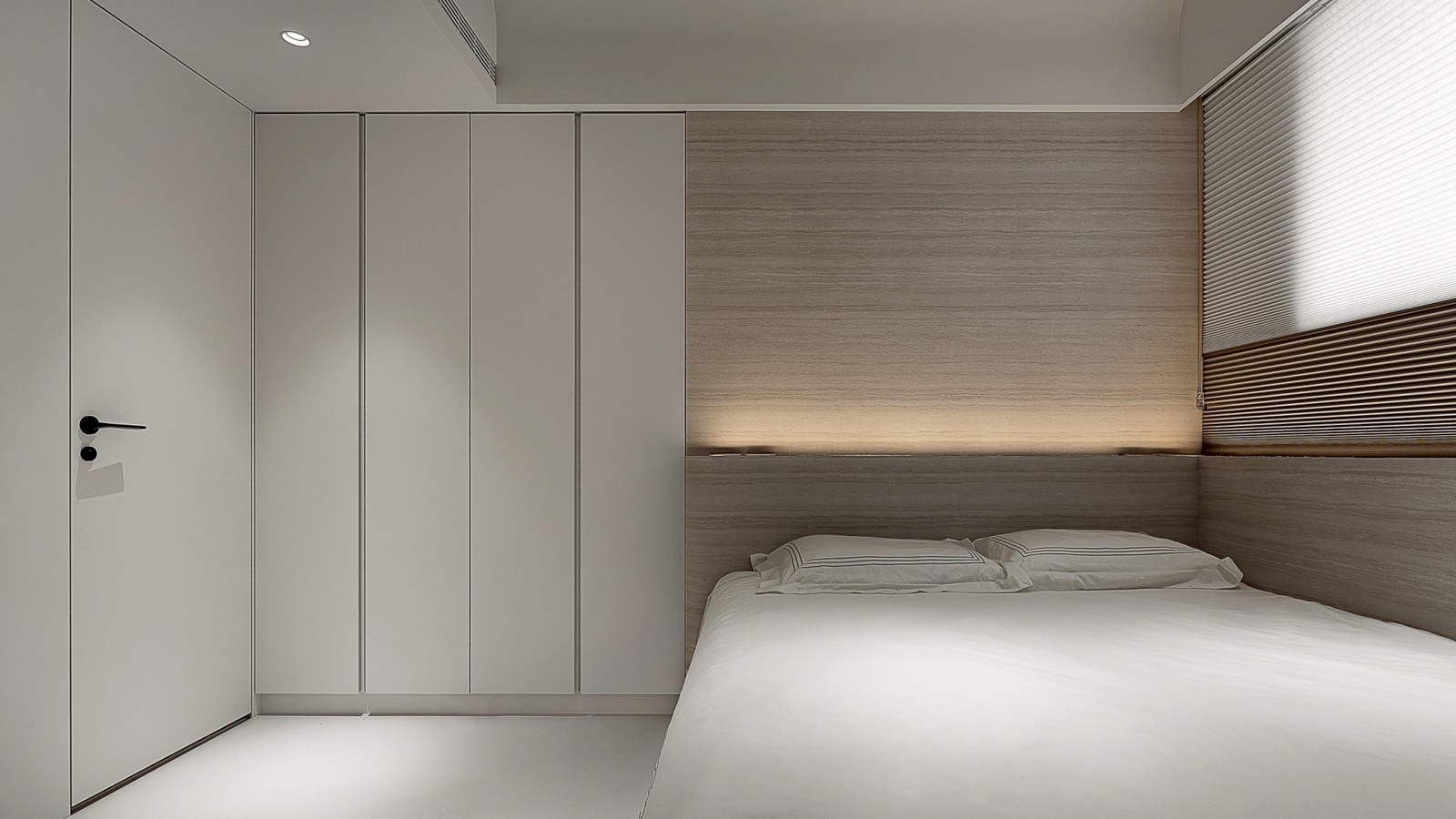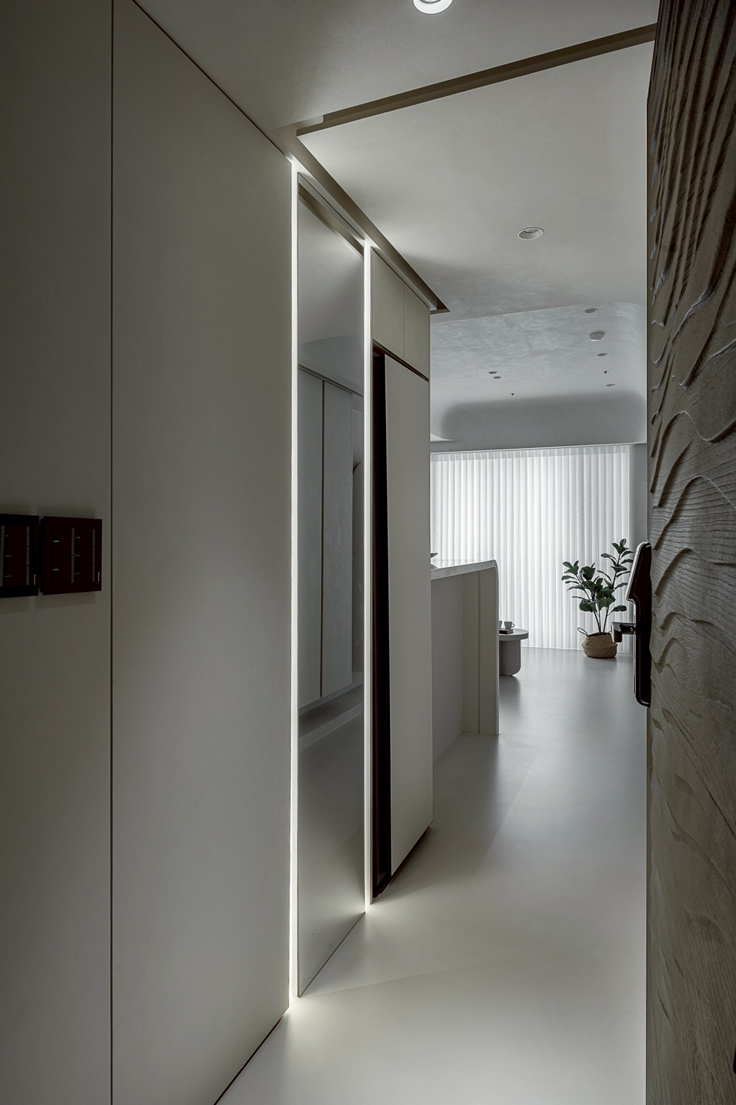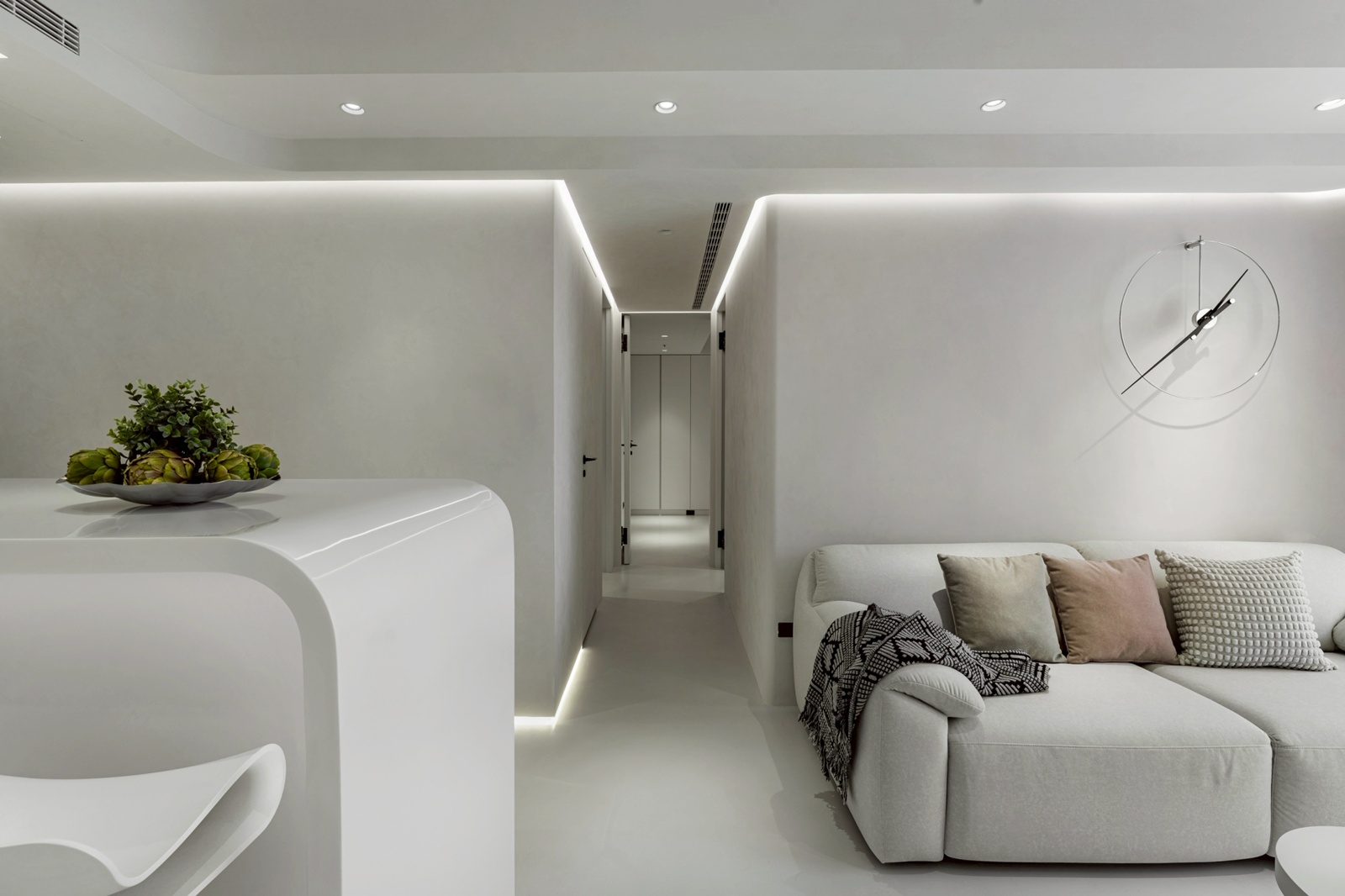 進入玄關後,動線引導至客廳與開放式餐廚區,整體以圓弧與線性元素串聯。客廳區域透過圓潤的天花與壁面設計,帶出寧靜舒適的氛圍。光帶沿結構轉角與壁面細膩佈局,提供多層次照明,呈現豐富的光影變化,並強化空間的立體層次。餐廚區域延續客廳相同的簡約色調,中島與廚具的配置除考量使用效率,也與周圍流線型設計相呼應,在視覺上保持一體性。臥室則延續主調,透過細節處的曲面處理與柔和照明,形塑出祥和的休憩環境,並營造包覆感與隱私性。