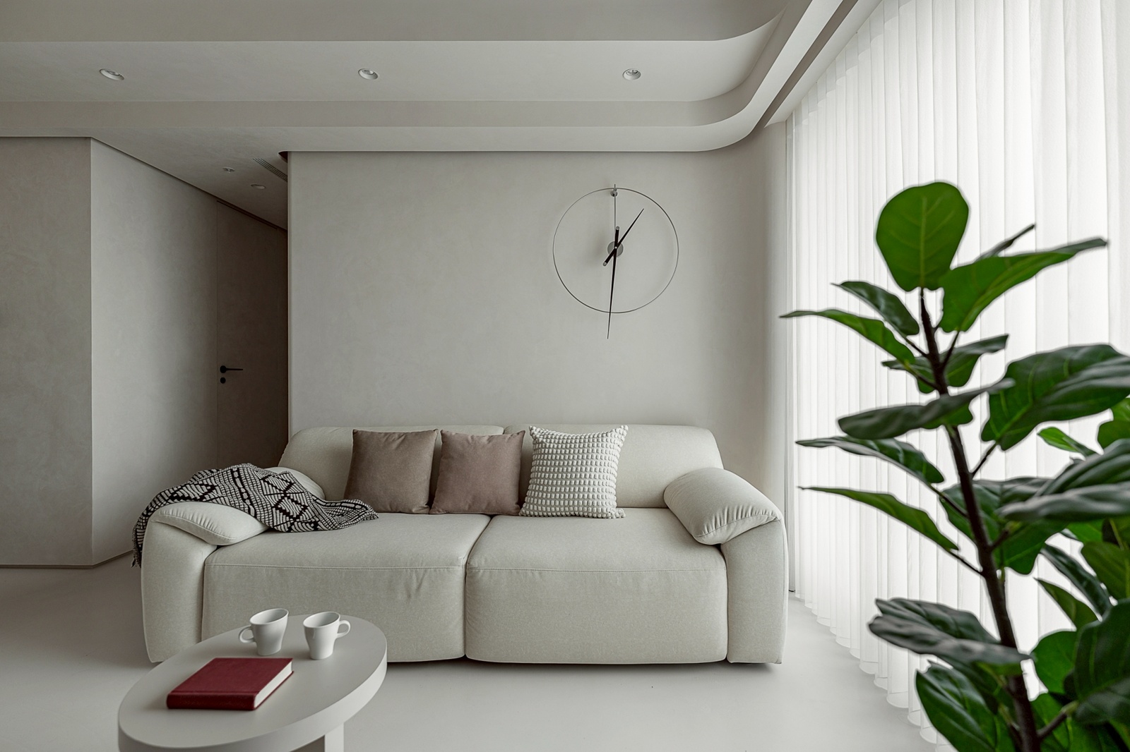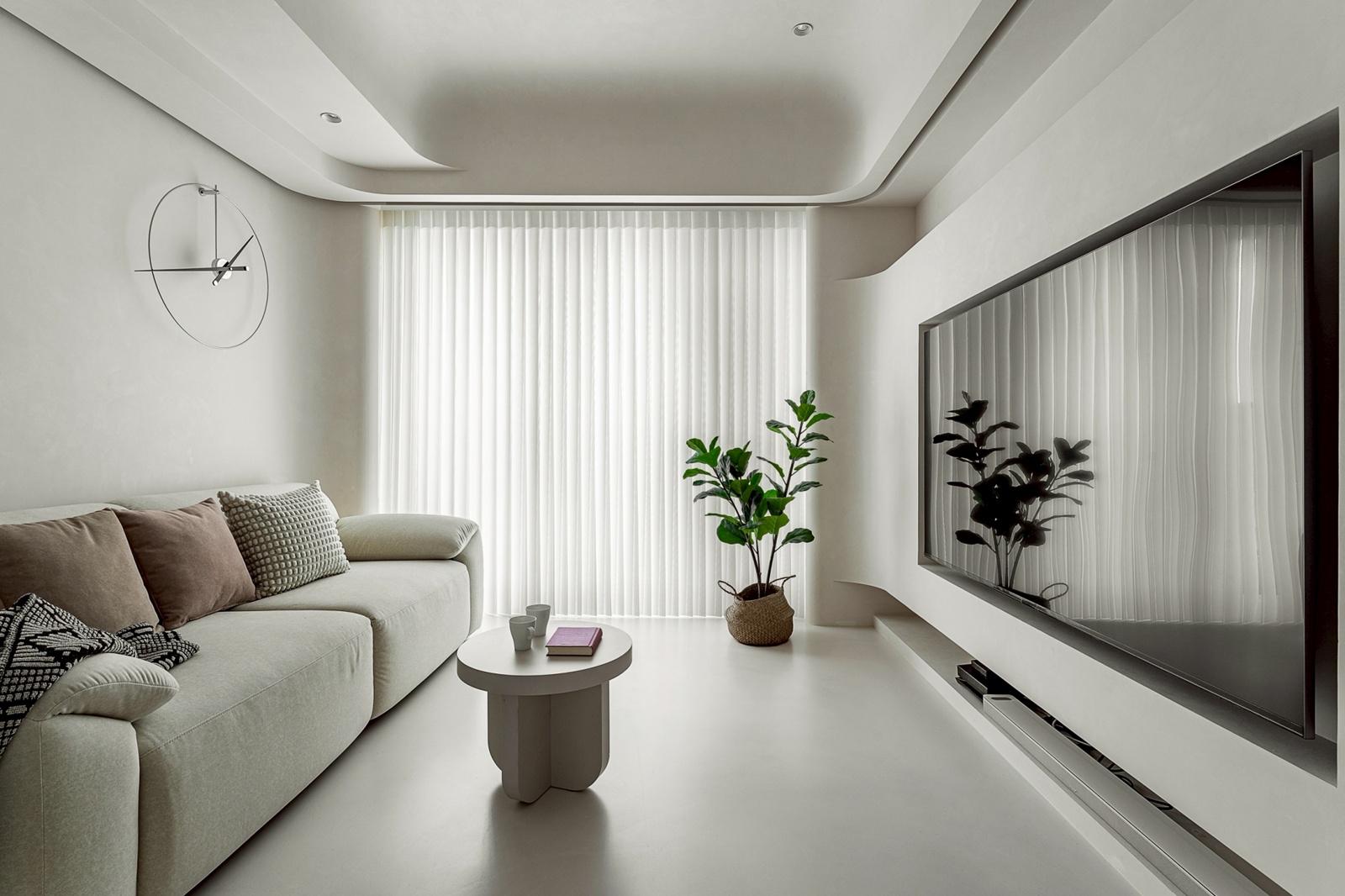 本案為 90 平方公尺的新建住宅設計,設計核心旨在營造和諧且流暢的居住環境。設計手法大量運用具有動態感的線條與曲線語彙,消弭空間的界線感,使場域呈現放鬆且一致的調性。整體以單一色彩系統為基調,自地面、立面延伸至天花,建構出視覺上的連續性與安定感,展現溫潤且富於流動的美感。
