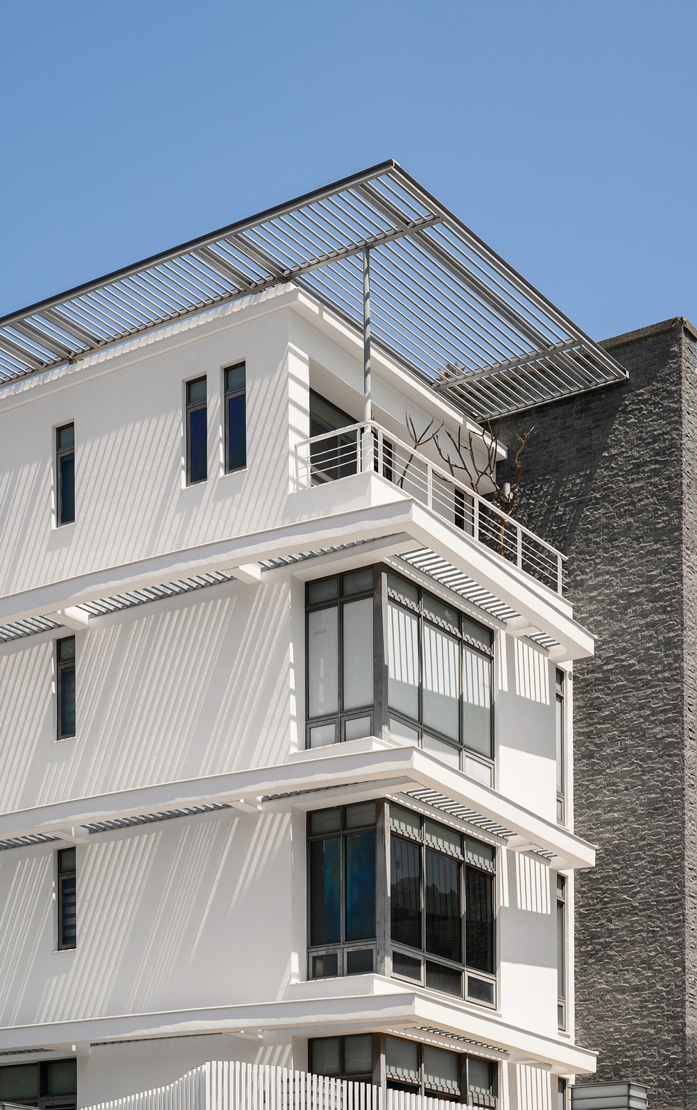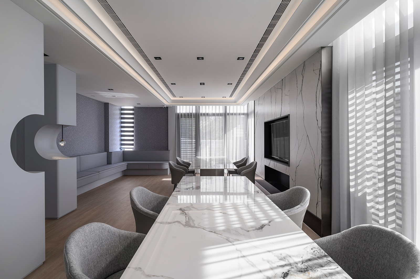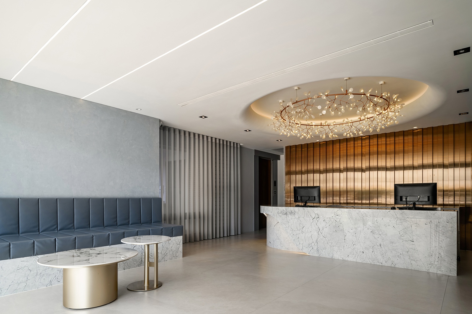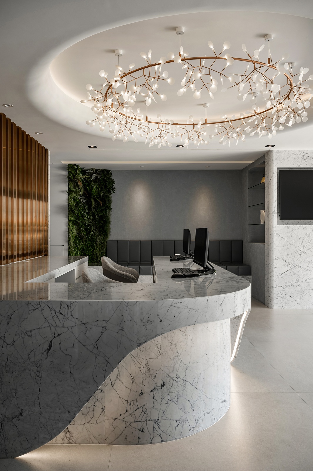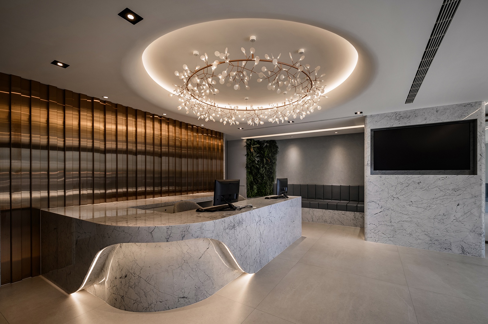 診所外觀採用白色波浪狀格柵,與內部流線語彙相呼應,創造內外一致且無壓的空間感受。接待大廳以玫瑰金鍍鈦飾板為主牆,搭配圓形天花及花瓣吊燈,營造柔和氛圍。接待櫃台選用小雕刻白大理石,導圓角處理減少了尖銳邊角,為患者提供安心無壓的互動介面。等候區的灰藍色沙發與綠意植栽牆面,勾勒出寧靜舒適的環境。推開金屬玻璃滑門進入藥局,延續與接待區相同的設計調性,加上錯落有致的木質系統櫃及蜿蜒的弧形燈帶引導動線,延伸空間視野。地下一樓的診療區結合鐵件、灰玻與易於清潔的美耐板,維持專業性同時創造舒緩氛圍。二樓多功能交誼廳運用古典線板、企口板與薄板磚等材質,並以擁抱意象C形端景與圓潤吊燈,象徵溫暖與陪伴的醫病關係。