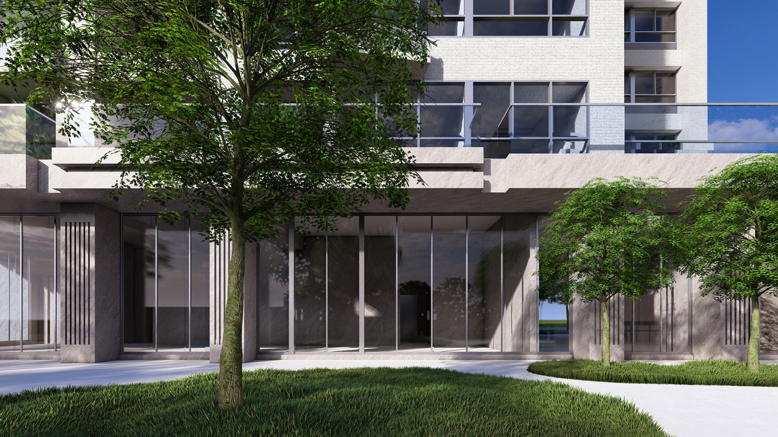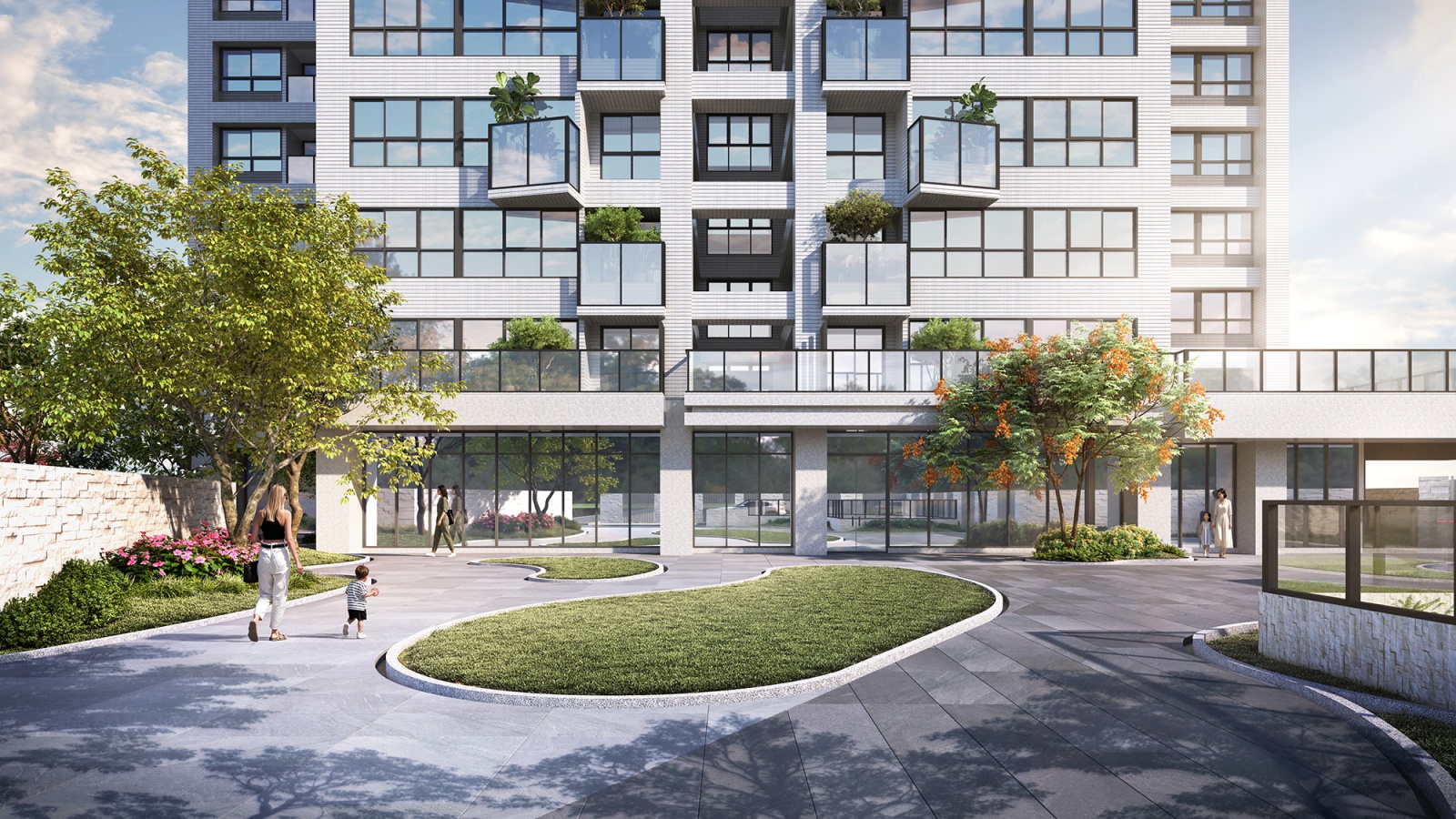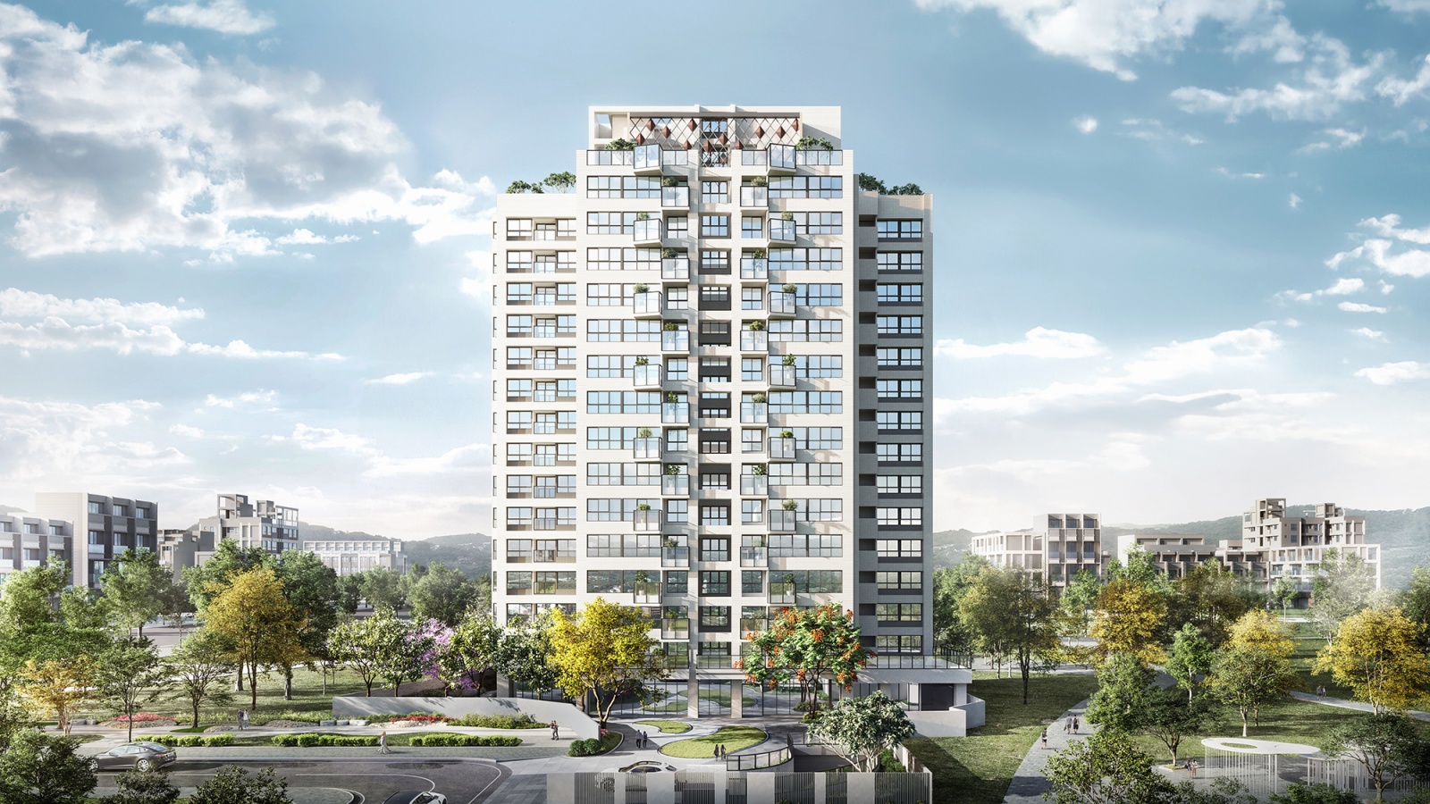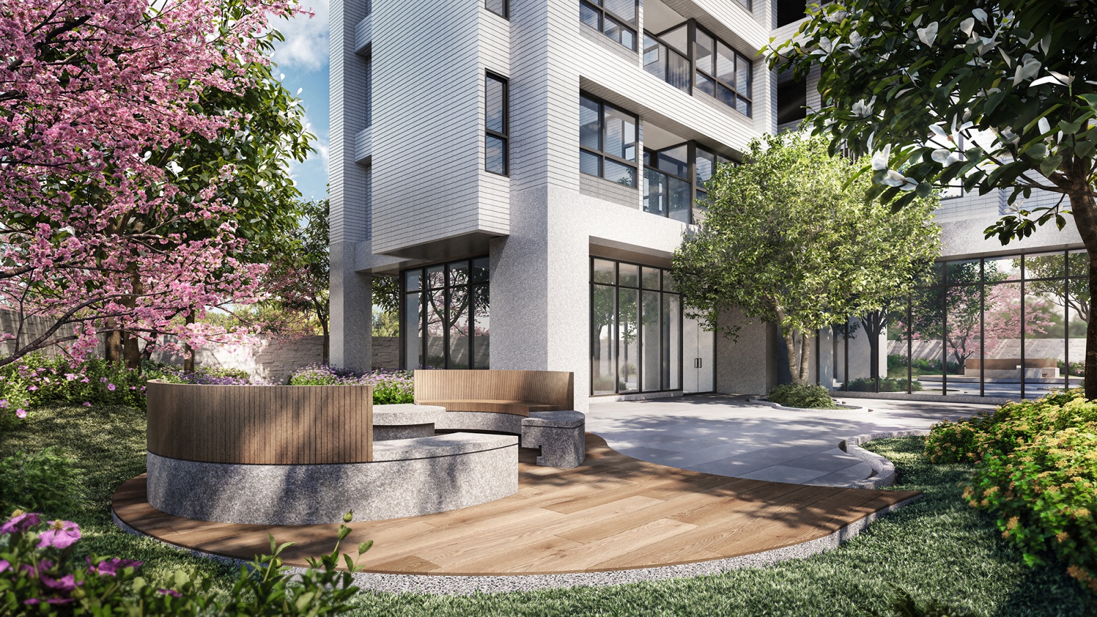 透過環繞式綠化帶與景觀步道系統串聯公共空間與入口廣場,選用台灣原生樹種呼應在地氣候條件,營造四季遞嬗的景觀層次,提供鄰里交流與休憩的生活場域。曲線語彙柔化建築量體與人行界面,建立流暢的空間過渡關係。藉由低臺戶橫開窗擴大採光面積,提升室內明亮度與清透感,回應年輕世代對通透生活型態的期待。