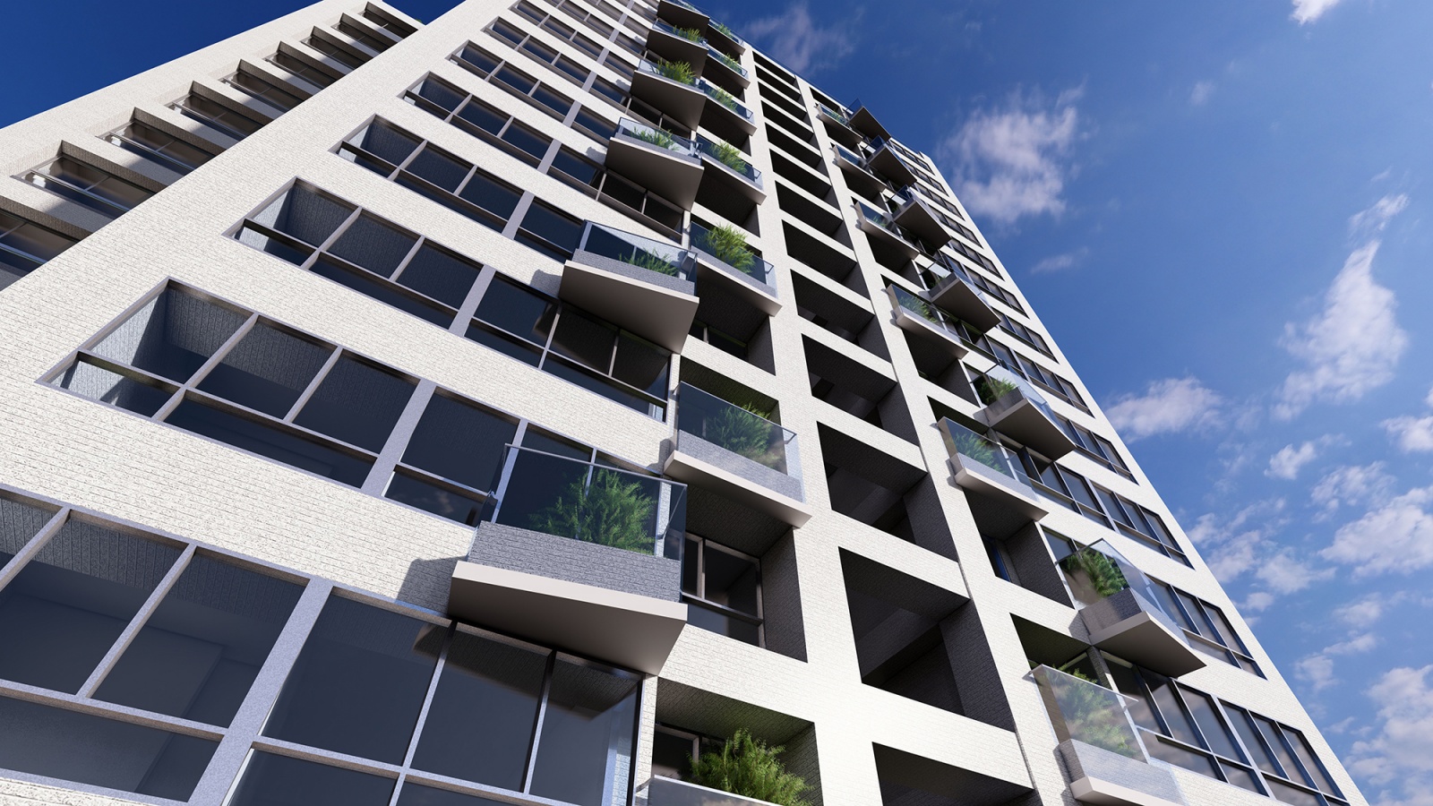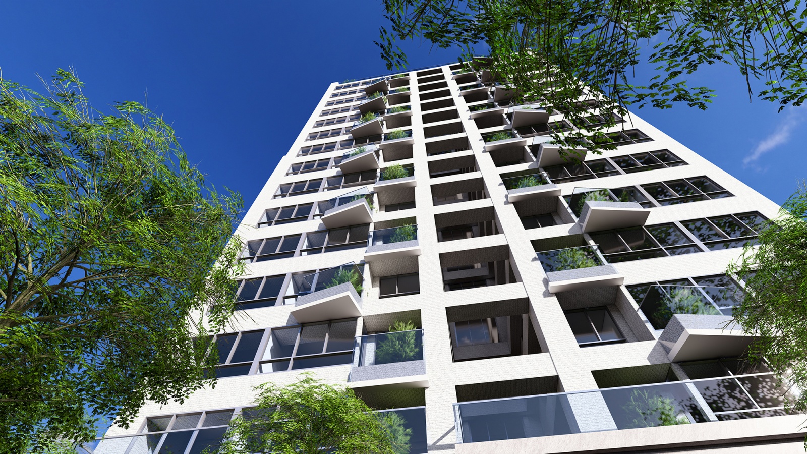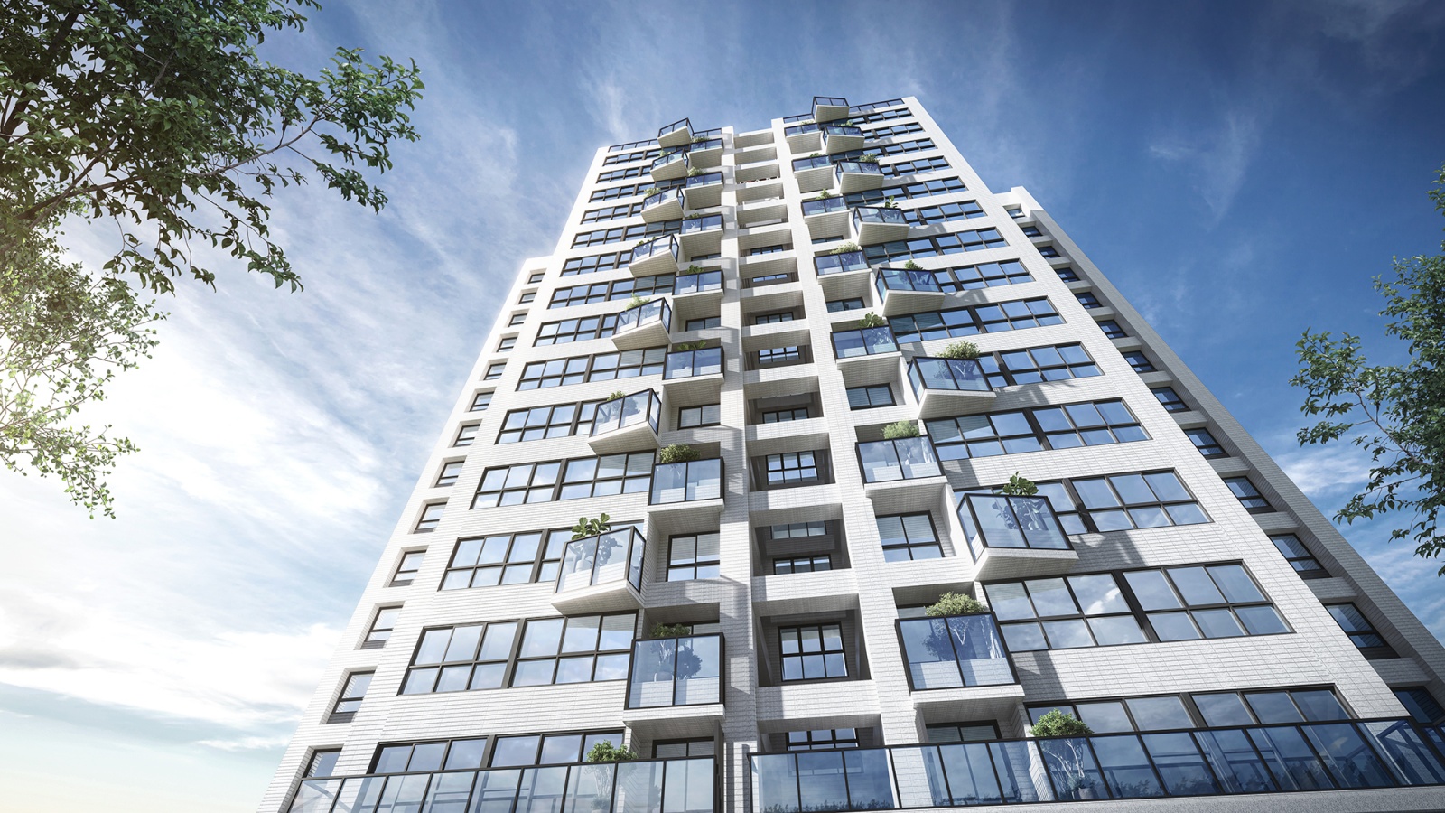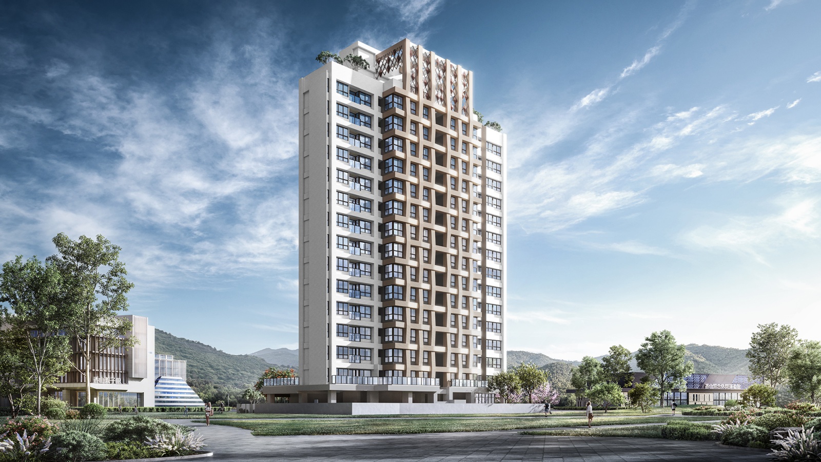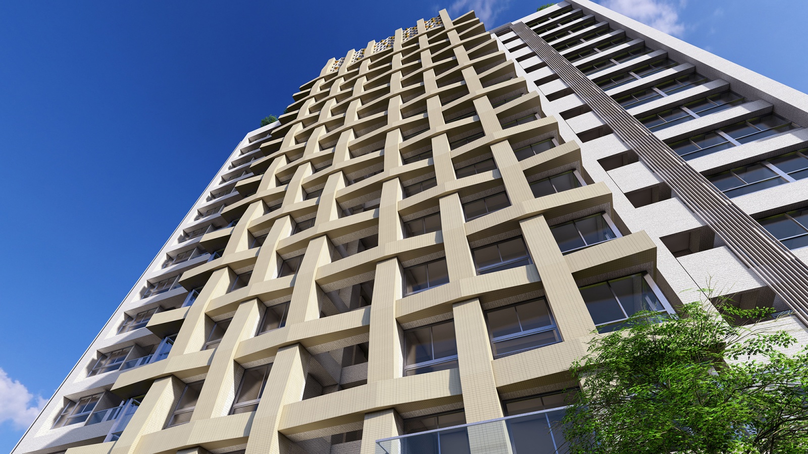建物外觀採取編織式立面設計,透過錯層陽台形塑幾何層次與視覺律動,並達成深窗遮陽效果,有效降低室內熱能吸收。頂部的菱格紋造型藝術,與天空背景交織出強烈的視覺識別感。社區的景觀規劃整合在地生活文化與當代美學。