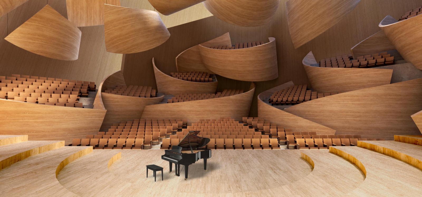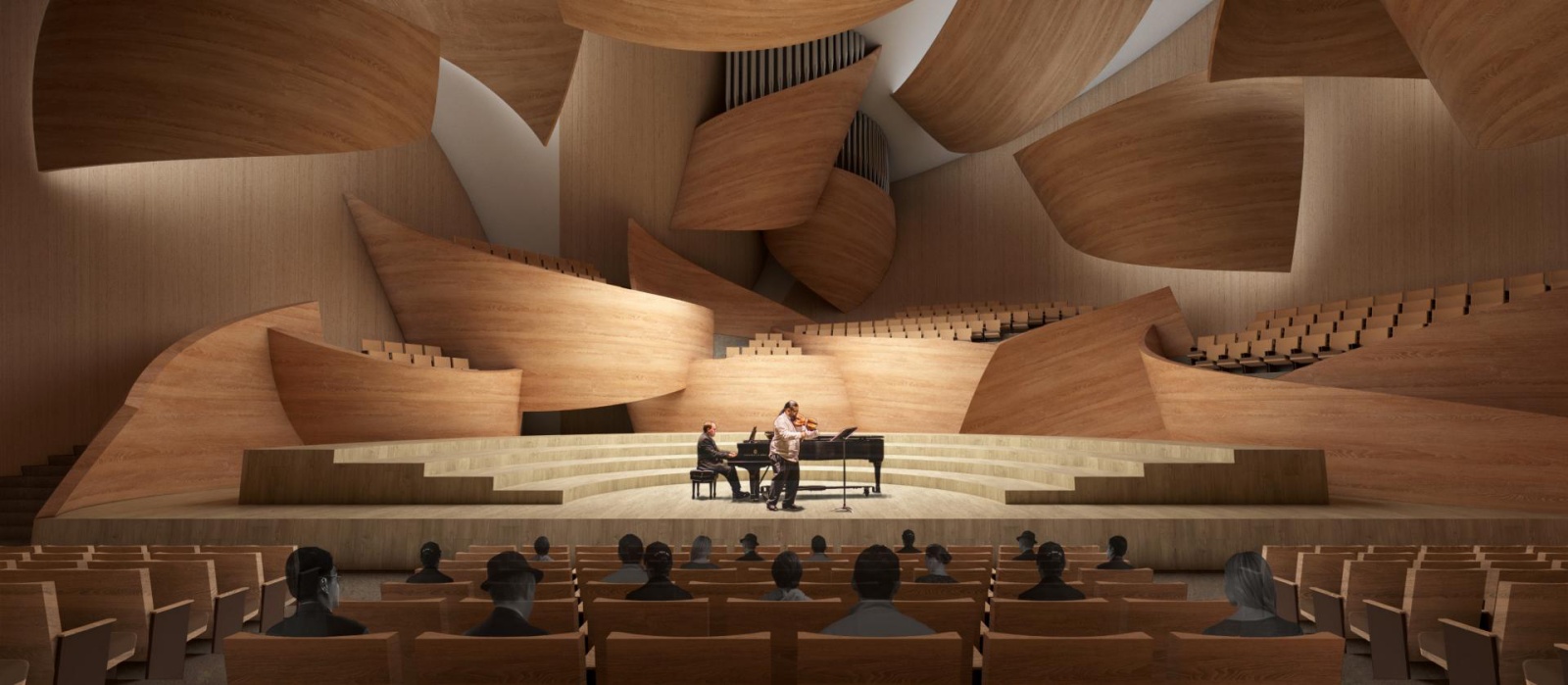建築語彙來自一個簡單卻意涵豐富的原型:一塊因弦線拉緊而彎曲的木頭,象徵著對立元素間的協調與平衡。這個原型被轉化為一系列建築構件的構思,包括牆體、陽台與吸音板等,透過規模與構造的變化,形塑出如同樂章般層層展開的空間節奏與秩序。