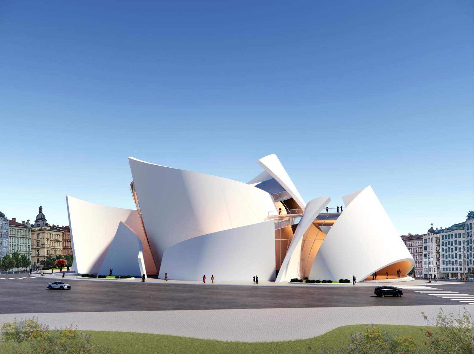 Situated at the confluence of Prague’s historical and modern districts, the concert hall honors its dual heritage. The design thoughtfully integrates with its surroundings, placing programmatic elements to enhance circulation and dialogue with the urban landscape. The juxtaposition of old and new is intentionally dramatic, creating a striking cultural landmark that resonates with the city’s storied past while embracing its vibrant future.