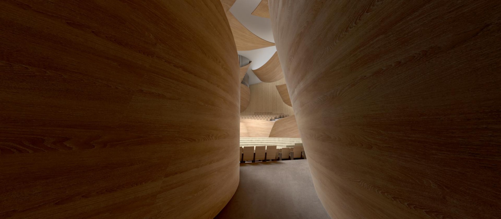 本案在結構與施工技術上面臨高度挑戰,其中最具特色的是懸臂式的曲面牆設計,結合鋼構與交叉層壓木材(CLT),展現出創新與工藝的交融。這種結構不僅確保了建築的穩定性,也為室內空間帶來溫潤質感與聲學回響,使觀者與音樂之間建立起更為直接的感官聯繫。