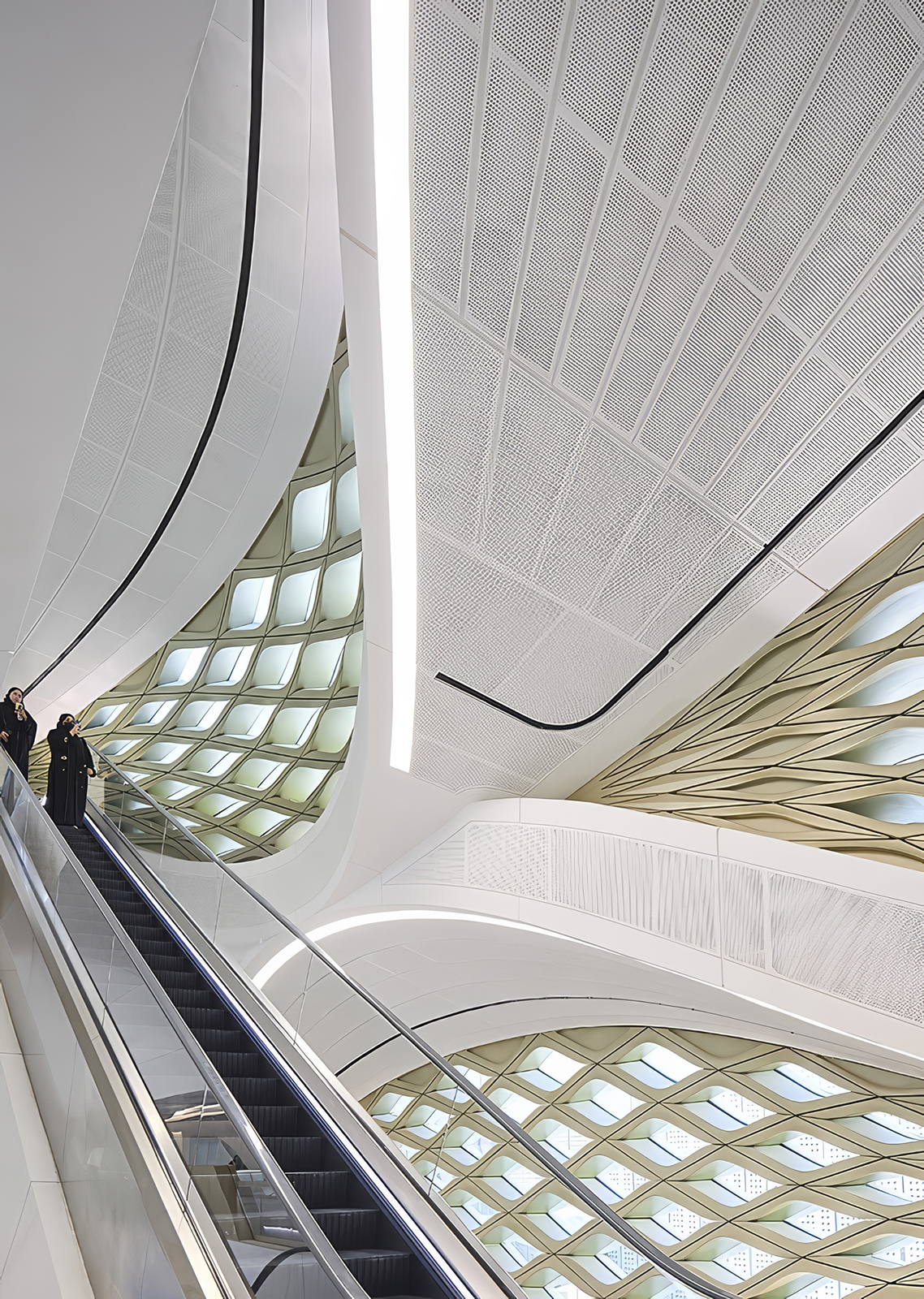 KAFD 地鐵站的設計理念以「連通性」為核心。設計團隊針對預期的行人流量進行模擬與結構性規劃,精準優化內部動線,避免人潮聚集與擁擠。最終建構出以超高性能混凝土板組成的三維網格結構,外立面採用幾何穿孔設計,有效降低太陽輻射,同時呼應當地傳統建築對氣候遮蔽的智慧,以現代手法詮釋地域精神。