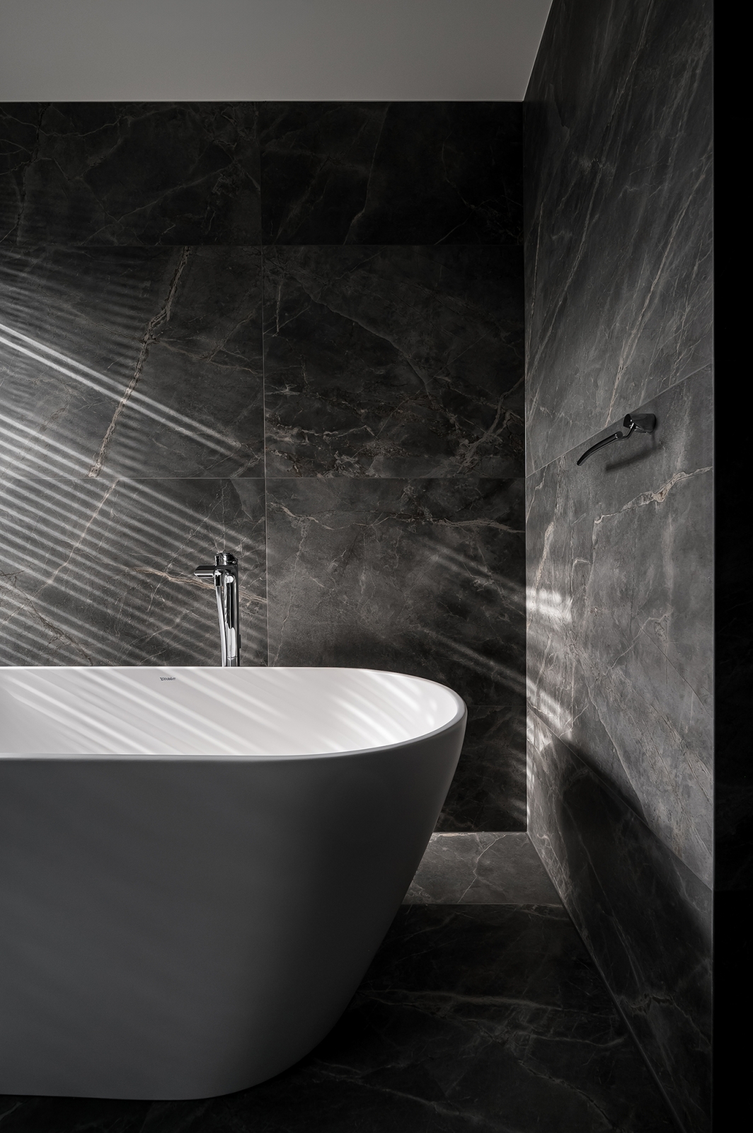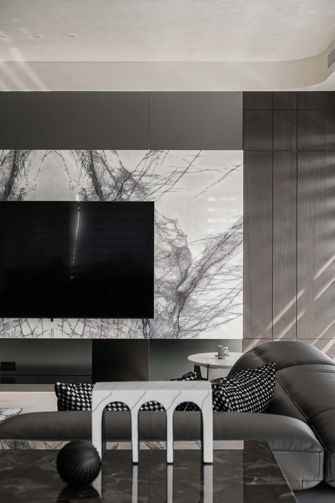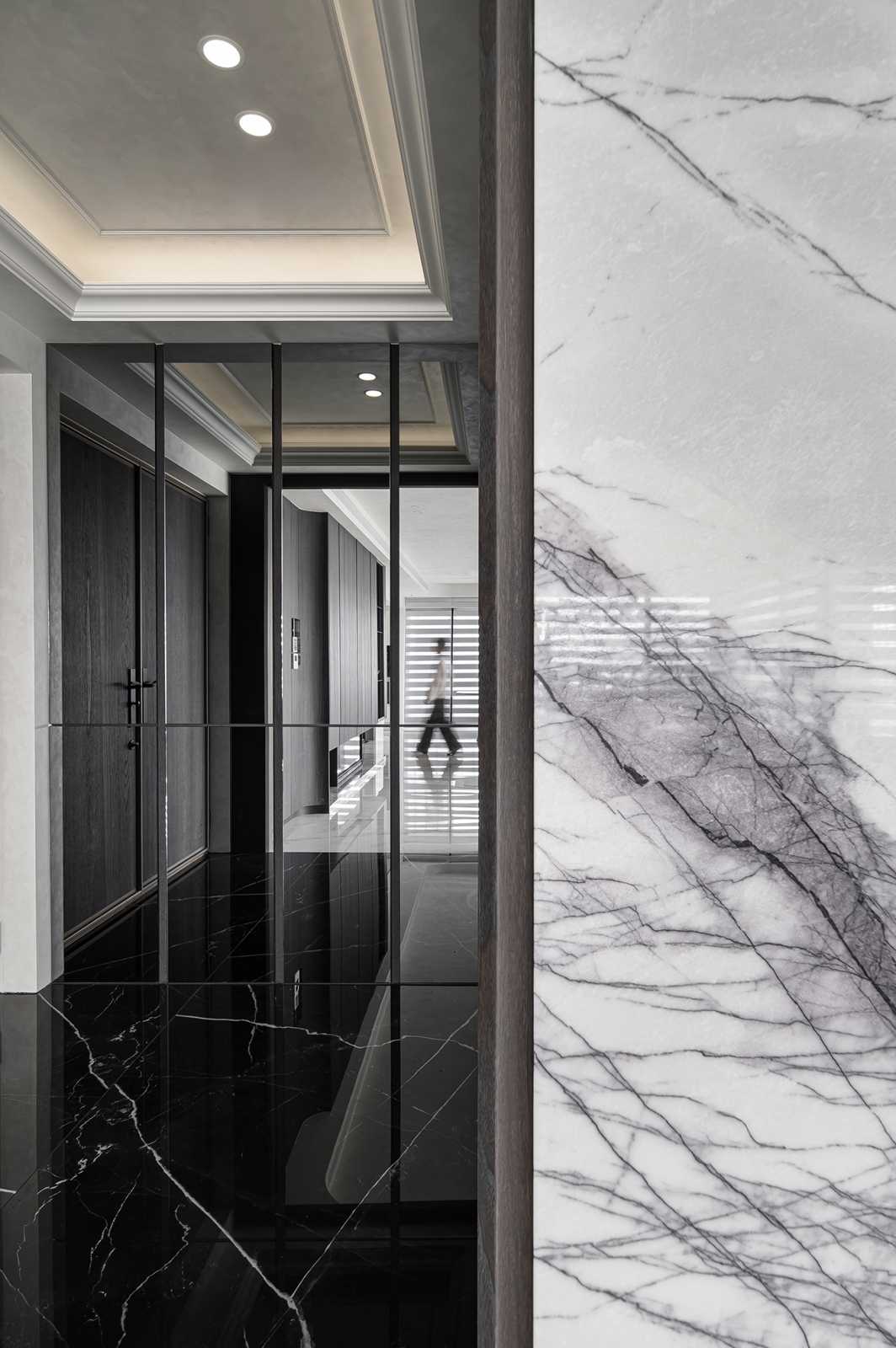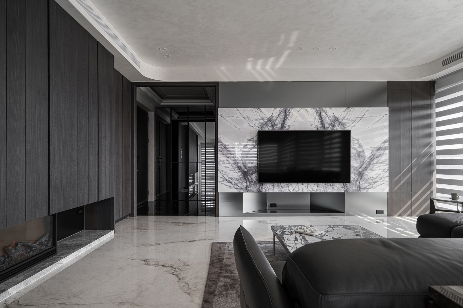 本案為現代輕奢住宅設計,最初是水泥地與裸露管線的毛胚屋。設計團隊以「光影自然流露,勾勒優雅韻律」為起點,依照屋主日常使用情境,逐步描繪出家的輪廓。