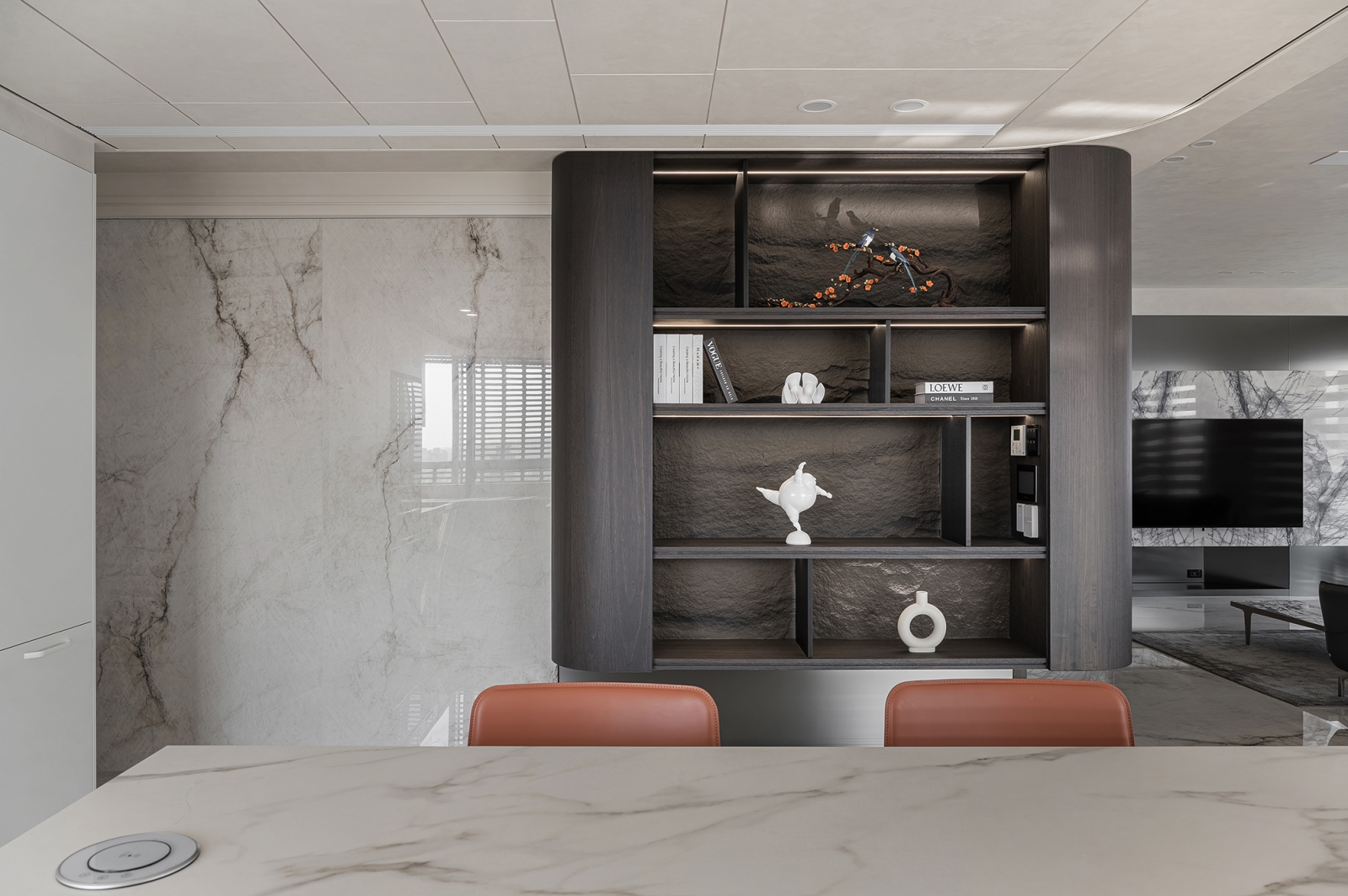 公領域由廚房展開脈絡,動線圍繞開放式中島設計,串聯客廳與餐區,營造如咖啡館般的交流場域。考量家中有學齡前幼童,特別採用導圓角設計,降低碰撞風險,兼顧安全與視覺柔和度。天花層次的變化強化場域間的協調,並在冷暖色調中取得平衡,展現穩重俐落的空間語彙。整體動線流暢,即便是二、三十人的聚會,亦保有舒適的使用體驗。