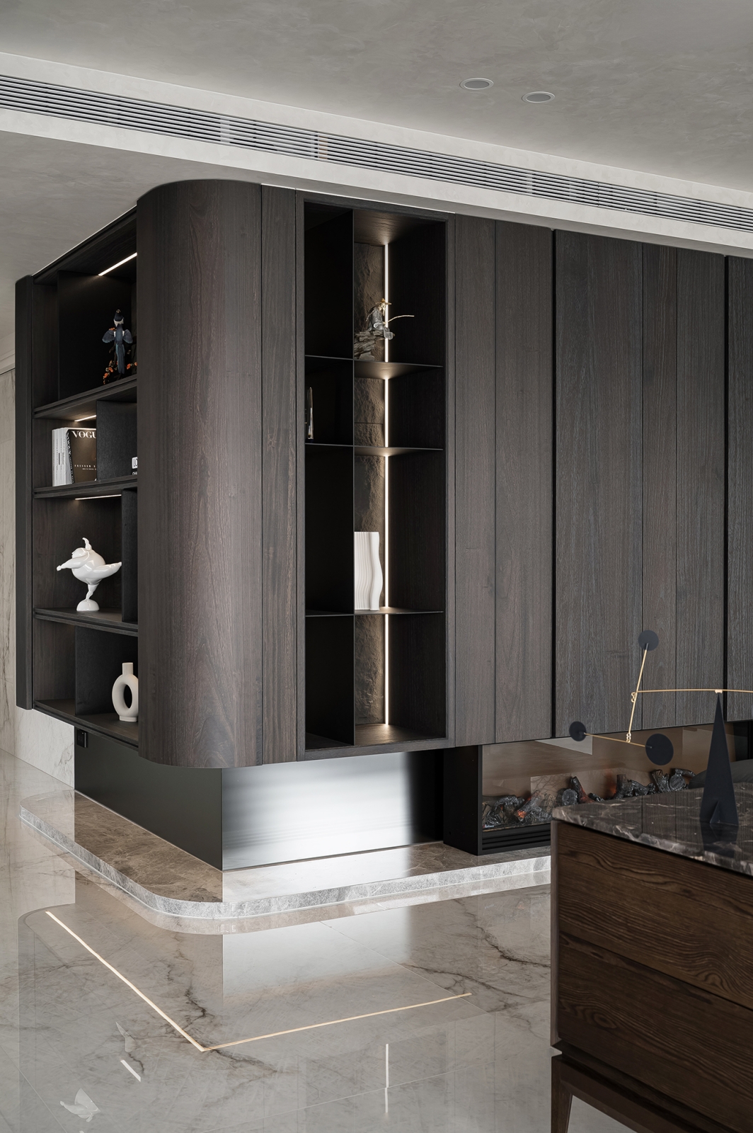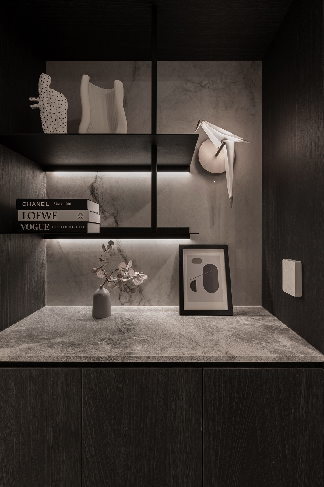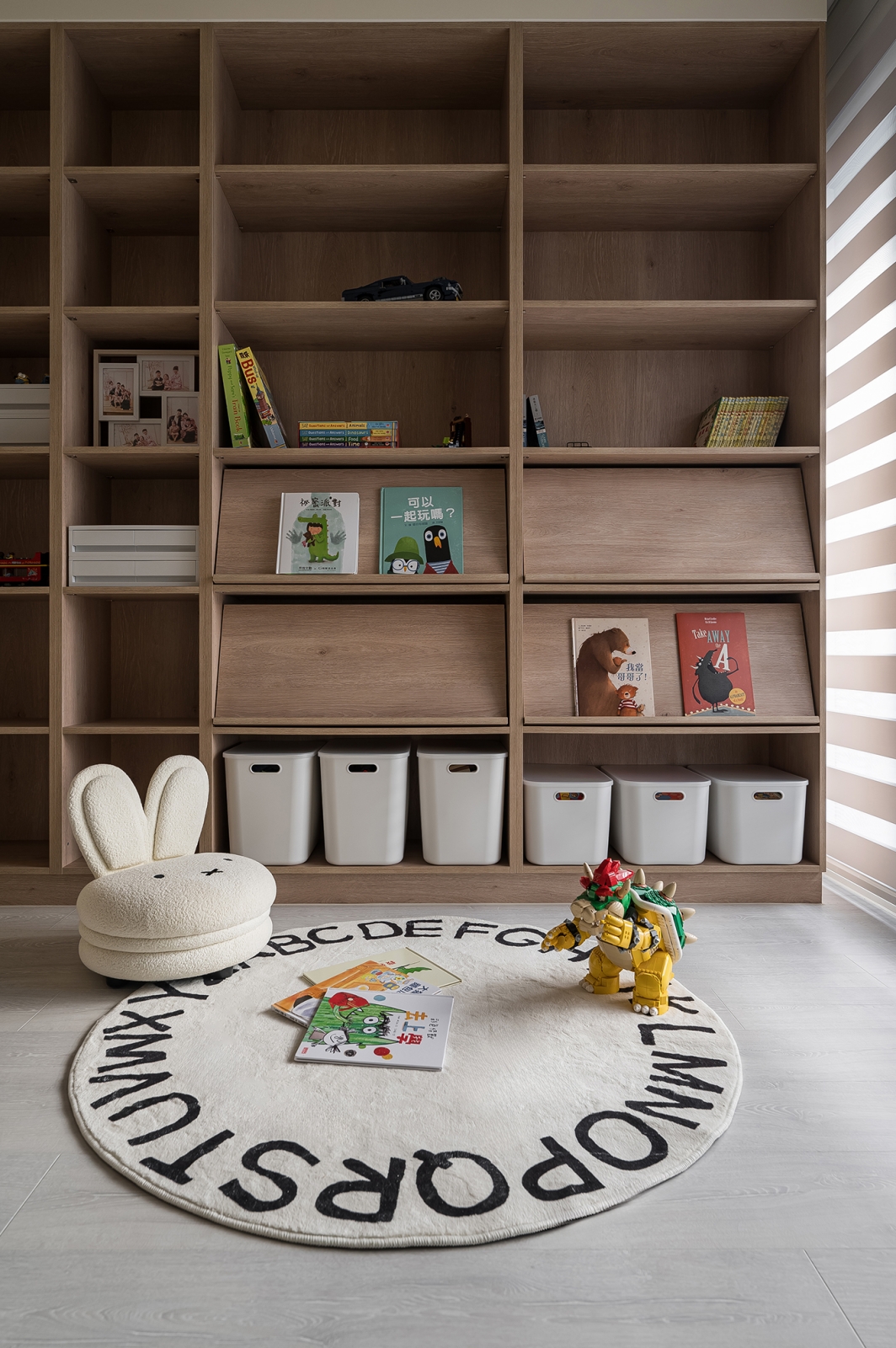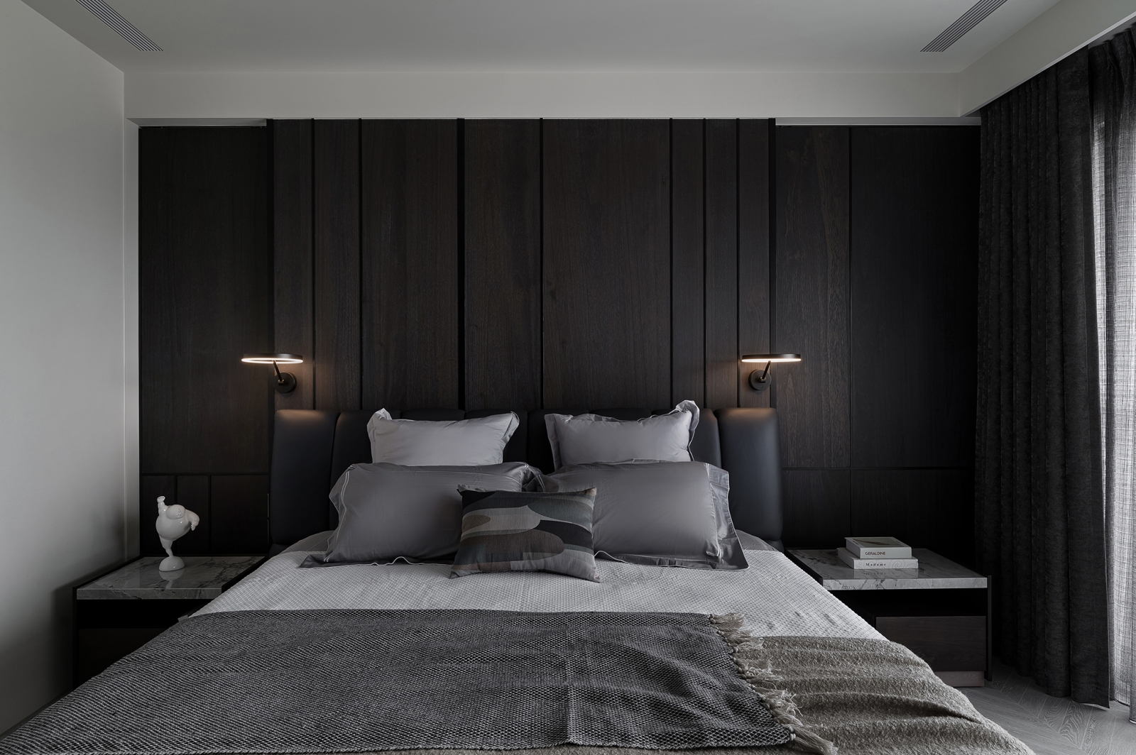 私領域的部分,依家庭成員的性格量身打造,建立各自專屬的理想場域。臥室以深色立面為主牆,結合材質紋理與光影交織,營造靜謐安定的休憩場所。孩童房透過簡潔線條與輕柔配色,形塑自在無拘的成長環境。設計團隊採用隱藏式收納櫃體,使場域保持俐落純粹,並以細節鋪陳出沈穩大器的居家語境。