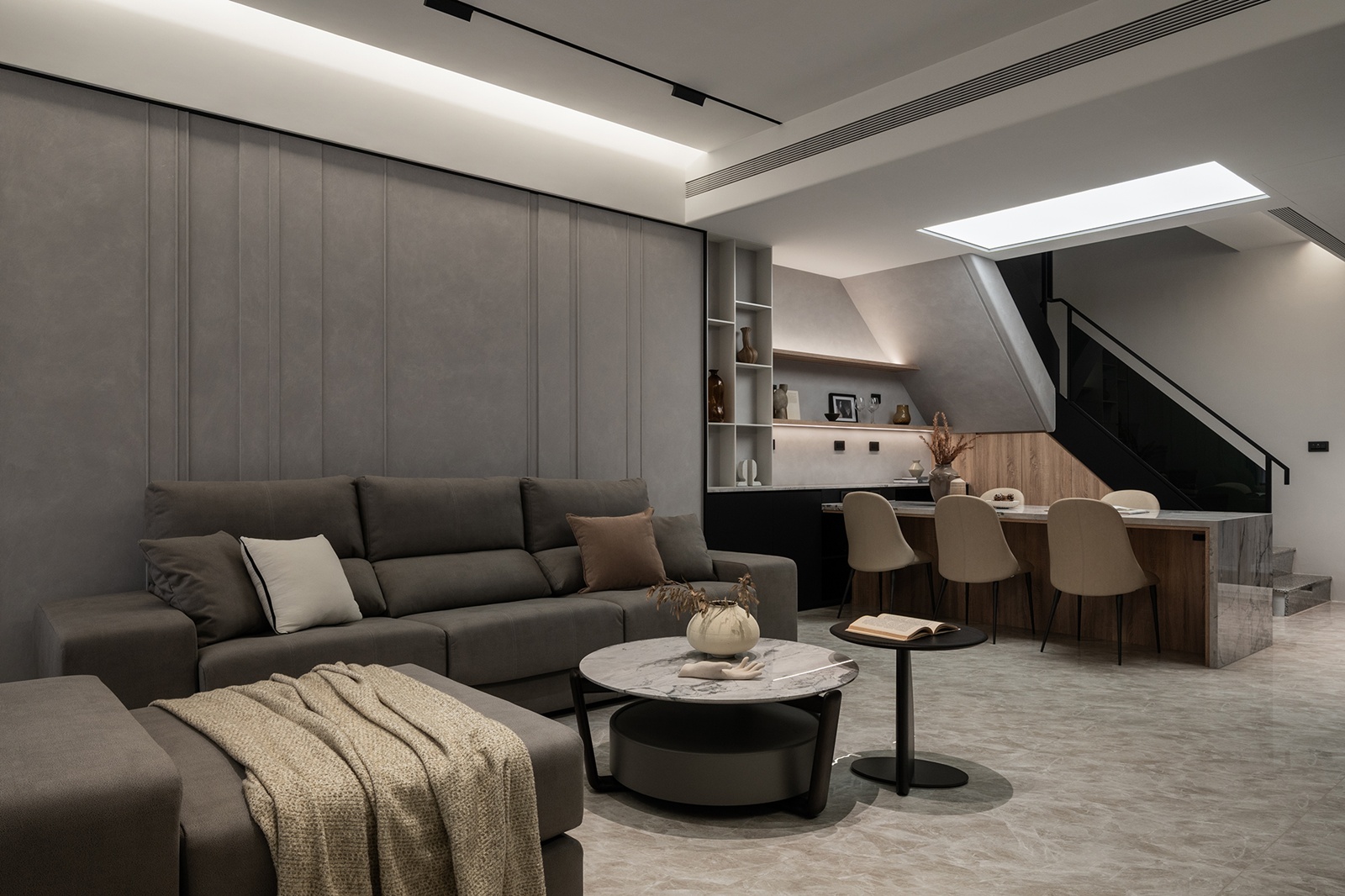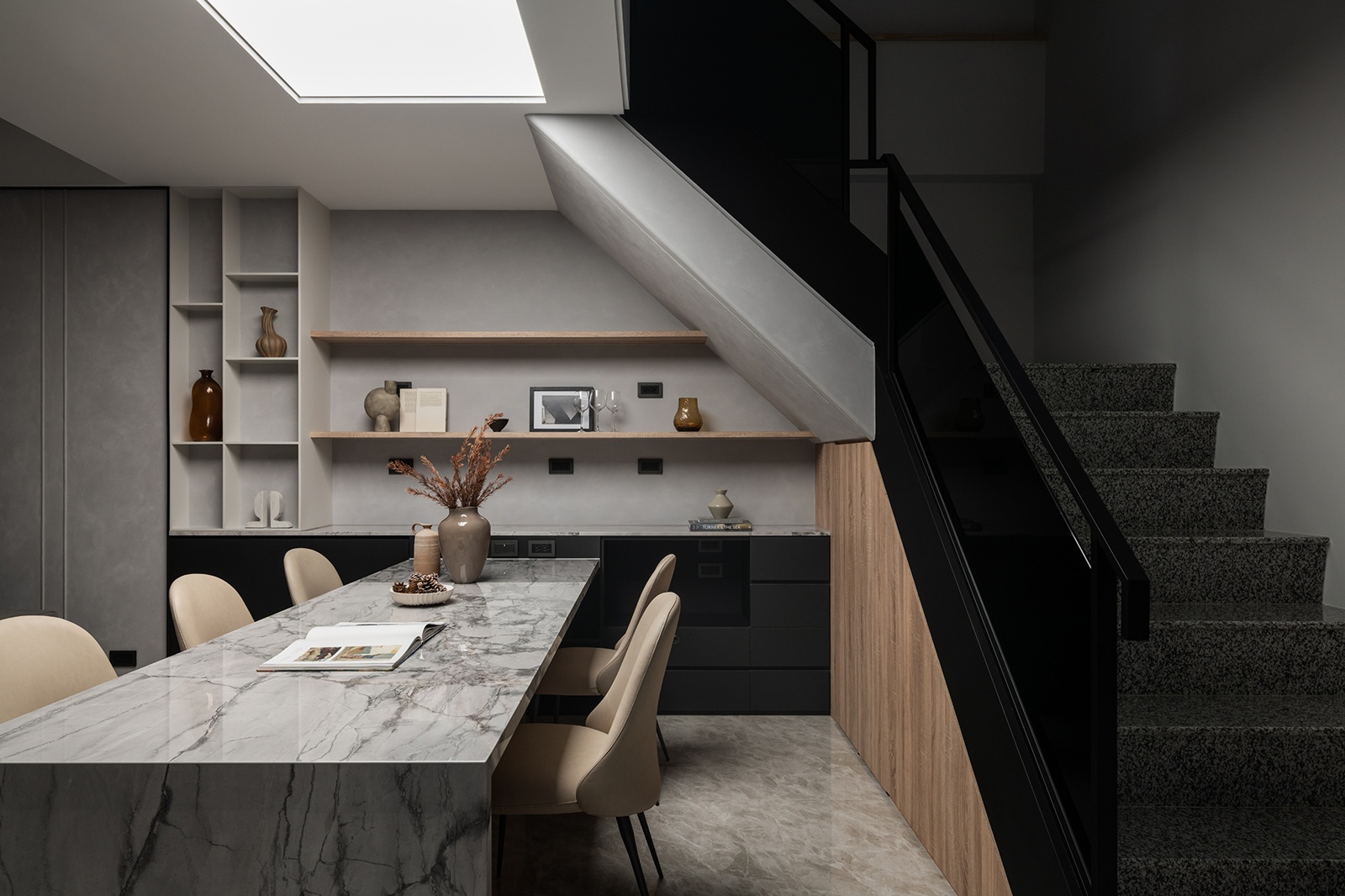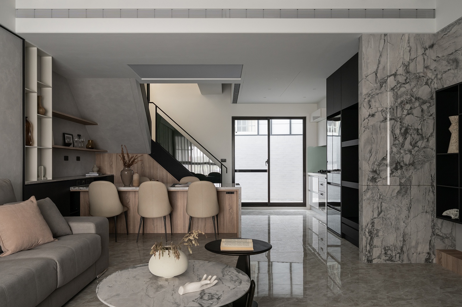 一樓採開放式佈局,將客廳、餐廳、廚房整合為一體,強化開闊通透感。大量運用細緻紋理的石材、灰鏡、木紋與鐵件等材質,搭配低彩度色系,營造沉穩基調。多功能餐桌兼具用餐與工作功用,並將設備收納巧妙整合於邊櫃中,維持環境整潔。