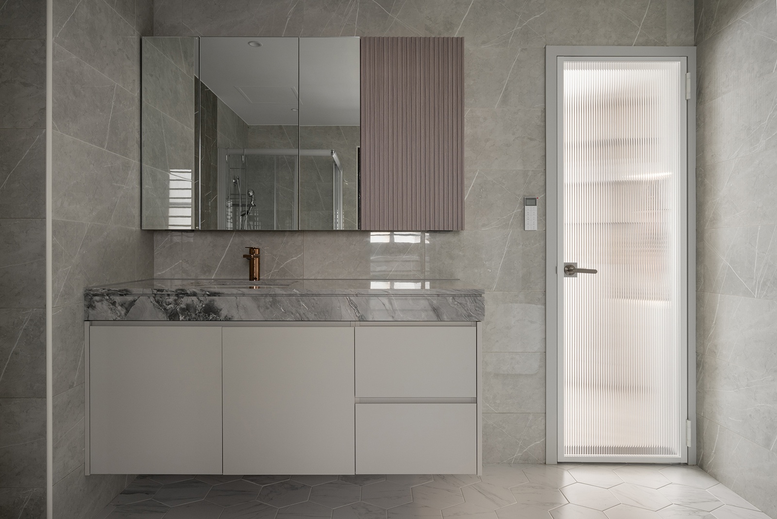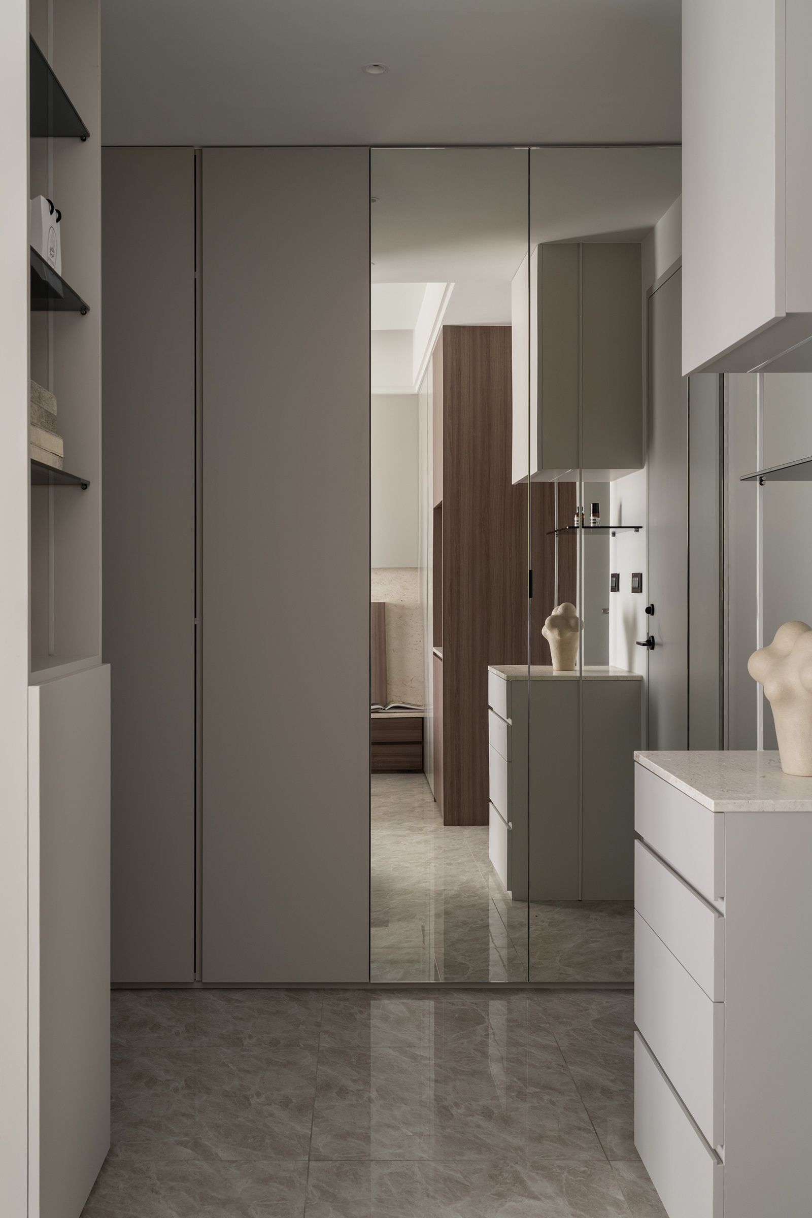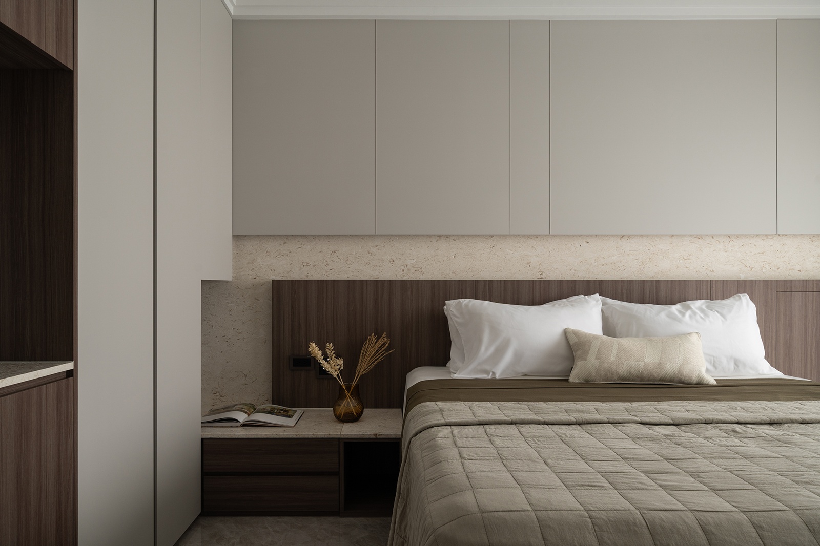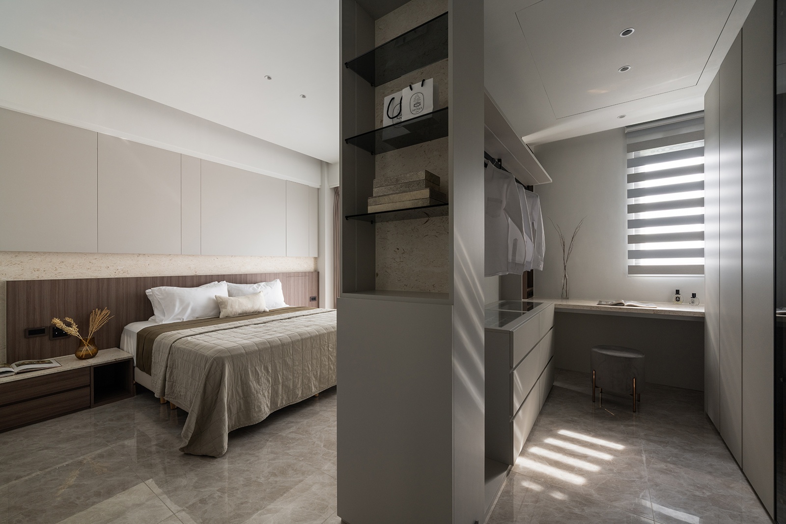 二樓主臥以奶油灰、石材和木紋語彙營造休憩氛圍。床邊櫃採可移動設計,以因應未來育兒需求。更衣室以裝飾牆半開放區隔,促進視線連貫流動。主衛浴透過洗手台轉向設計,在不更動原有硬體下拓展檯面,提升利用效率。