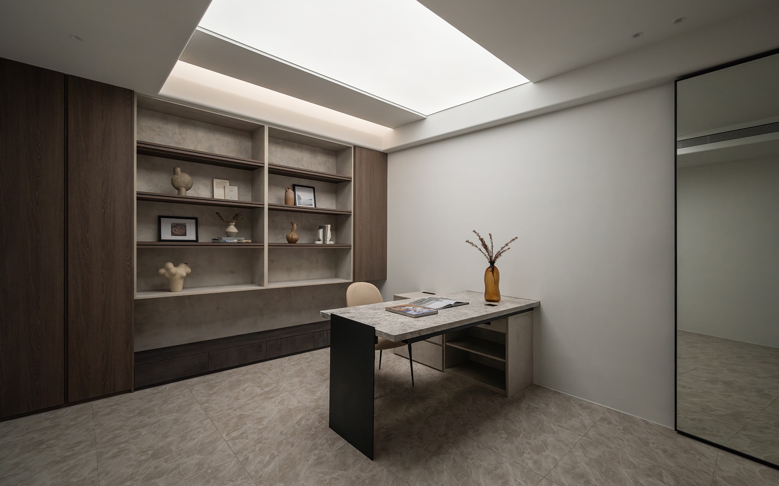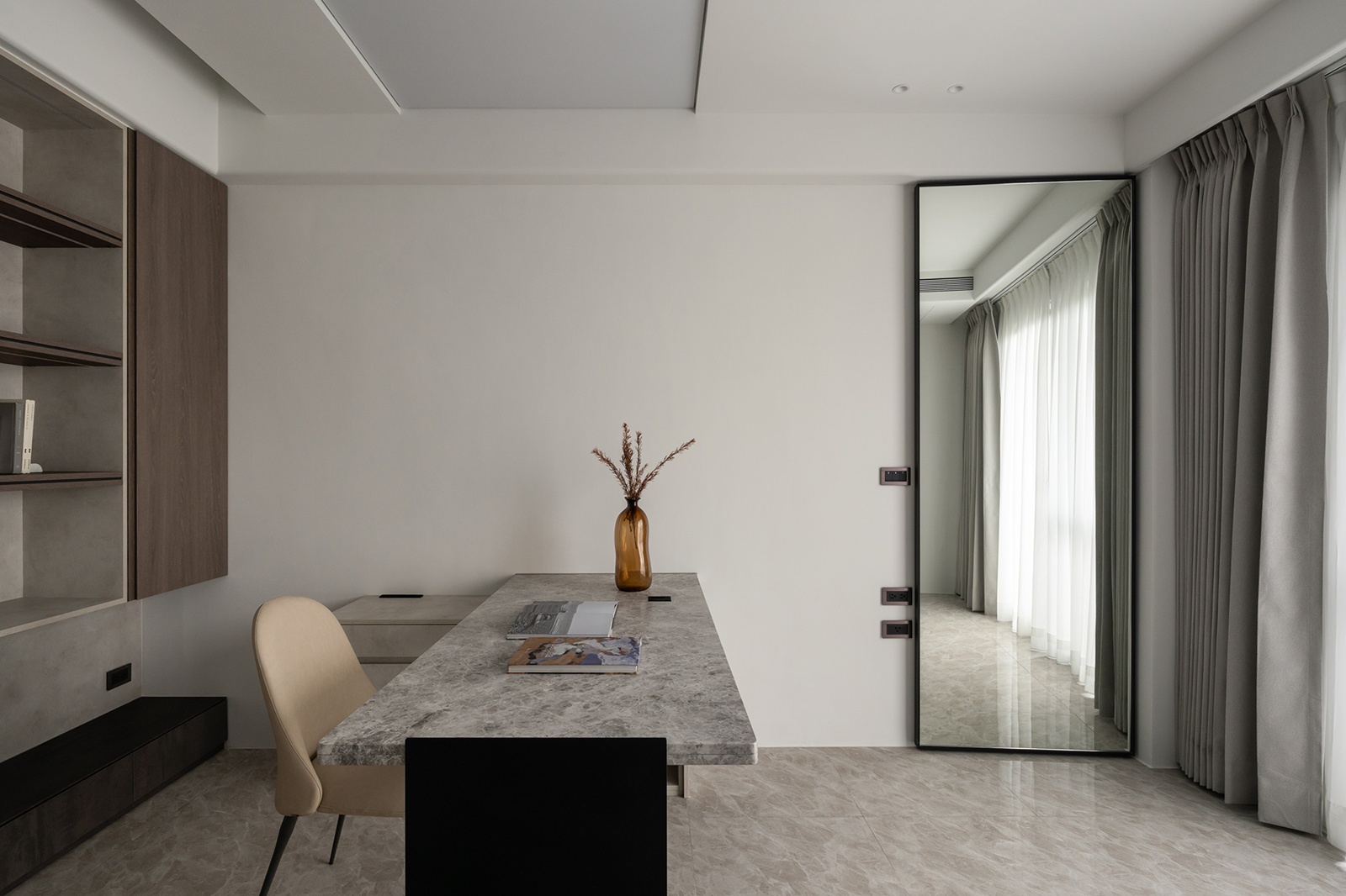 三樓多功能智能書房為主要工作場域,以整面木質書櫃與石材背板形塑主要視覺,兼顧收納與展示;並配置大面石紋桌板與鐵件腳座,穩定視覺重心。照明系統導入無極調光光膜與層板補光燈,其光源強度與色溫可依情境調整。後方牆面則預留RGB燈條與低位光源,提供多元使用彈性。